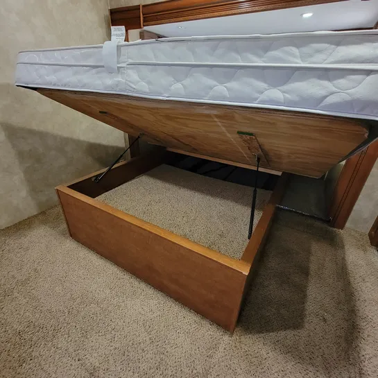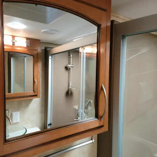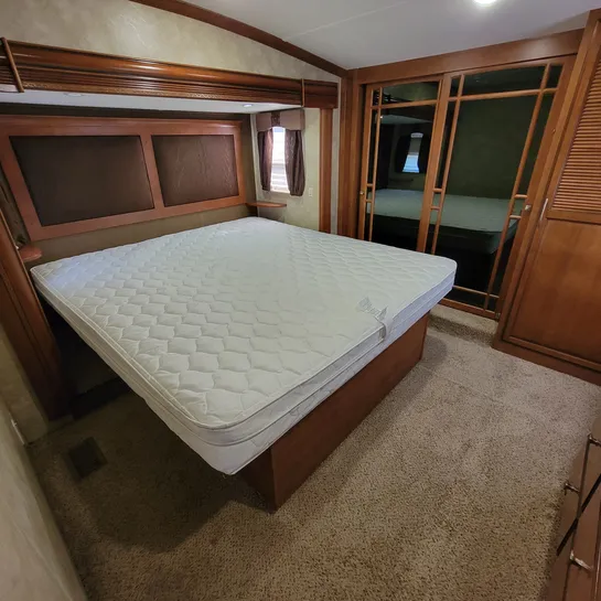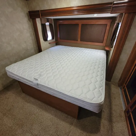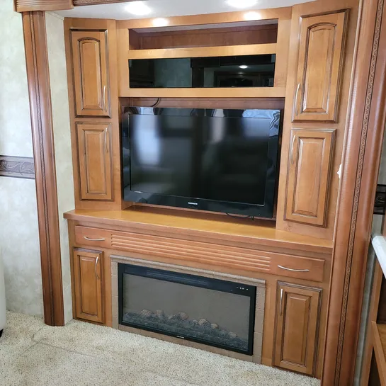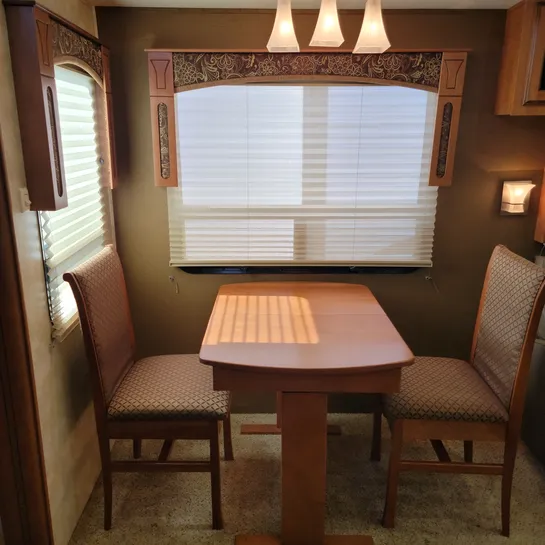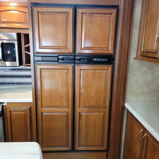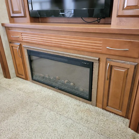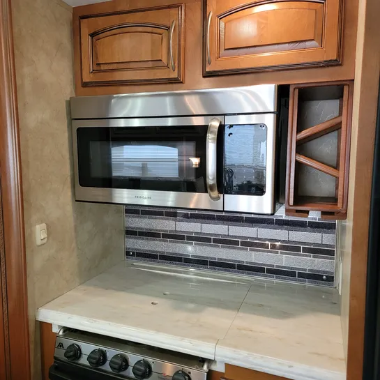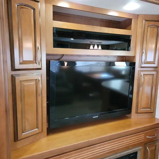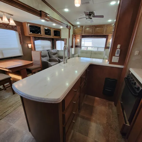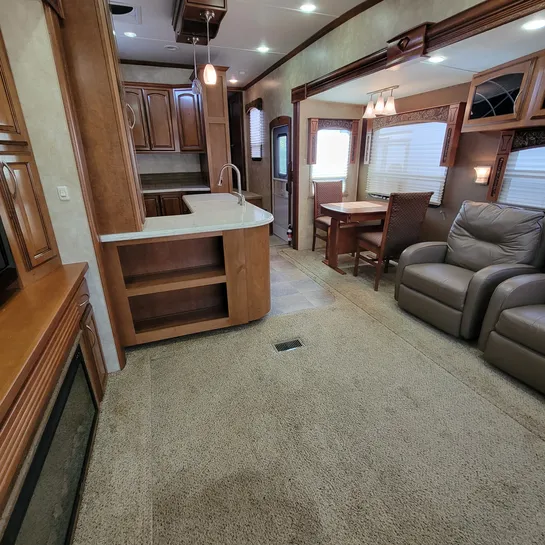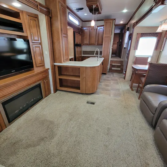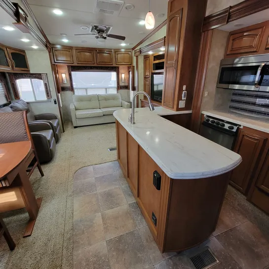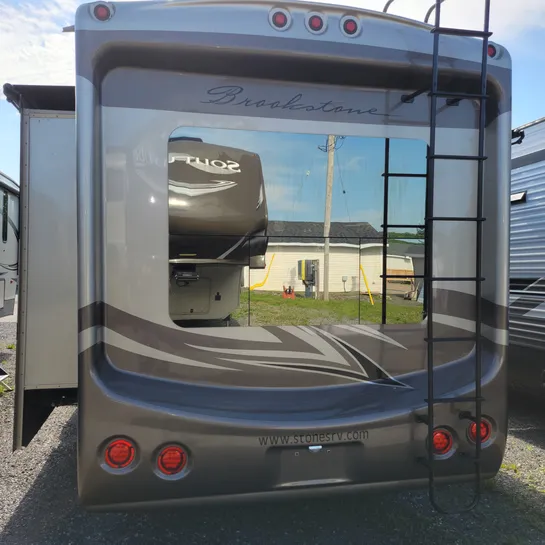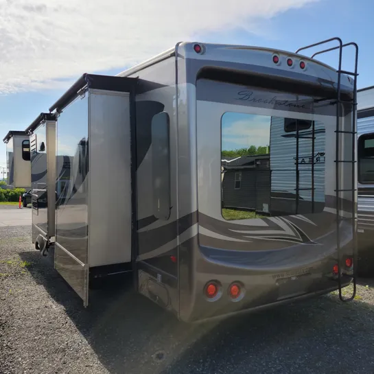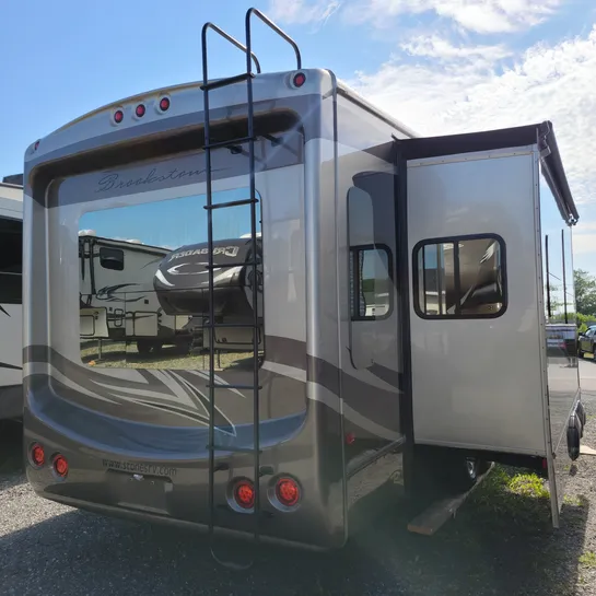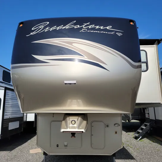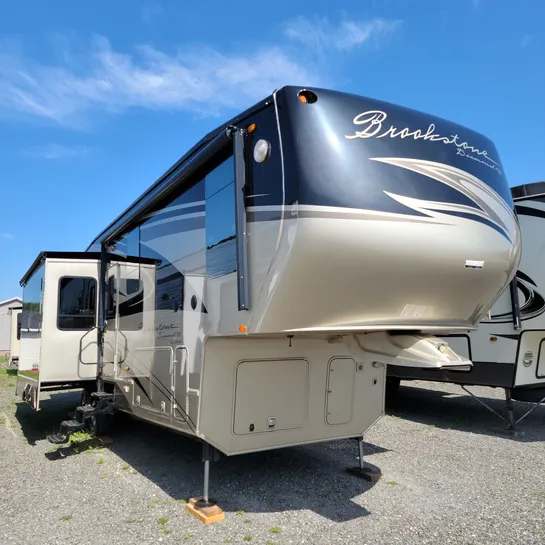 The 2013 Brookstone 367RLD is manufactured by Coachmen by Forest River with a 70-gallon fresh water tank, 90-gallon gray water tank, and 45-gallon black water tank. The interior includes a standard kitchen dinette, a master bedroom, a shower, a television, and a DVD player. Exterior features include a patio awning, front and rear power leveling jacks, and it’s equipped with a washer/dryer.