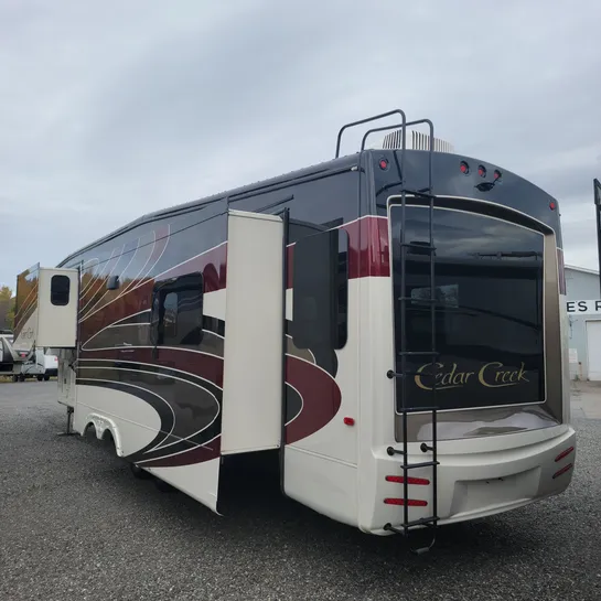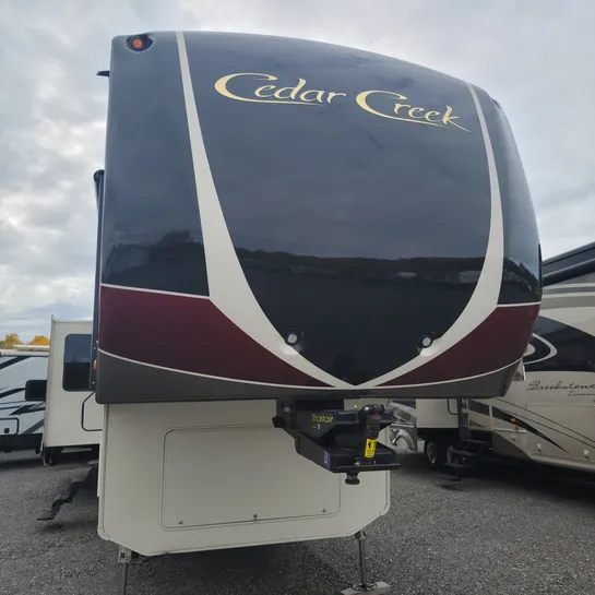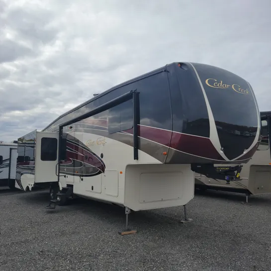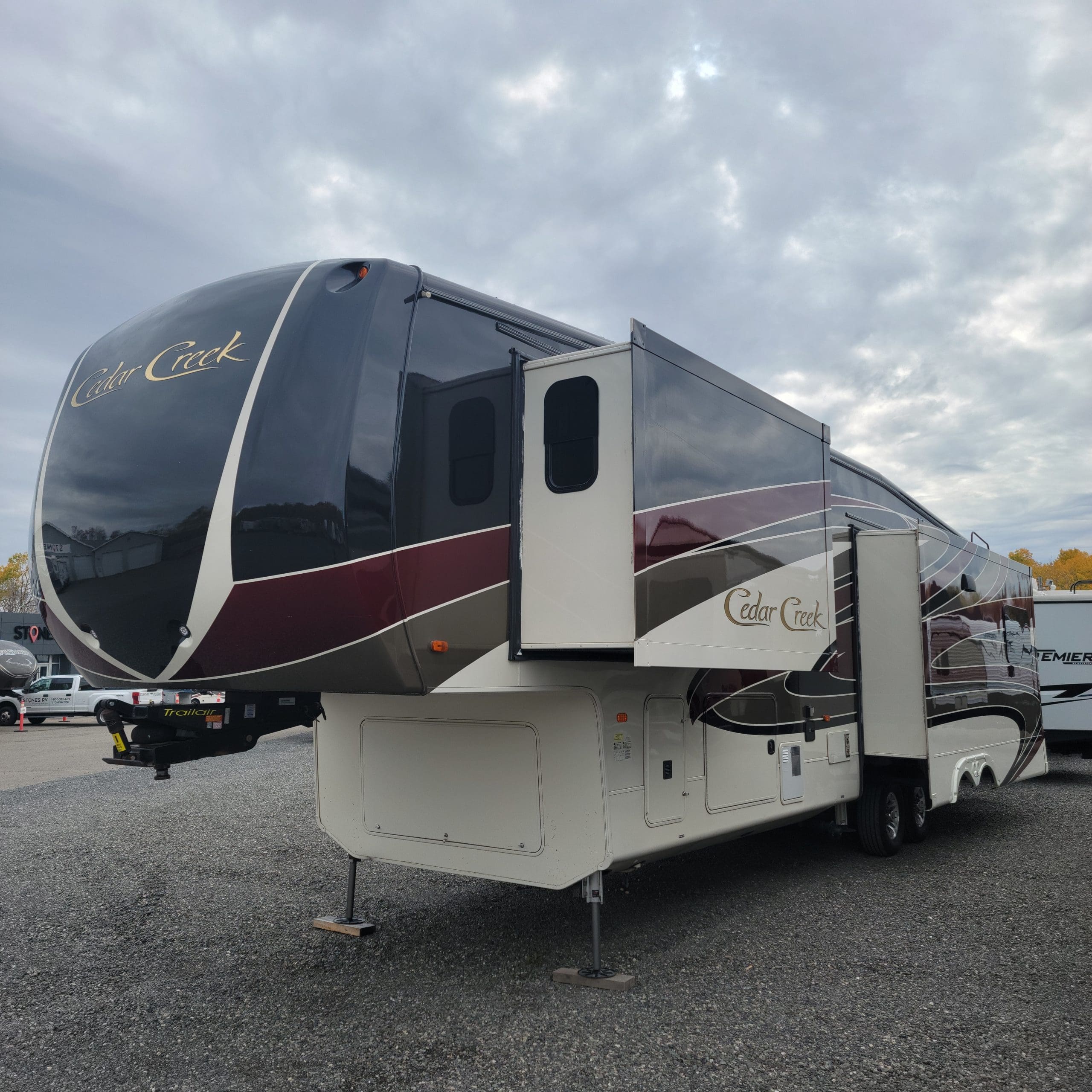 Experience luxury RV living at its finest with the 2017 Forest River Cedar Creek 36CKTS fifth wheel, offering spacious living accommodations with all the comforts of home. This premium fifth wheel is part of Forest River’s prestigious Cedar Creek Hathaway Edition line, known for exceptional craftsmanship and upscale amenities. With its thoughtfully designed floorplan featuring a rear living layout, this model maximizes space and comfort for extended travel or full-time living.