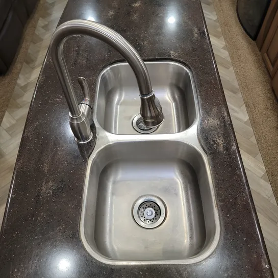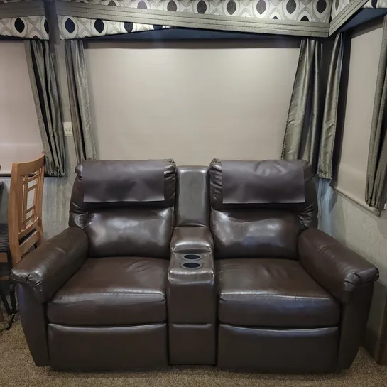 The main living area features two generous slideouts providing exceptional space. Upon entry, the left slideout contains a free-standing dinette with chairs and two lounge chairs. A leather sofa with end tables at each end and overhead cabinets spans the width of the rear wall