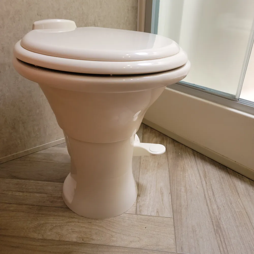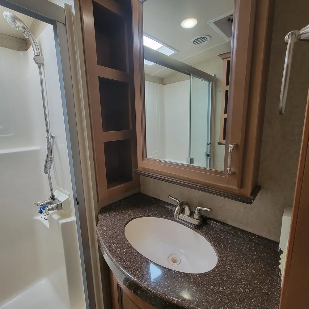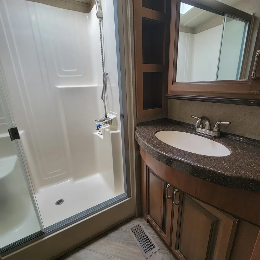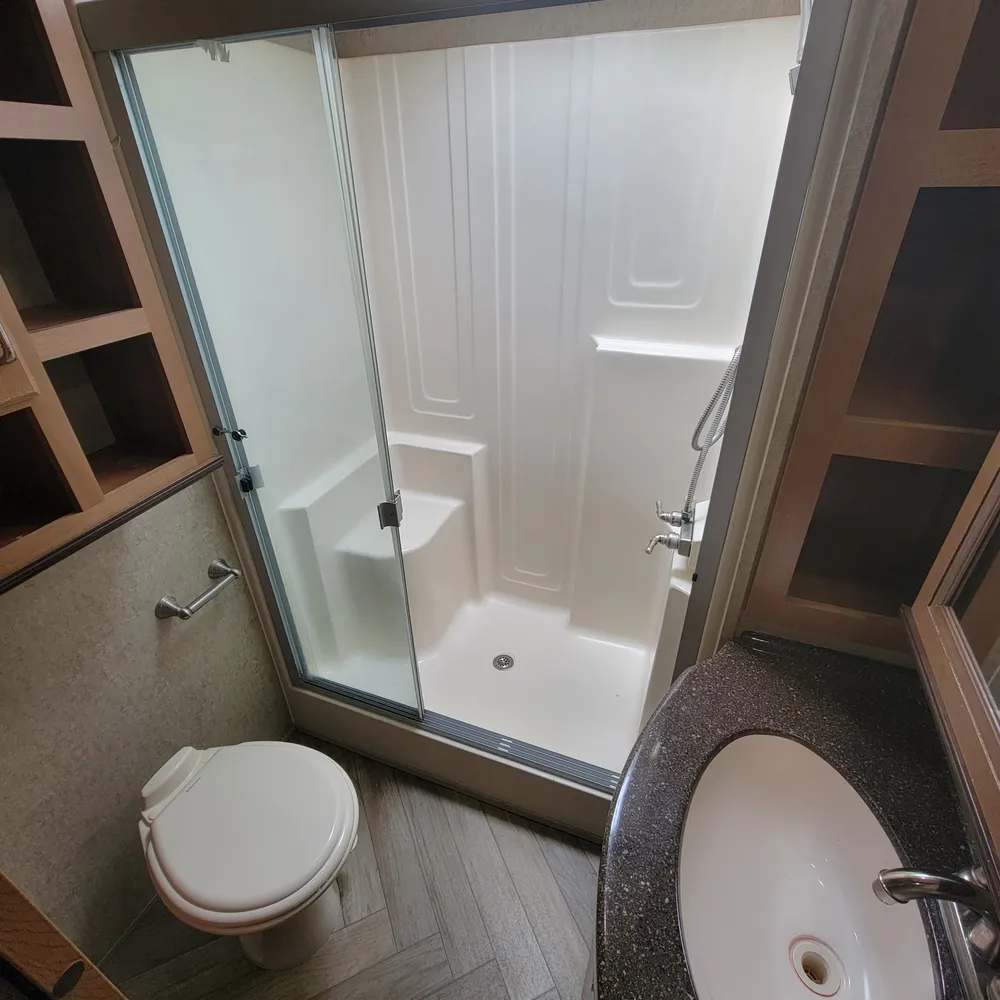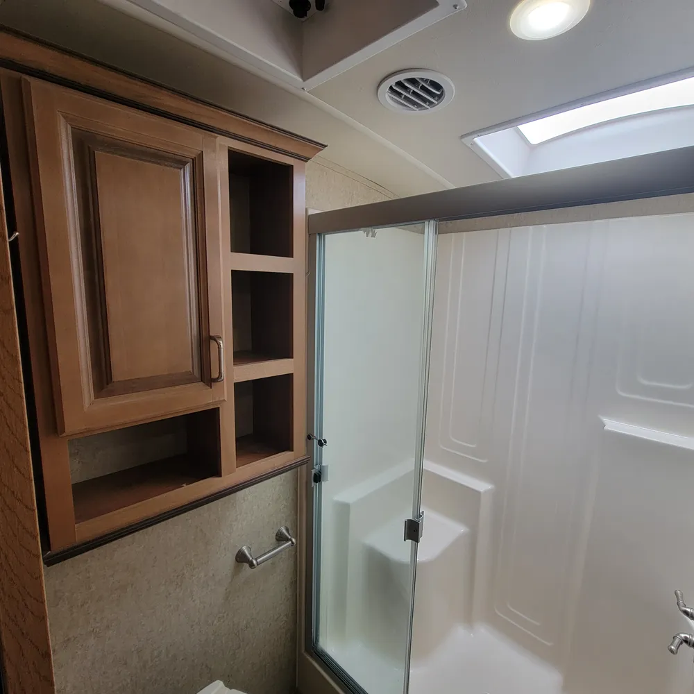 The front master suite offers a king bed slide-out with underbed storage, full-size mirrored closets, and washer/dryer prep for extended travels. The center bathroom features a porcelain toilet, glass shower with skylight, vanity sink with storage, and a power vent fan. Dual wardrobes and generous storage options throughout make this fifth wheel feel like a true home on wheels.