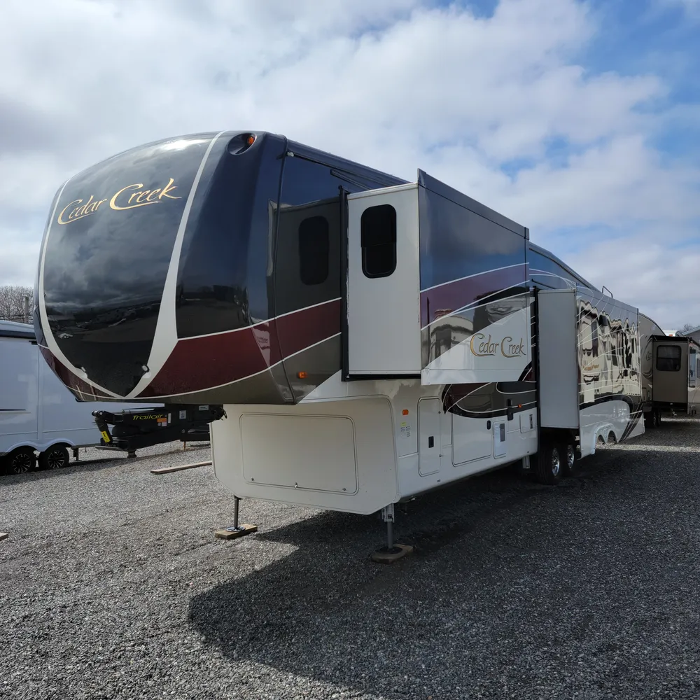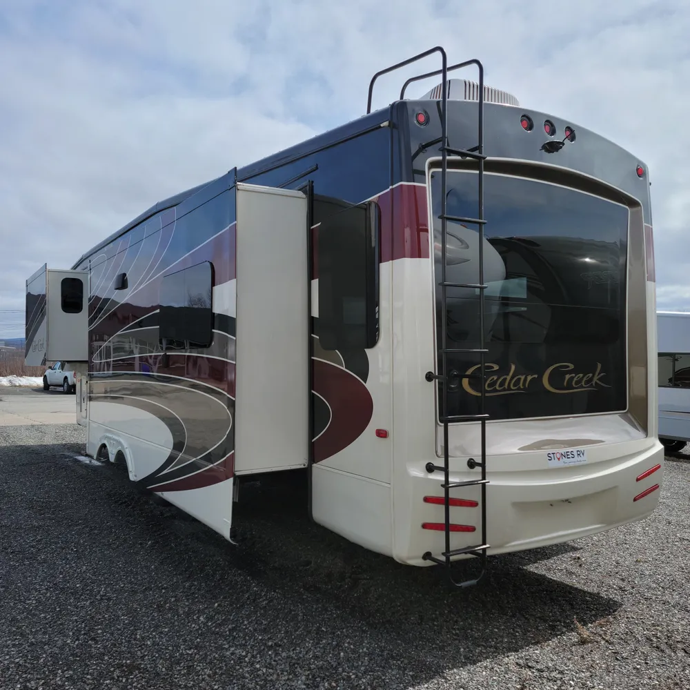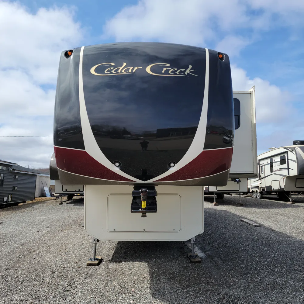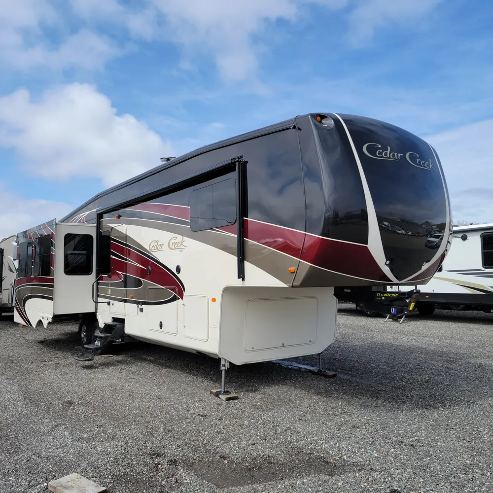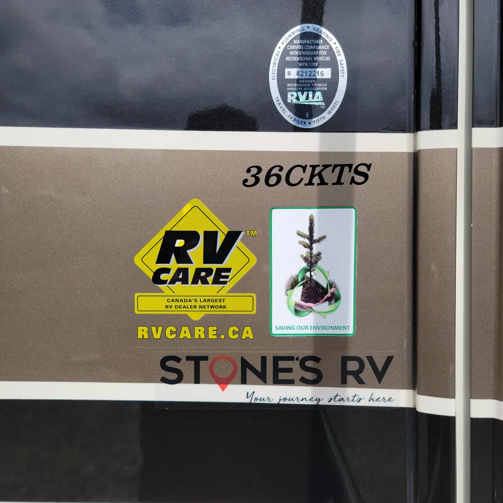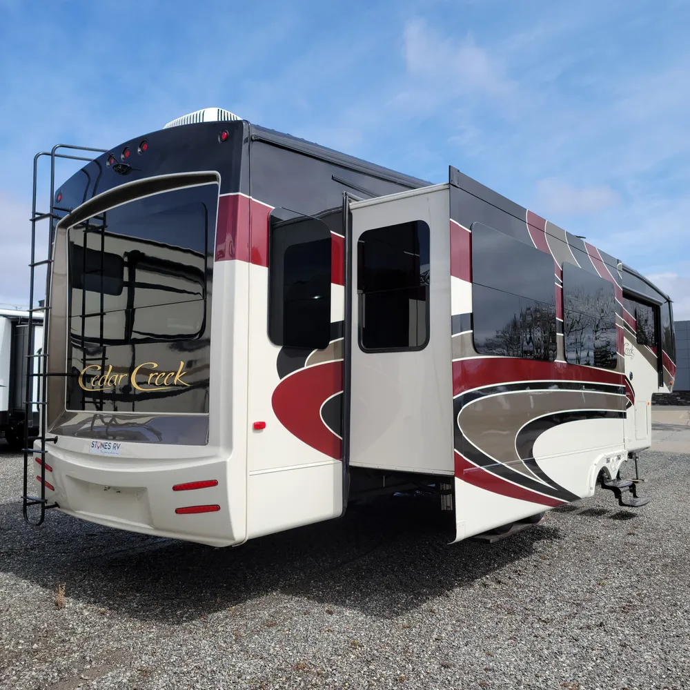In stock at Stone’s RV, the 2017 Forest River Cedar Creek Hathaway Edition 36CKTS is a distinctive luxury fifth wheel that delivers residential comfort in a rear living layout. At 40 feet long, this unit sleeps 4 people, weighs 12,670 lbs dry with a GVWR of 16,407 lbs and a pin weight of 2,500 lbs, making it ideal for couples seeking extended-stay comfort at Maritime campgrounds.