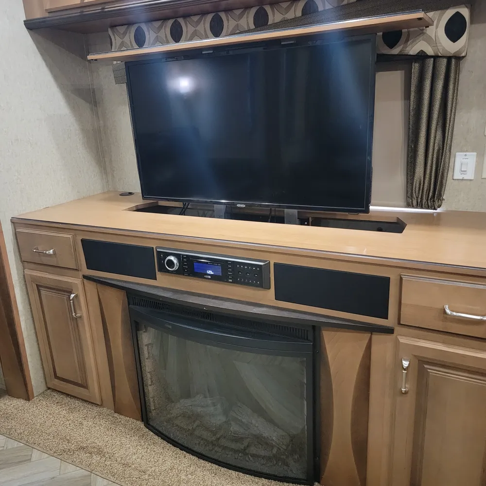The 36CKTS distinguishes itself with a spacious rear living area enhanced by opposing slide-outs. The entertainment zone features a leather hide-a-bed sofa, two recliners, a freestanding dinette, and an electric fireplace with TV lift for a clean, modern look. The kitchen impresses with a Hoosier-style cabinet providing extra counter space and a center island with double sink, creating an open flow between living areas. Premium appliances include a residential refrigerator, three-burner range, and ample storage throughout.