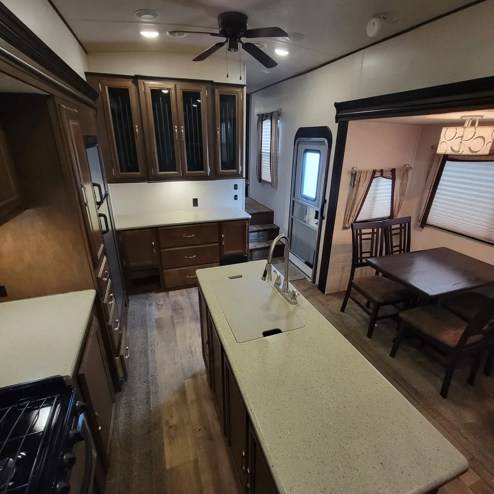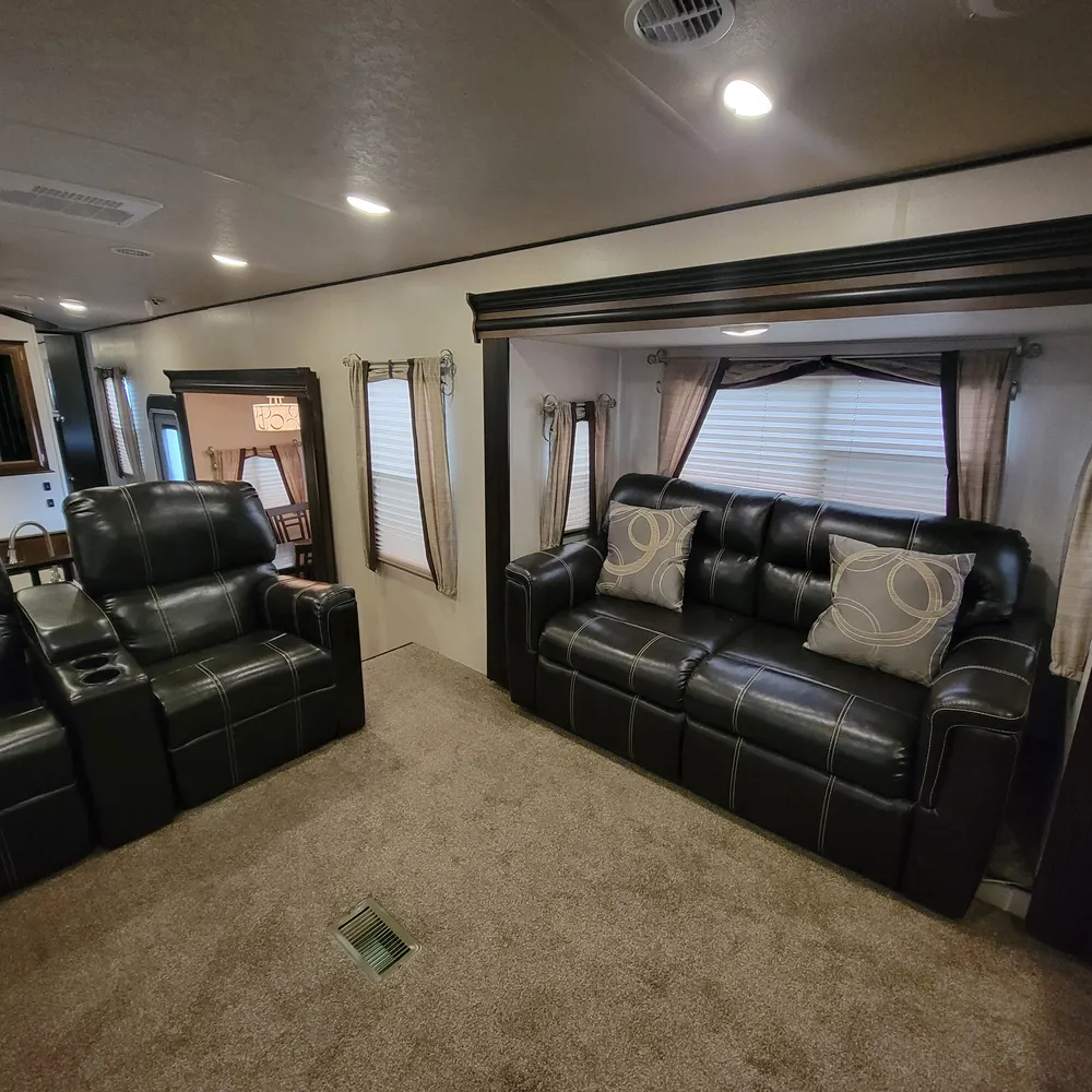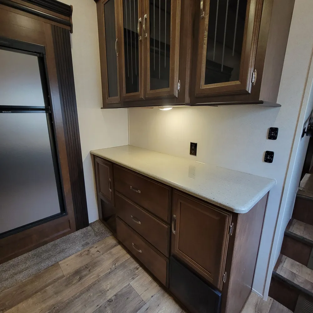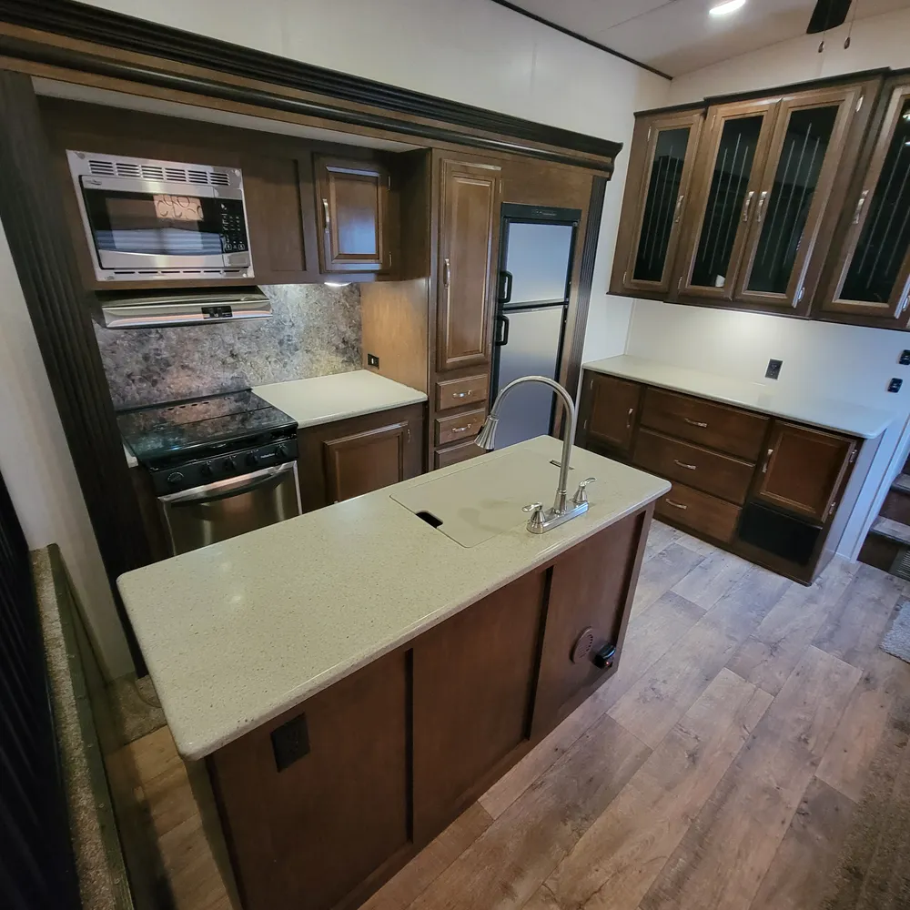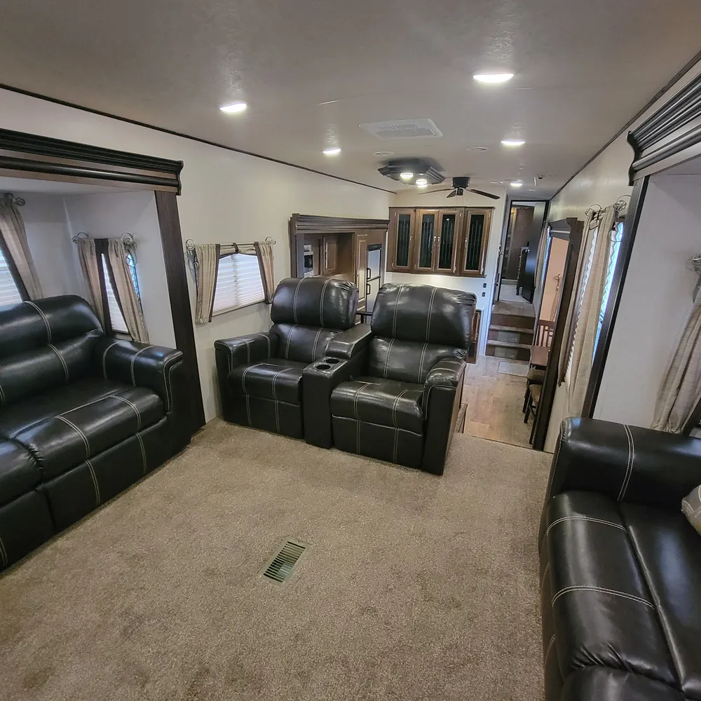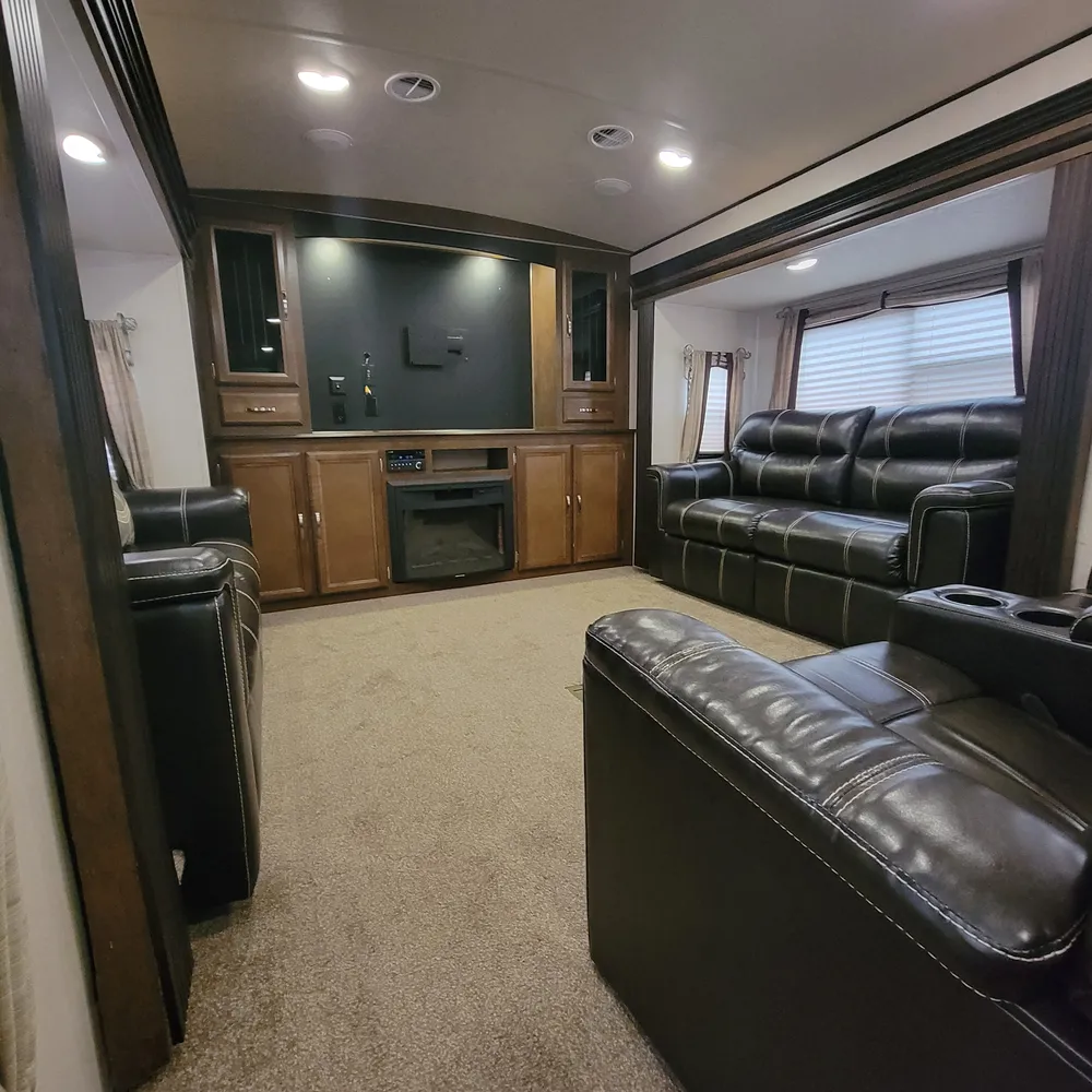 The 372RD stands out with its separate rear entertainment area featuring dual tri-fold sofas, theater seating, and a large entertainment center with fireplace. The front master bedroom includes a residential-style bed with wardrobe storage, while the mid-coach kitchen offers a freestanding dinette with four chairs and a peninsula island with double sink. Outside, the 20-foot power awning and extensive pass-through storage accommodate all your camping gear.