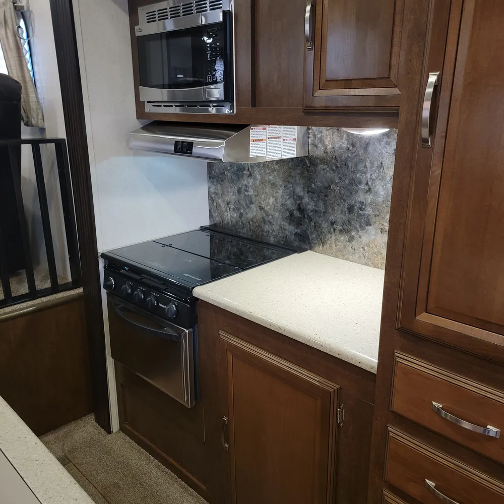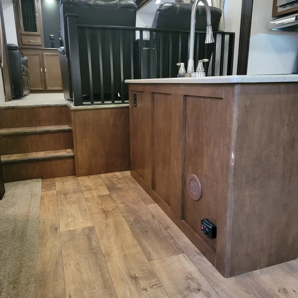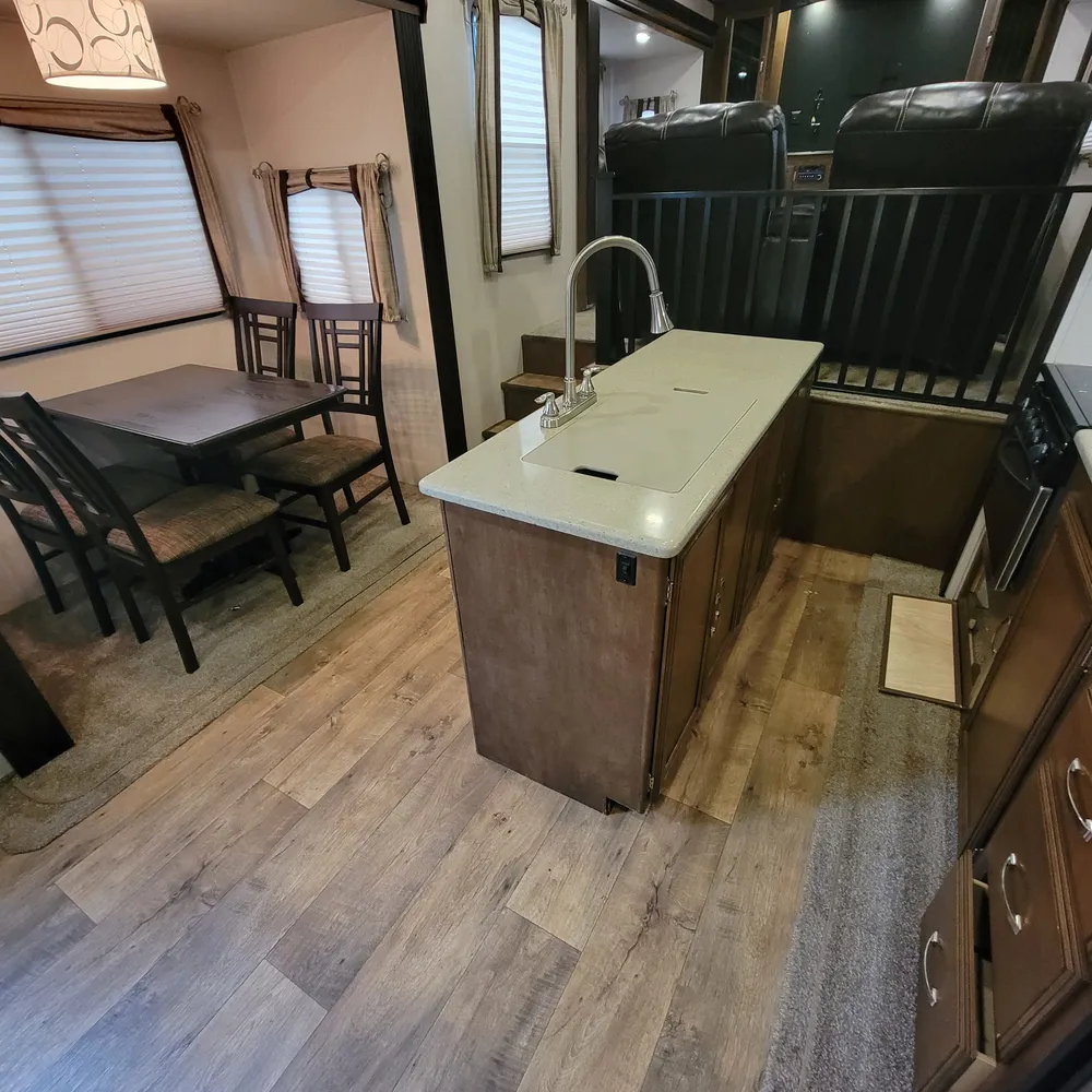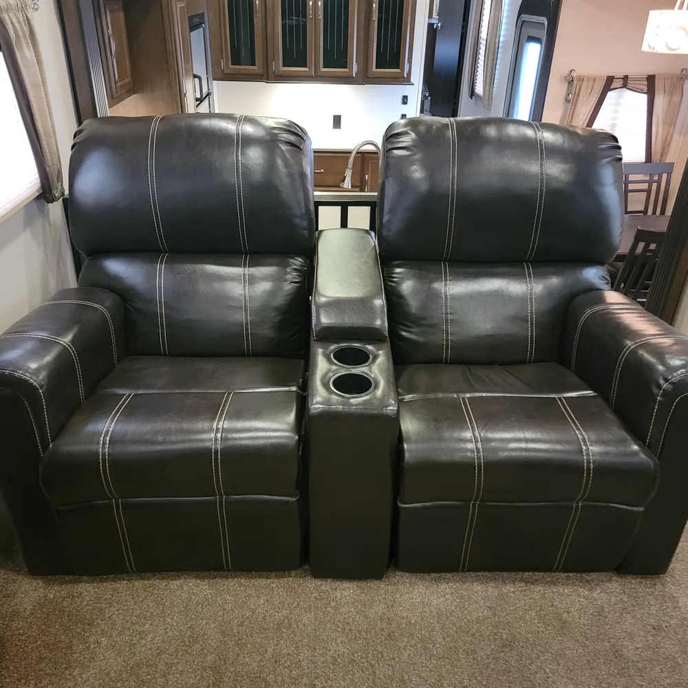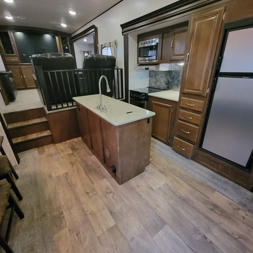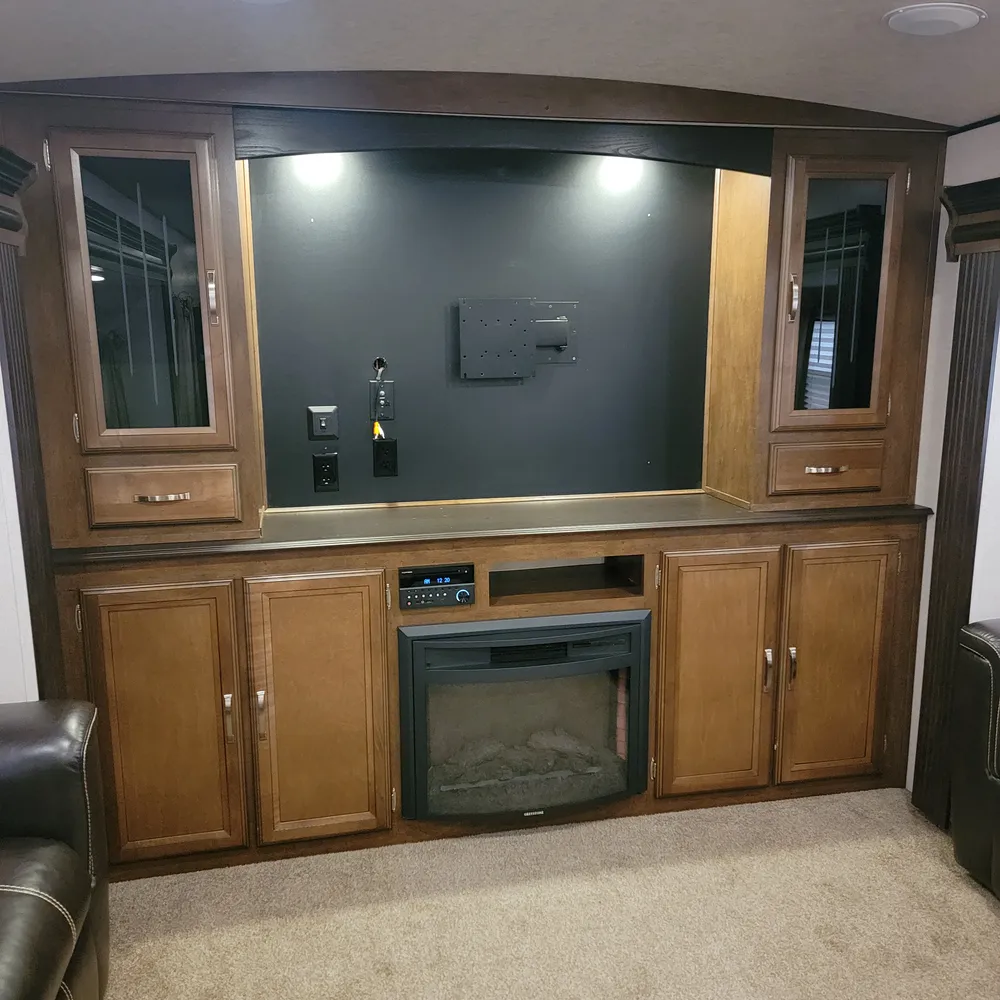 The 372RD stands out with its separate rear entertainment area featuring dual tri-fold sofas, theater seating, and a large entertainment center with fireplace. The front master bedroom includes a residential-style bed with wardrobe storage, while the mid-coach kitchen offers a freestanding dinette with four chairs and a peninsula island with double sink. Outside, the 20-foot power awning and extensive pass-through storage accommodate all your camping gear.