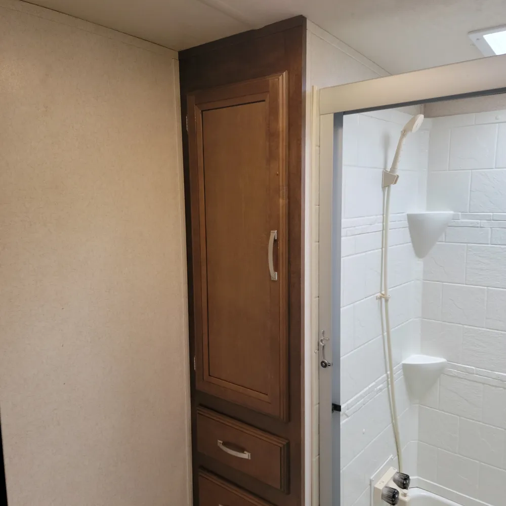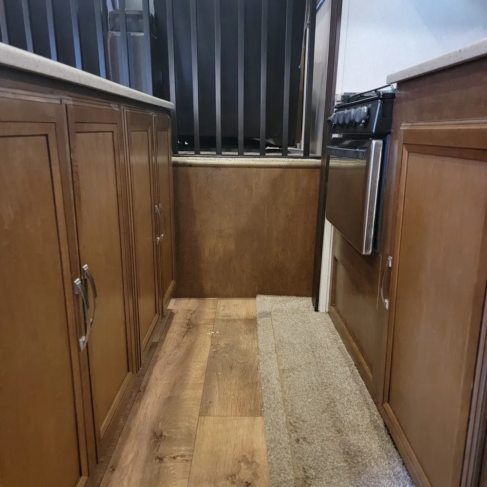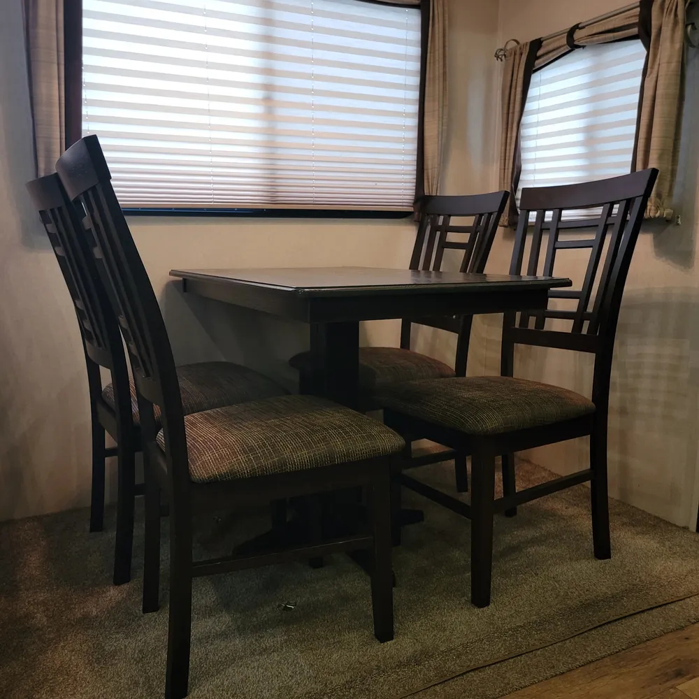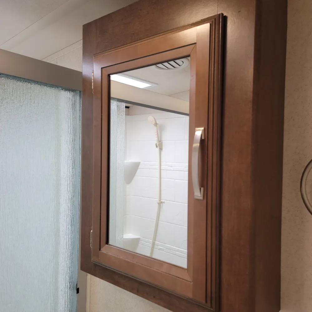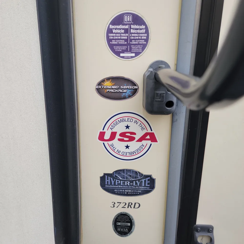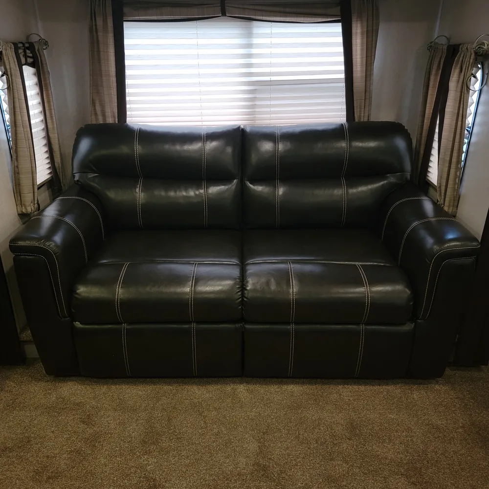The 372RD stands out with its separate rear entertainment area featuring dual tri-fold sofas, theater seating, and a large entertainment center with fireplace. The front master bedroom includes a residential-style bed with wardrobe storage, while the mid-coach kitchen offers a freestanding dinette with four chairs and a peninsula island with double sink. Outside, the 20-foot power awning and extensive pass-through storage accommodate all your camping gear.