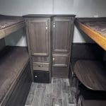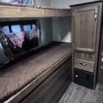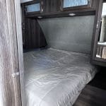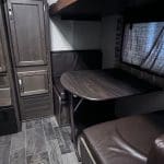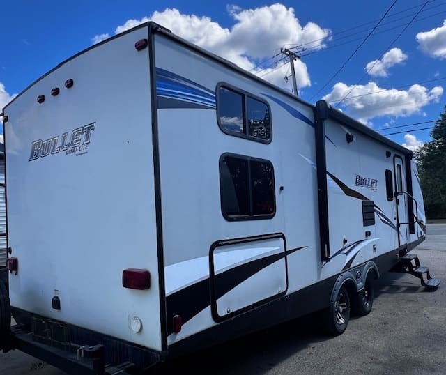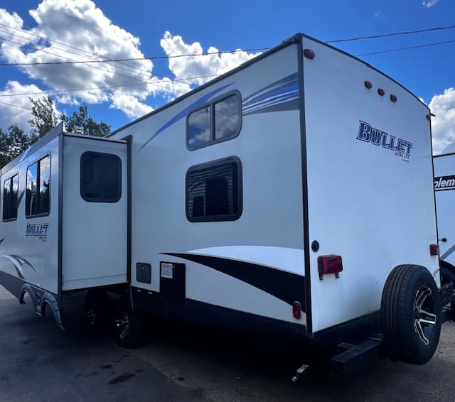 The 2018 Bullet Ultra Lite 287QBS is a lightweight travel trailer designed for families, featuring a spacious quad-bunk room with four bunks and a convertible dinette, a master bedroom with storage, a full bathroom, a kitchen with appliances, and a living area with a fold-out sofa and dinette.