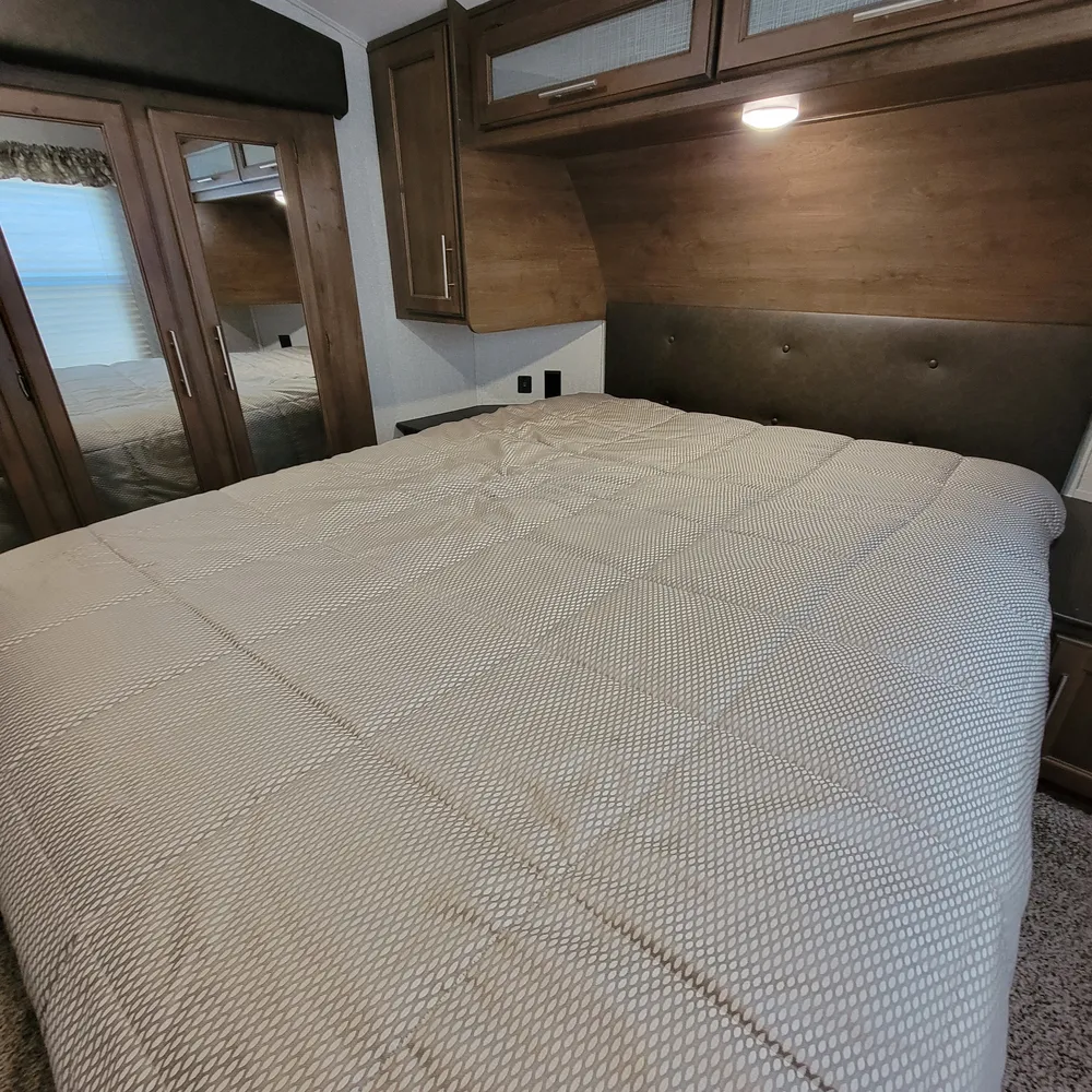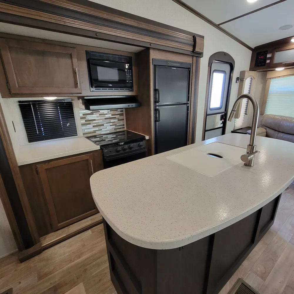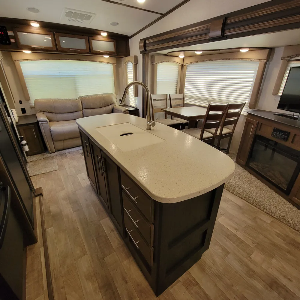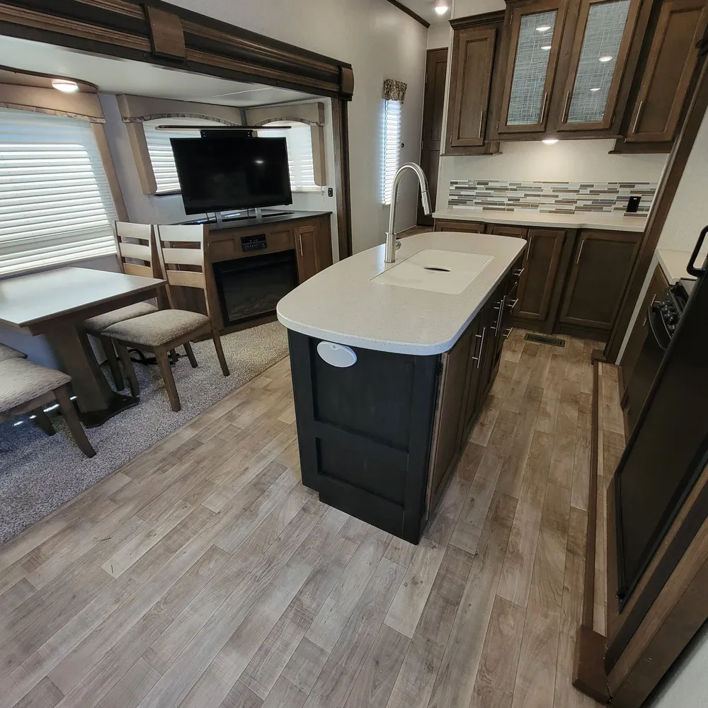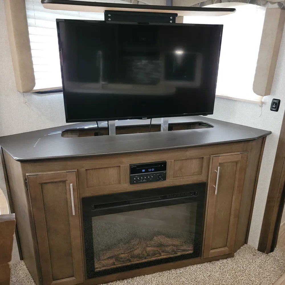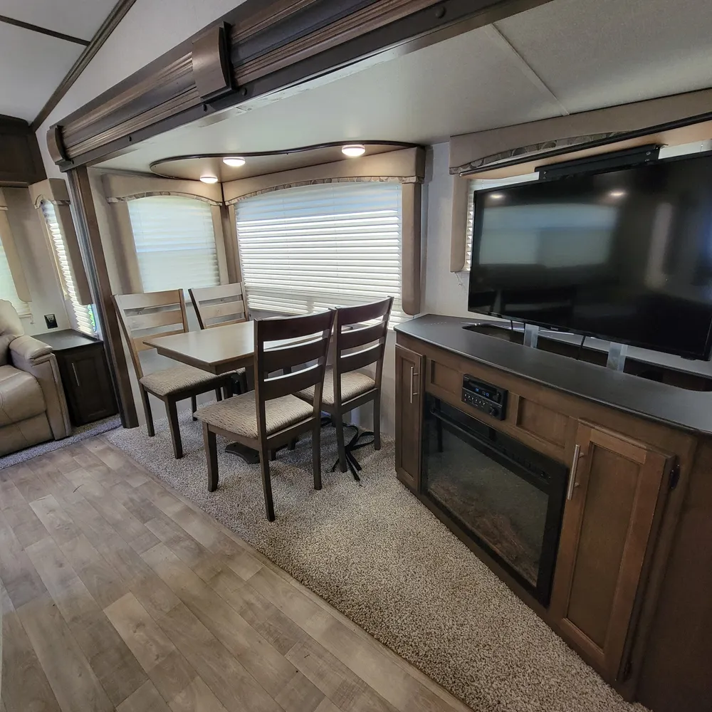 Equipped for the camping season with dual 13,500 BTU ducted air conditioners and a ducted furnace. The 15-foot power awning with LED lighting extends your outdoor living space at Atlantic Canada campgrounds. An electric fireplace, 50-inch TV with entertainment center, and indoor and outdoor speakers make this a comfortable home base for the season.