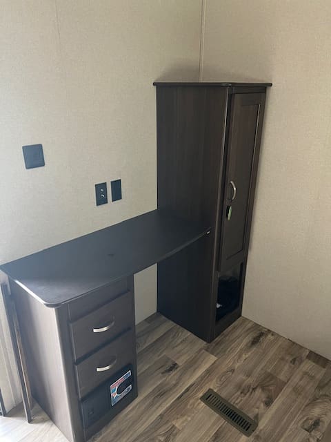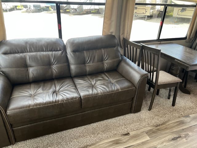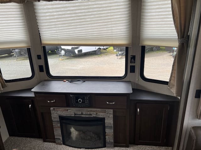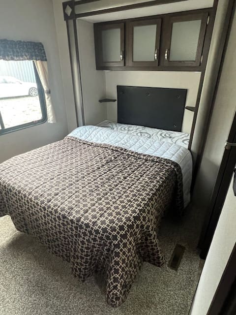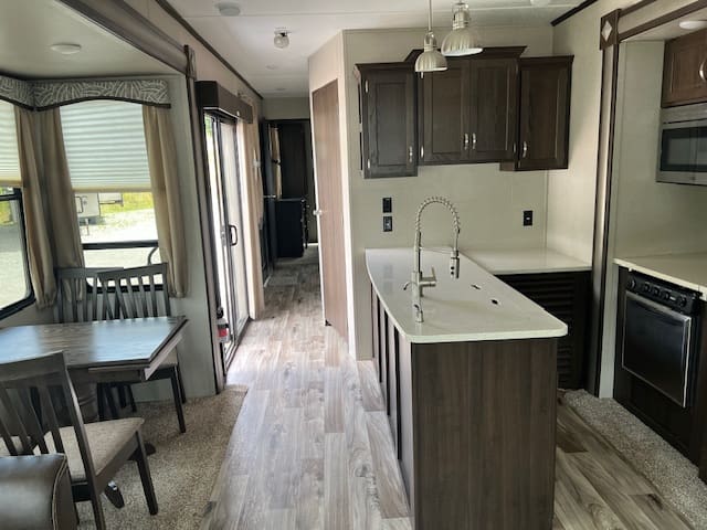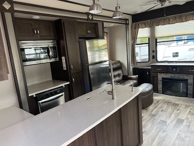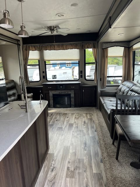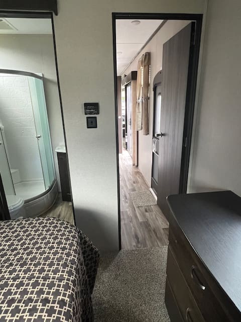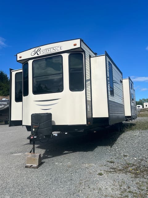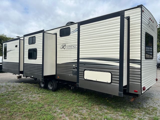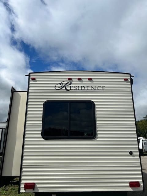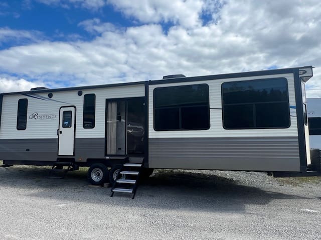 The 2019 Residence 40MBNK includes amenities like sliding glass patio doors, a double-entry bathroom, an entertainment center, and multiple sleeping areas, making it ideal for family getaways or a second home.