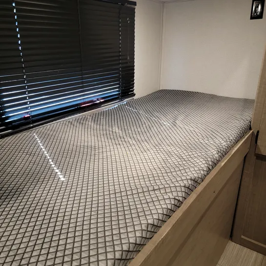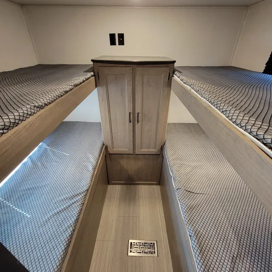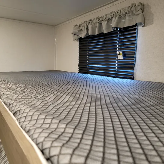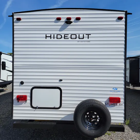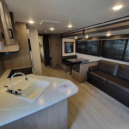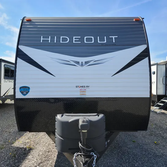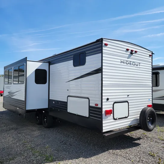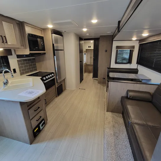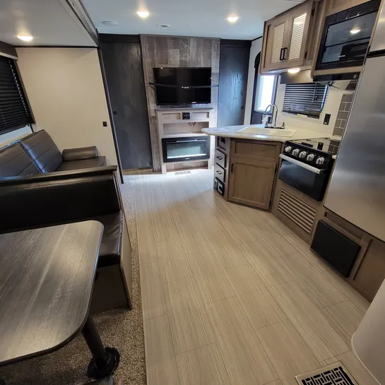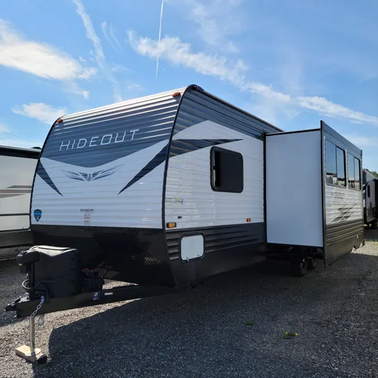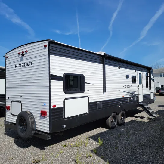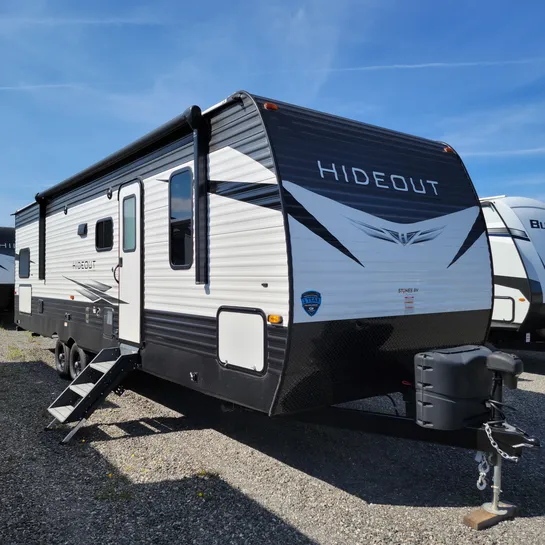 The 2021 Keystone Hideout 290QB features a front queen bed, a rear bunkhouse with two sets of double bunks, and a convertible dinette and sofa in the living area. The trailer is approximately 33 feet 4 inches long and weighs around 6,600 lbs, making it suitable for most half-ton trucks.