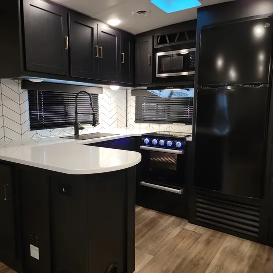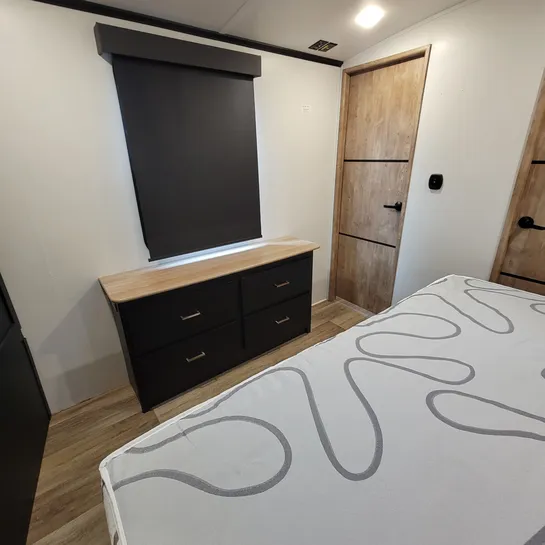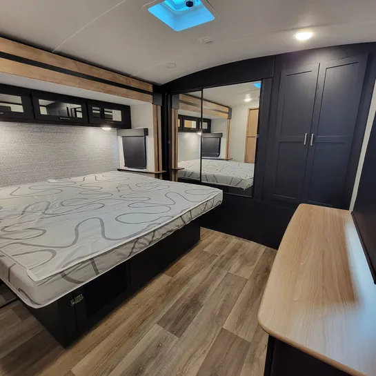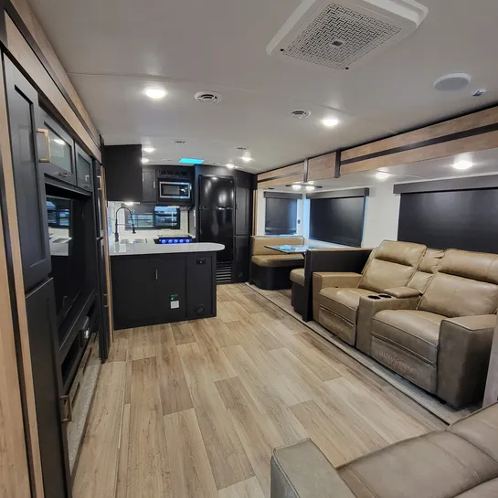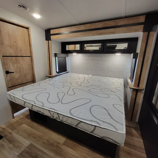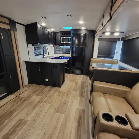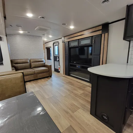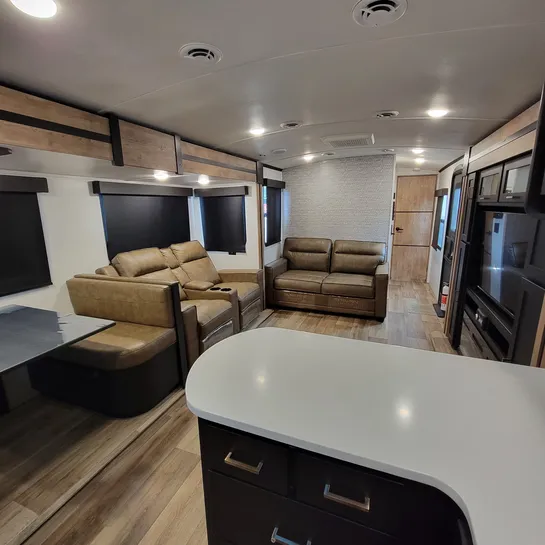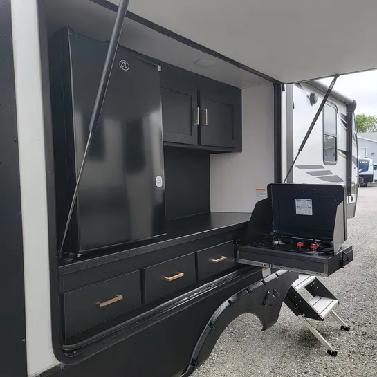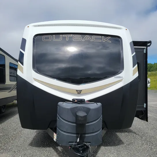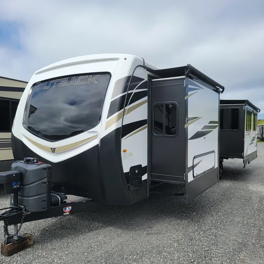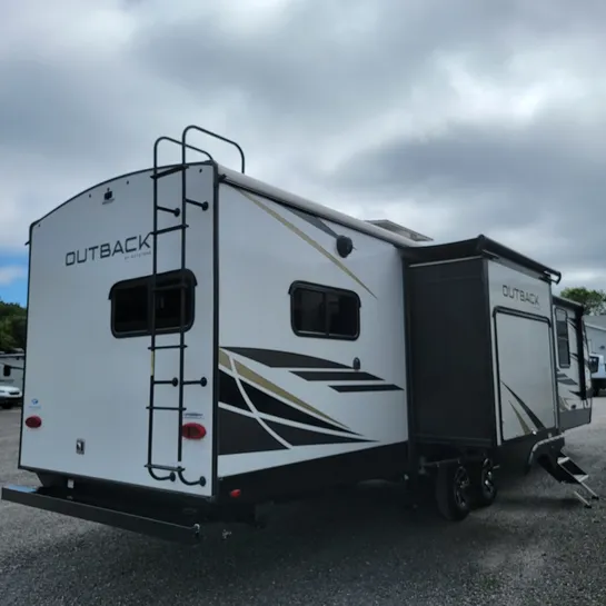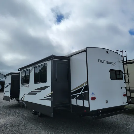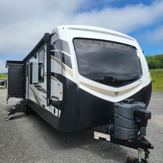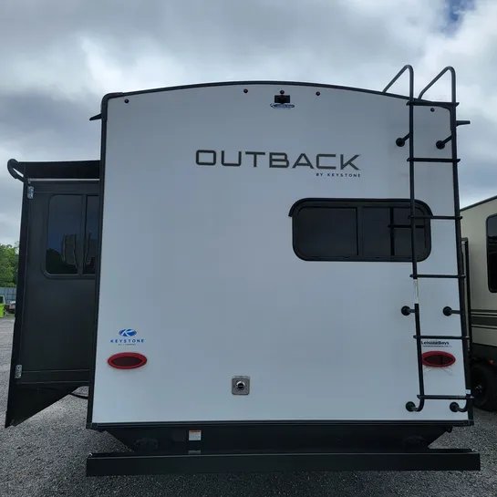 The 2022 Keystone Outback 332ML is a luxury travel trailer known for its spaciuos interior and high-end features. It has a mid-living area, three slide-outs, and an outdoor kitchen. It can comfortably sleep up to six people using the furniture and offers a rear kitchen, a double-entry bathroom, and a front bedroom with a queen bed slide-out.