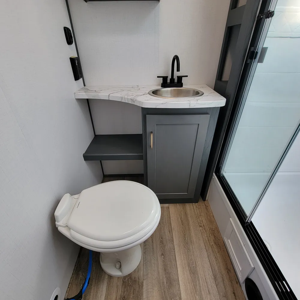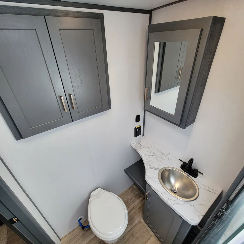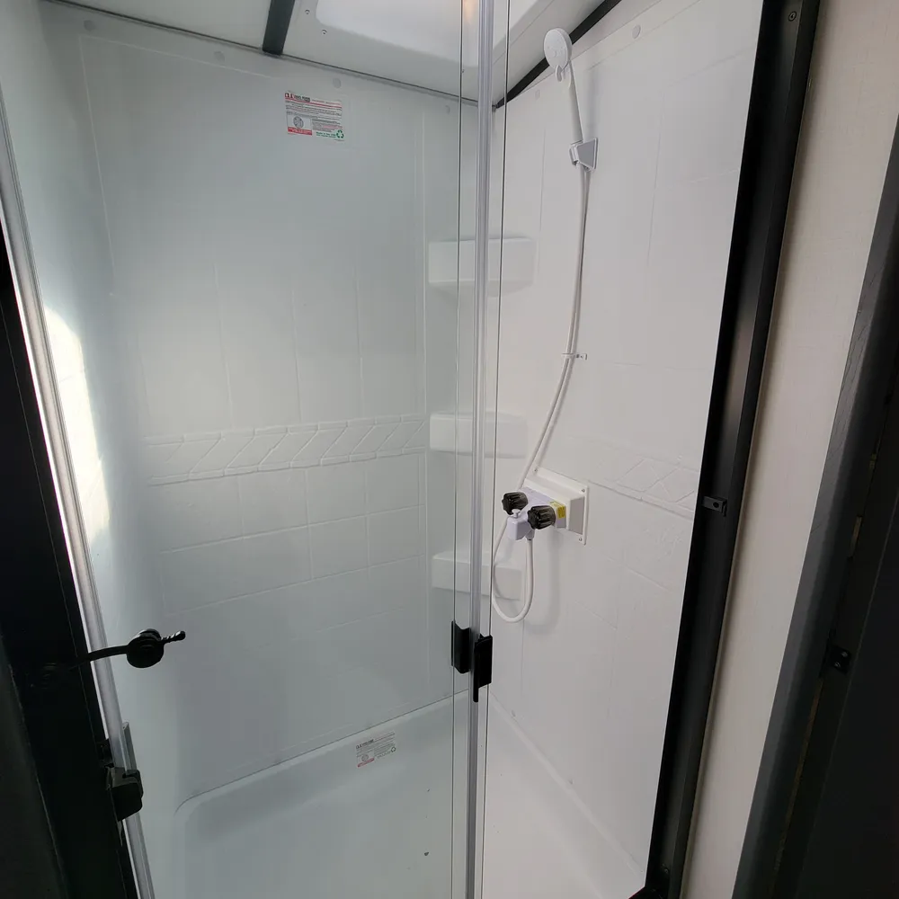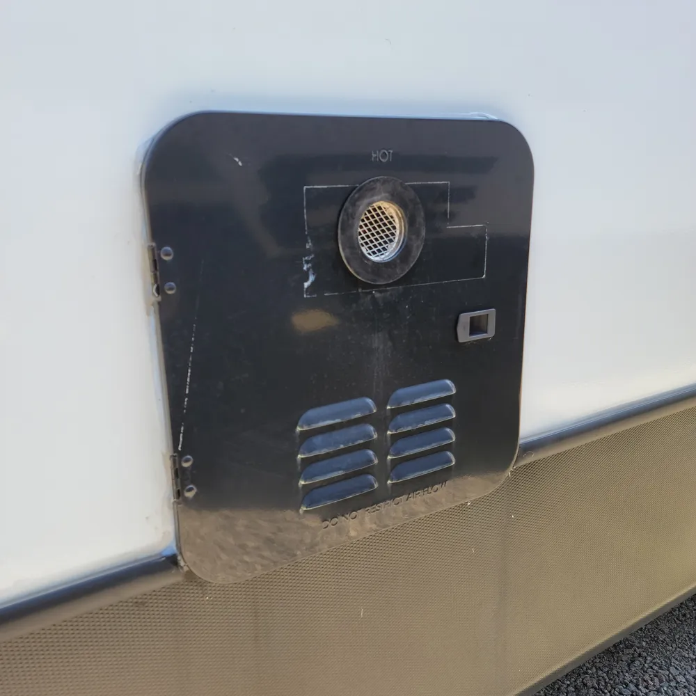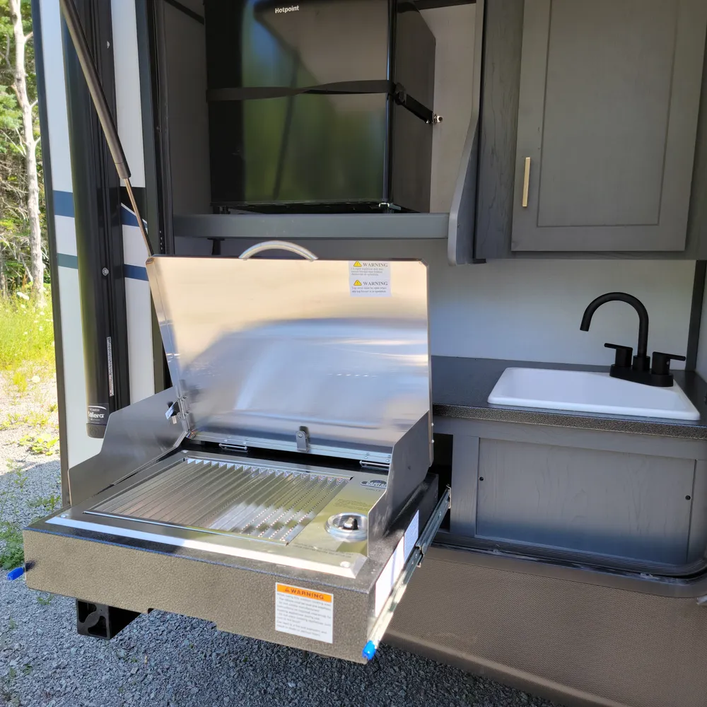 Equipped for the camping season with a 15,000 BTU air conditioner and 30,000 BTU furnace. The docking station provides easy access to water connections, water heater bypass, stabilizer jack switches, and winterization in one spot.