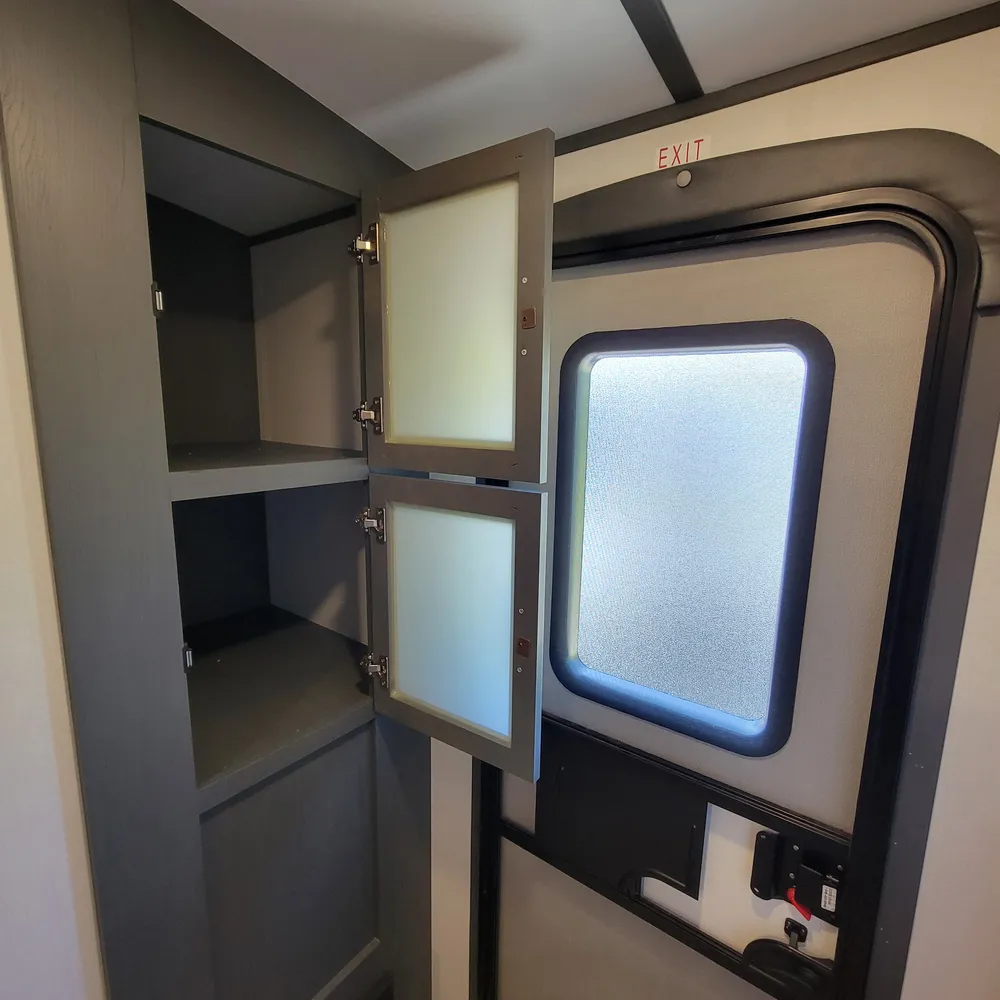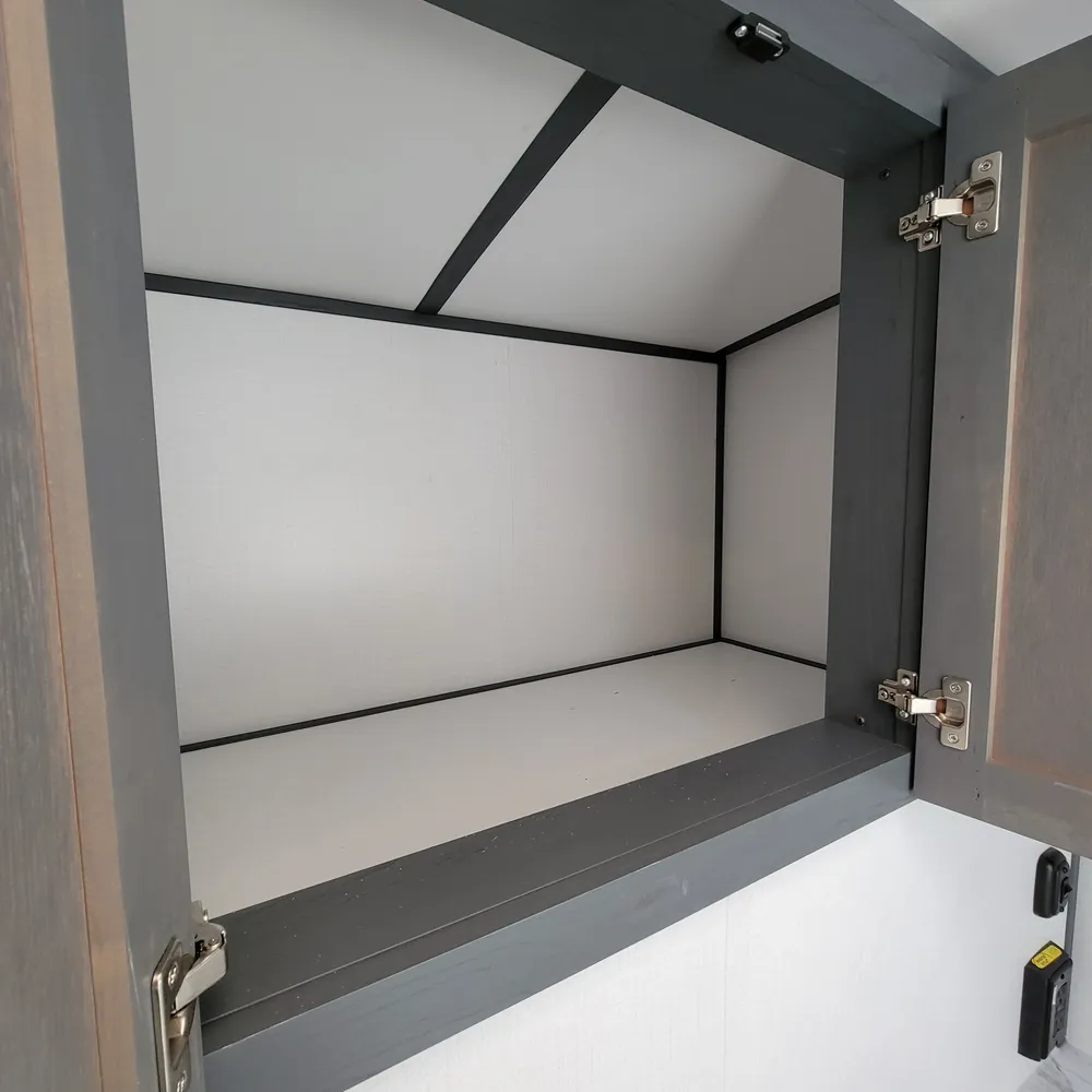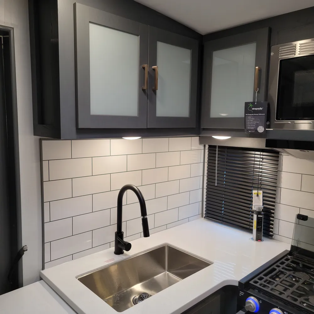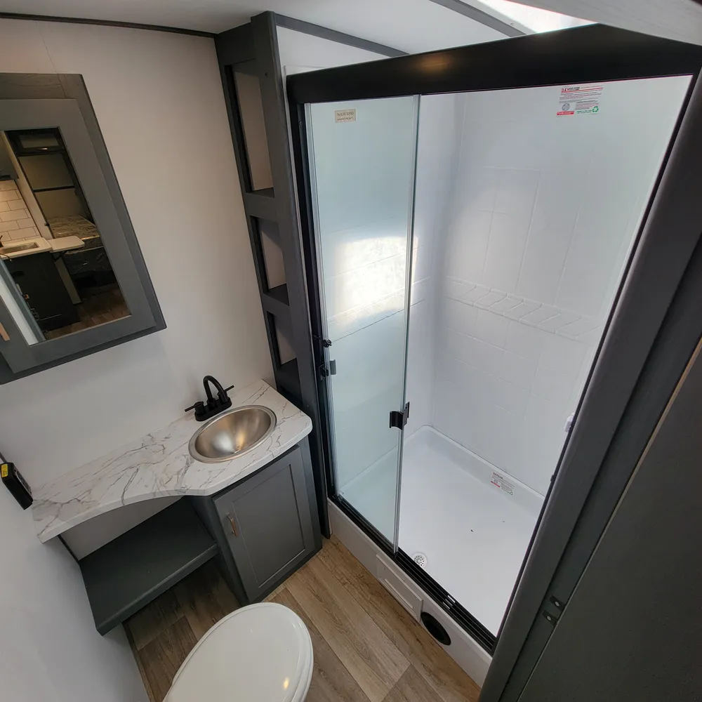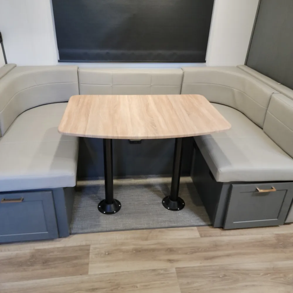 Equipped for the camping season with a 15,000 BTU air conditioner and 30,000 BTU furnace. The docking station provides easy access to water connections, water heater bypass, stabilizer jack switches, and winterization in one spot.
