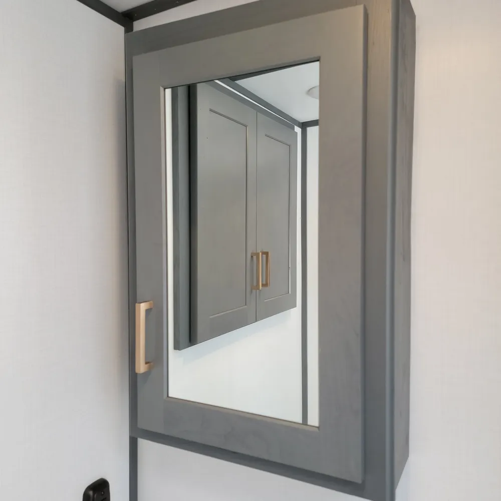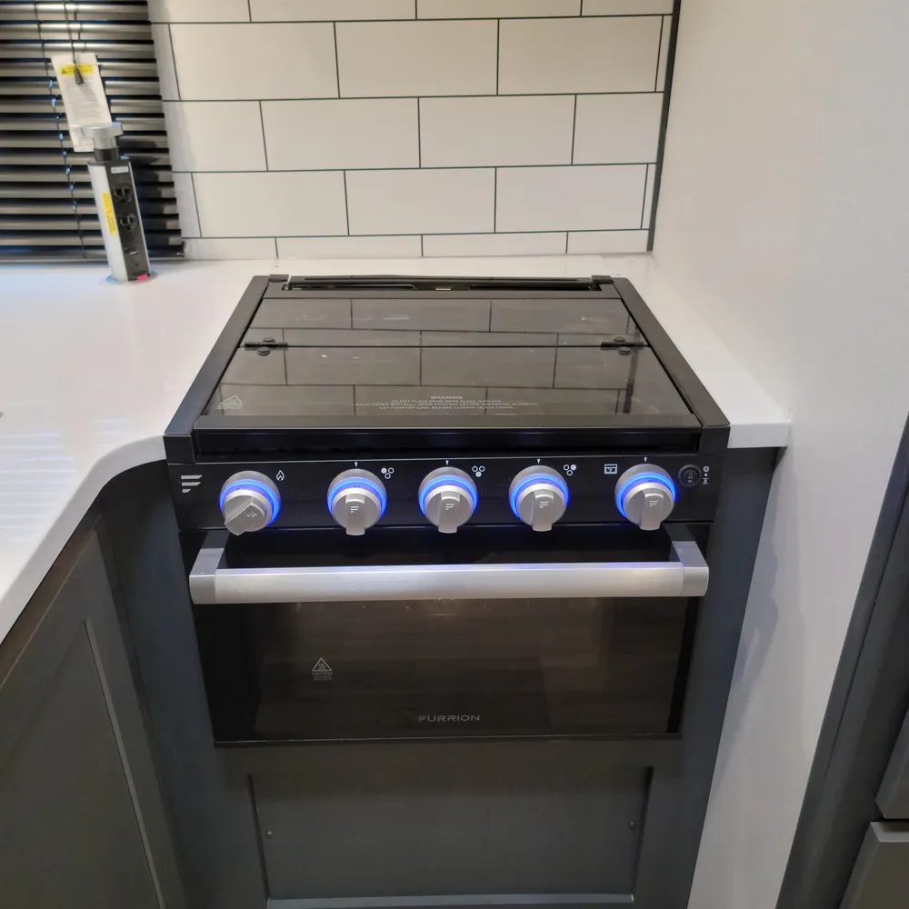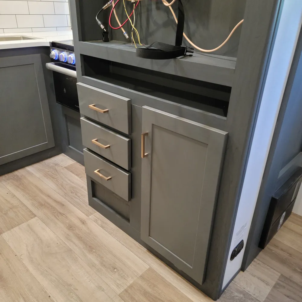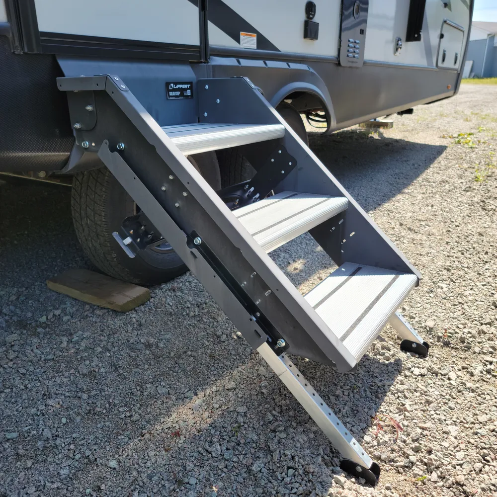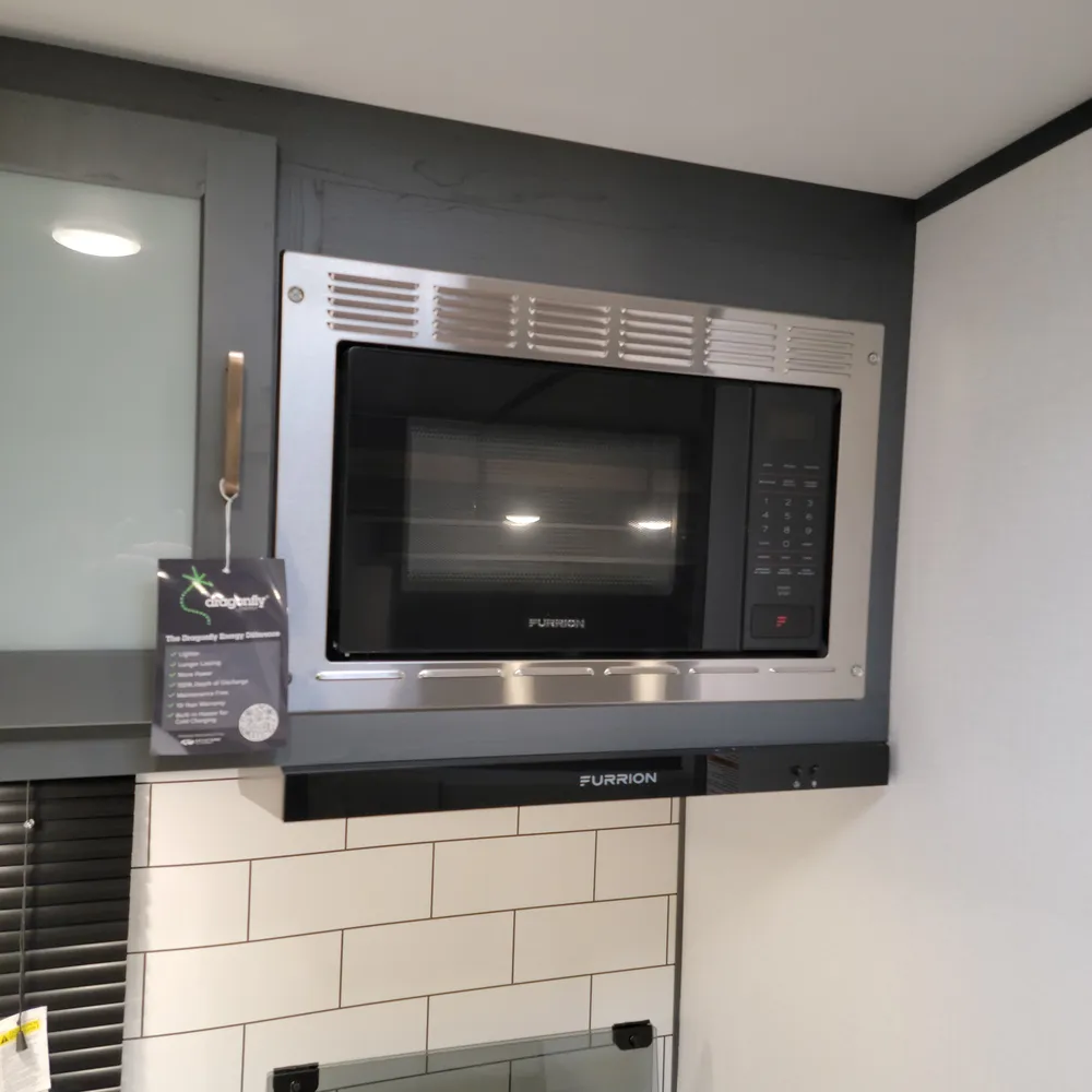 Equipped for the camping season with a 15,000 BTU air conditioner and 30,000 BTU furnace. The docking station provides easy access to water connections, water heater bypass, stabilizer jack switches, and winterization in one spot.