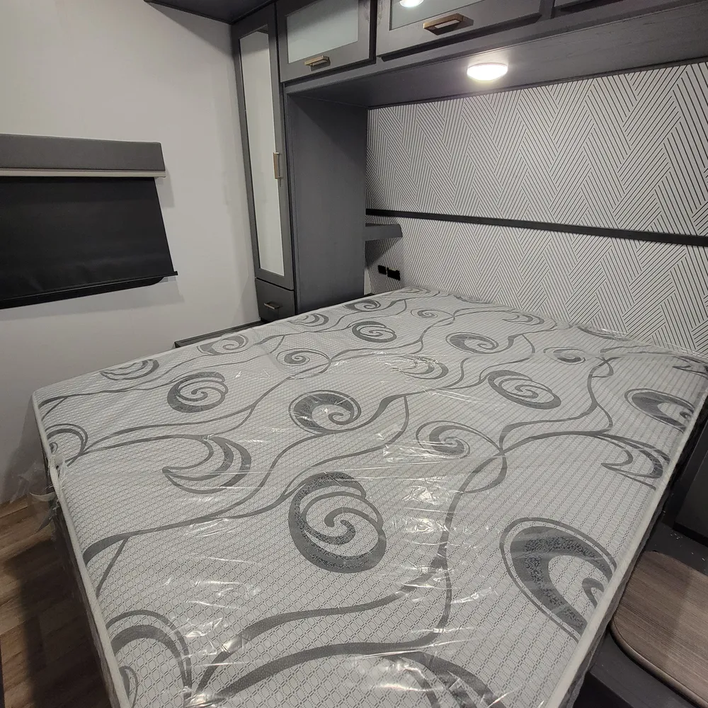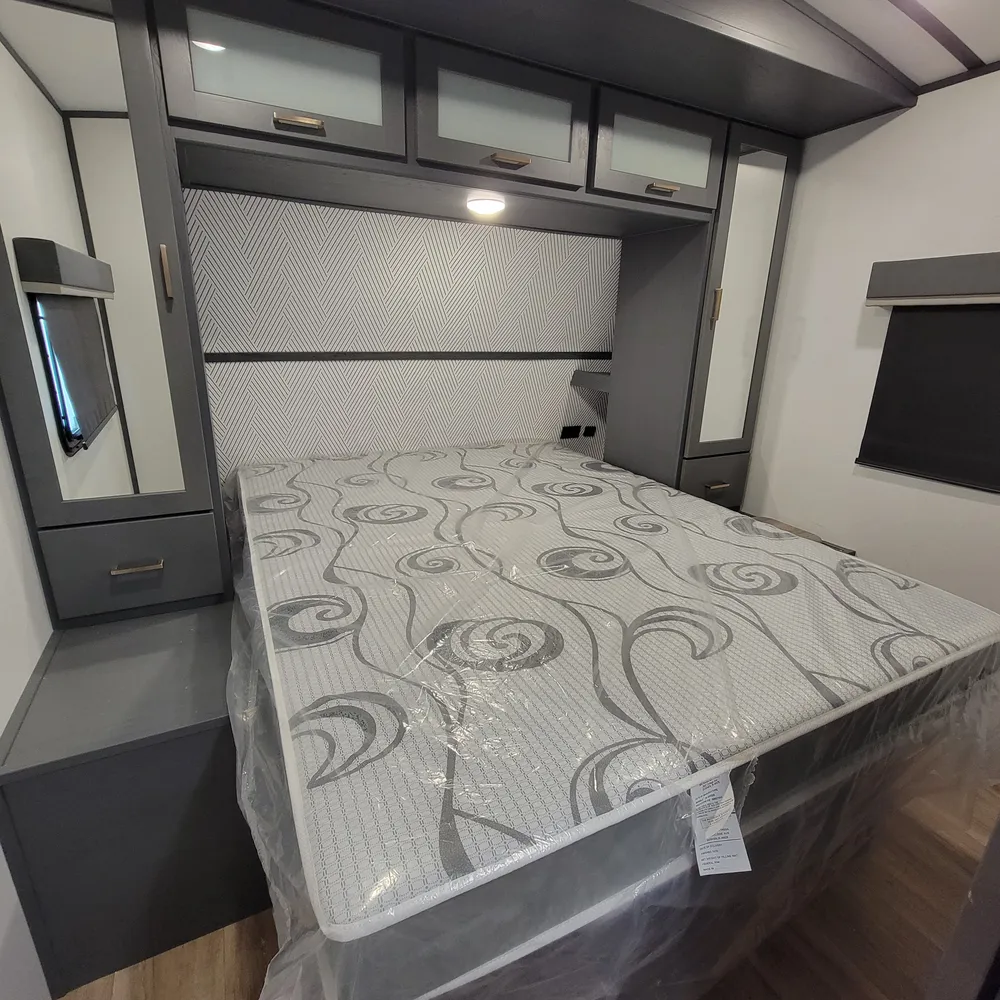 The front private bedroom features a queen bed with wardrobes on each side and a laundry chute that feeds to the exterior pass-through storage below. The 51 cubic feet of pass-through storage with pegboard organization is one of the more practical features on this unit.