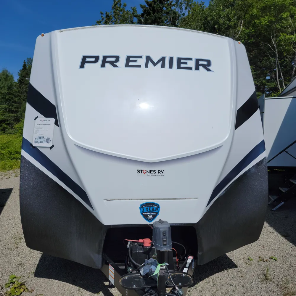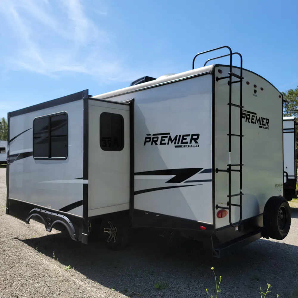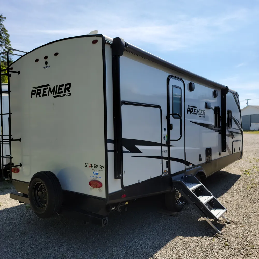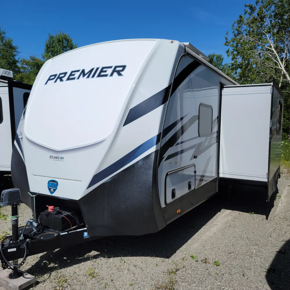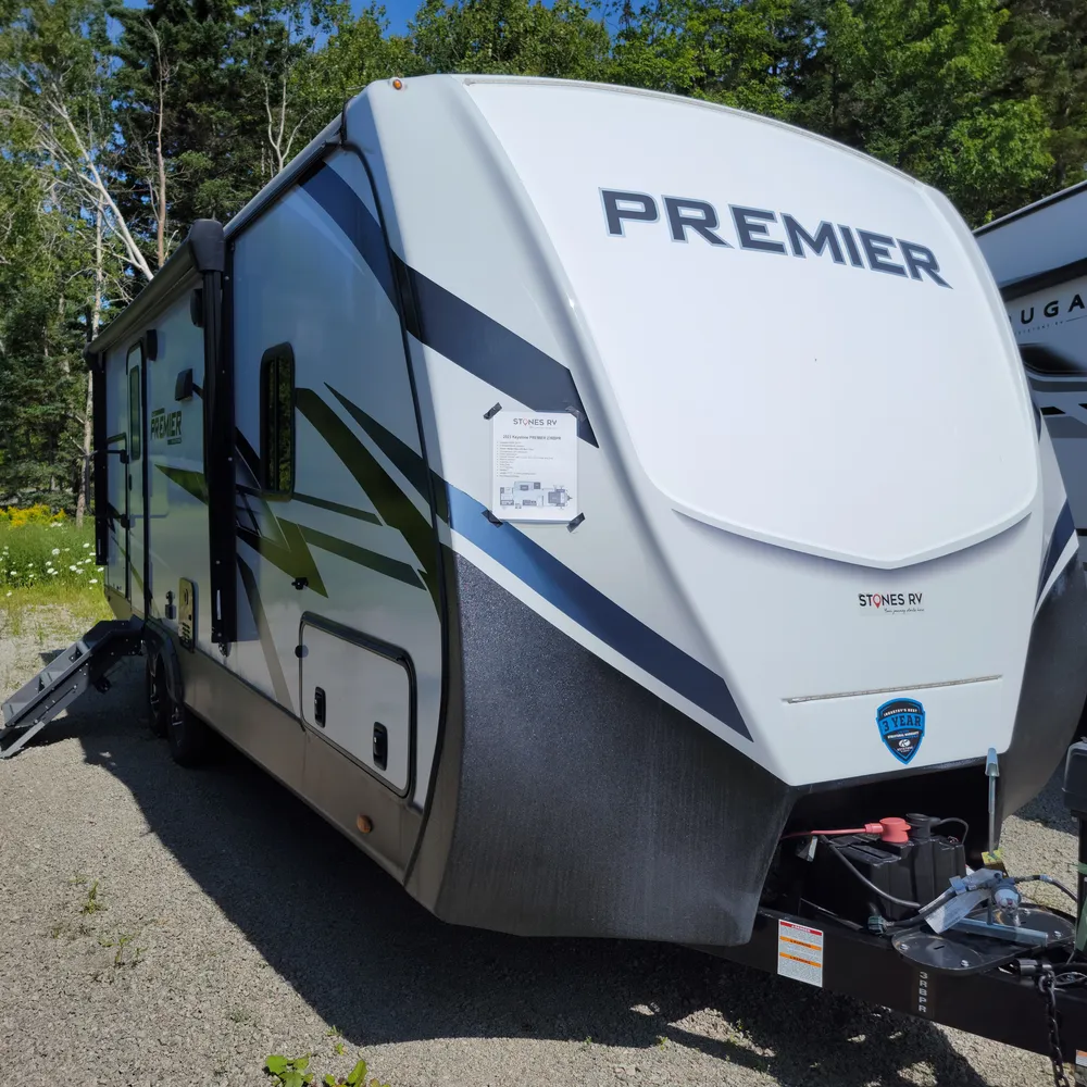 The 2023 Keystone Premier 23RBPR is a 27-foot, 8-inch rear bath travel trailer that sleeps up to four people. With a dry weight of 5,707 lbs and a hitch weight of 655 lbs, the Premier 23RBPR tows comfortably behind a half-ton truck, making it a practical choice for couples or small families exploring Atlantic Canada campgrounds.
