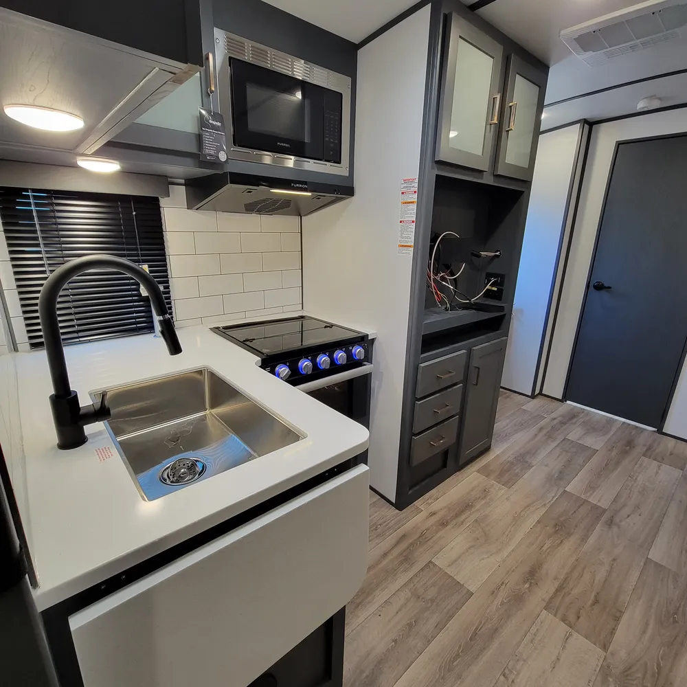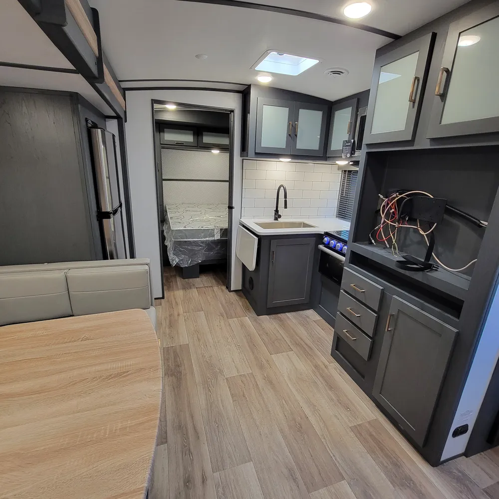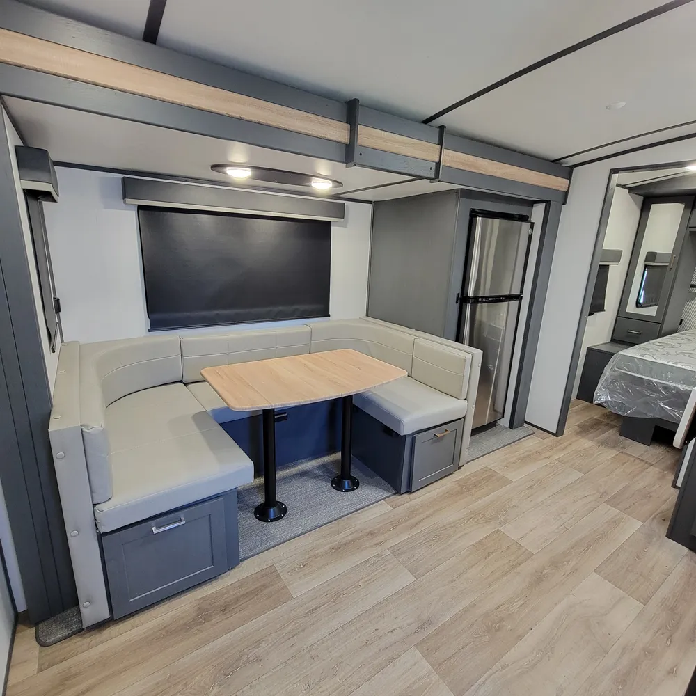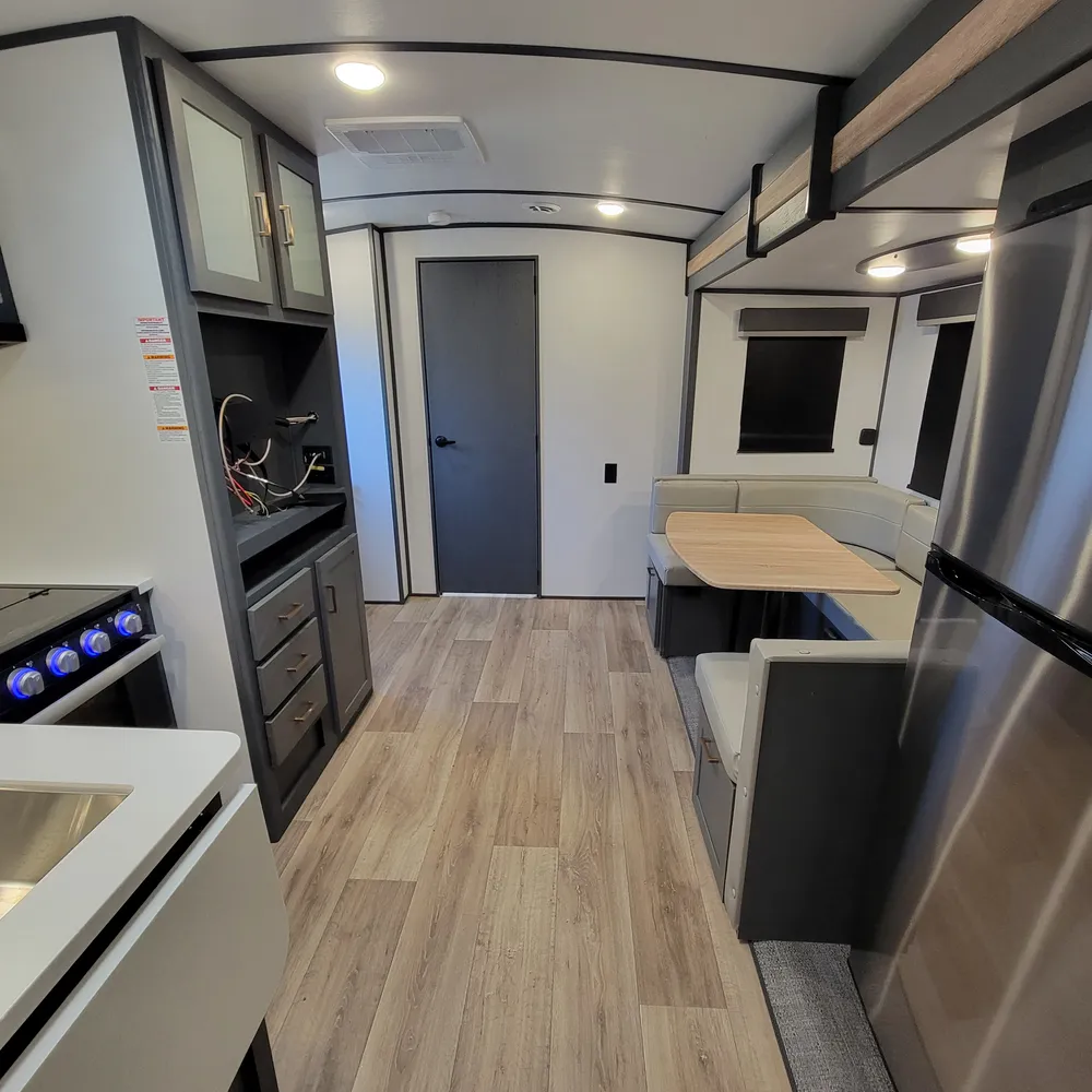 The 23RBPR floorplan opens to a central living and kitchen area. One slideout expands the dining space, housing the U-shaped dinette that converts to an additional sleeping area. The kitchen sits mid-coach with a three-burner Furrion gas range, oven, microwave, and refrigerator. Counter space is solid throughout, and the HyperDeck flooring adds durability underfoot. An entertainment center serves the main living area, with both interior and exterior speakers included.