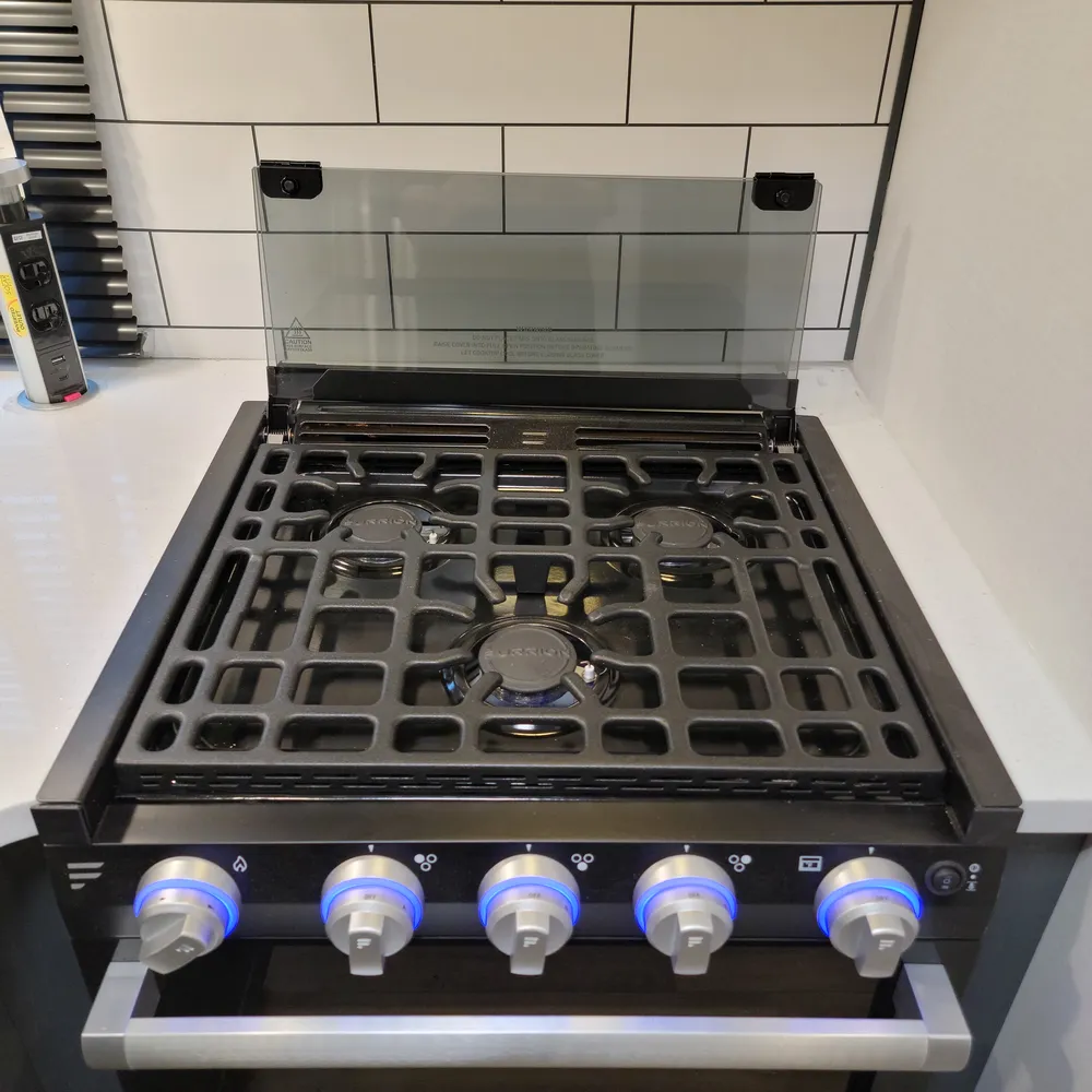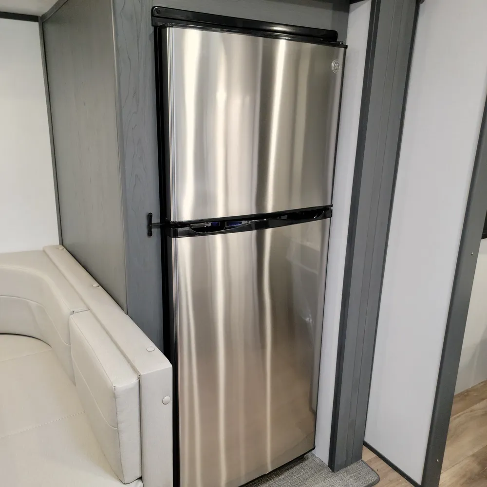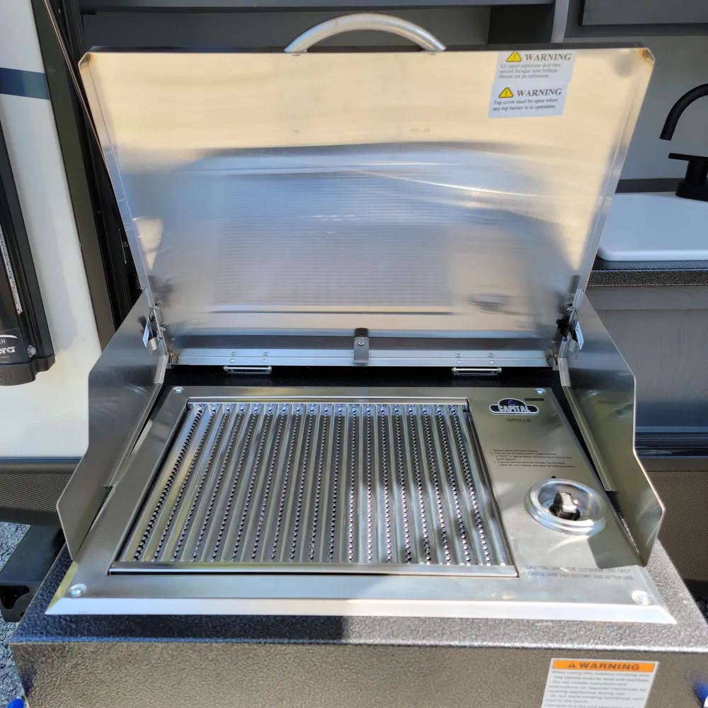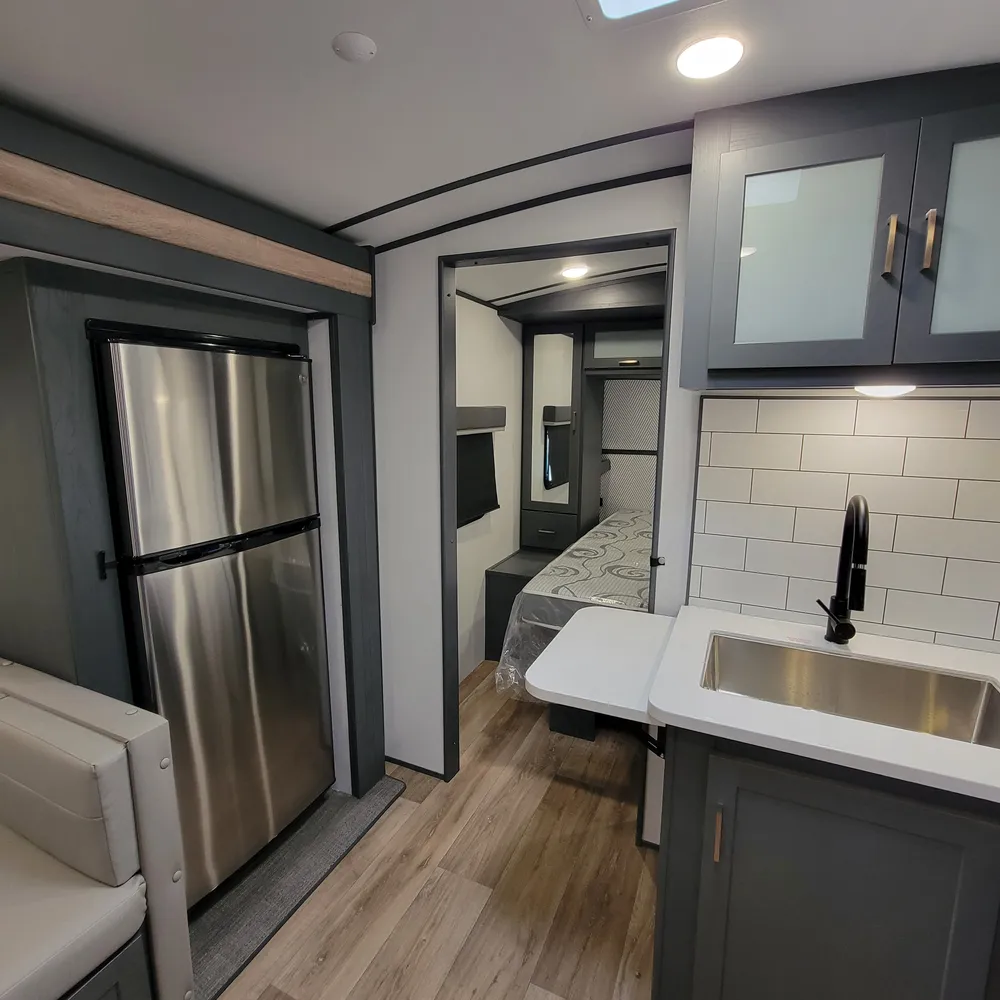 The 23RBPR floorplan opens to a central living and kitchen area. One slideout expands the dining space, housing the U-shaped dinette that converts to an additional sleeping area. The kitchen sits mid-coach with a three-burner Furrion gas range, oven, microwave, and refrigerator. Counter space is solid throughout, and the HyperDeck flooring adds durability underfoot. An entertainment center serves the main living area, with both interior and exterior speakers included.
