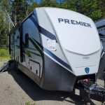 The 2023 Premier 23RBPR by Keystone RV is an ultra-lite travel trailer with a spacious layout and several features. It includes a front private bedroom, a U-shaped dinette, an outside kitchen, and a walk-in shower.