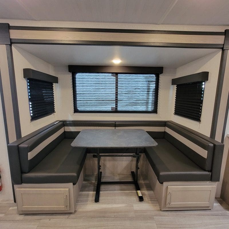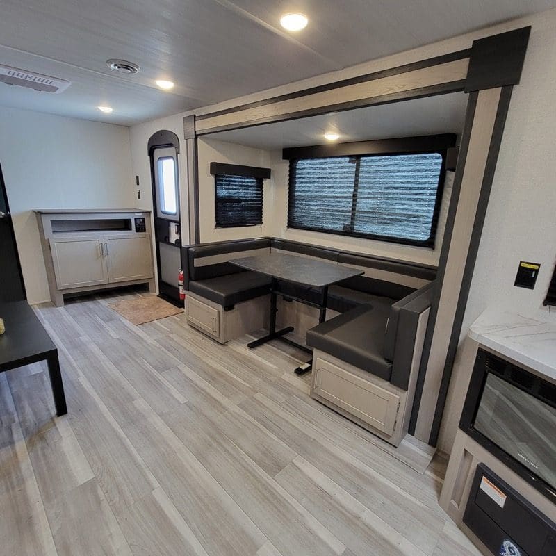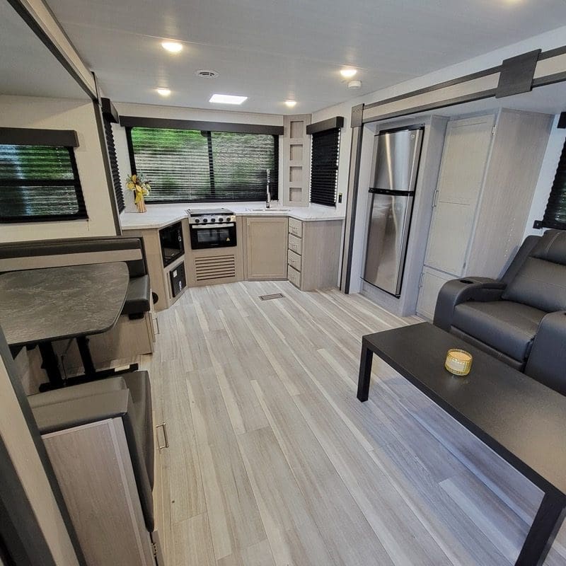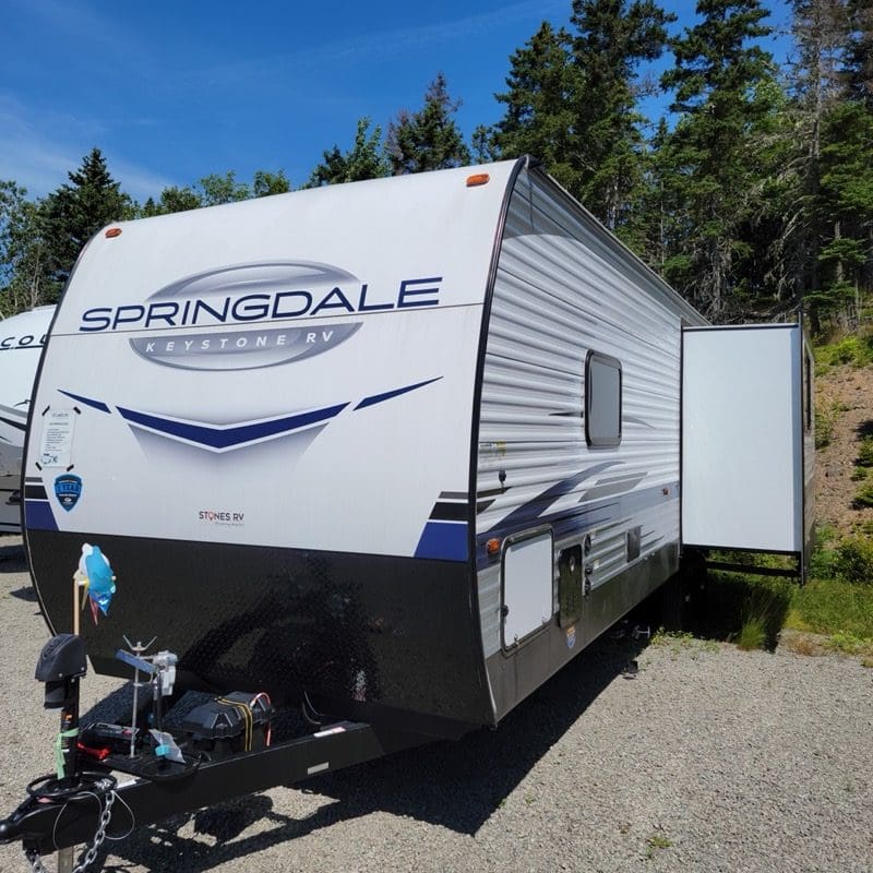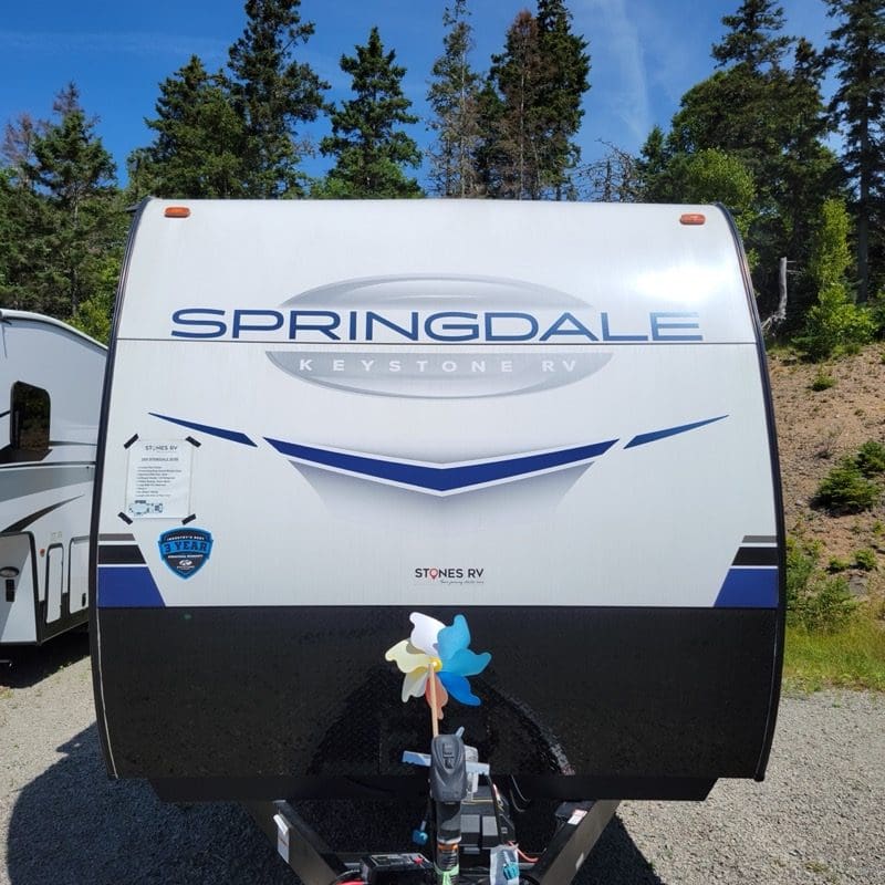 Available at Stone’s RV, the 2024 Keystone Springdale 281RK is a 33-foot travel trailer featuring a rear kitchen floor plan with dual slide-outs. This unit sleeps four people and offers an open-concept living area with theater seating and U-shaped dinette. The layout includes a front queen bedroom, full walk-through bathroom, and rear kitchen with dual pantries. Dry weight 7,411 lbs, GVWR 9,620 lbs, hitch weight 825 lbs.