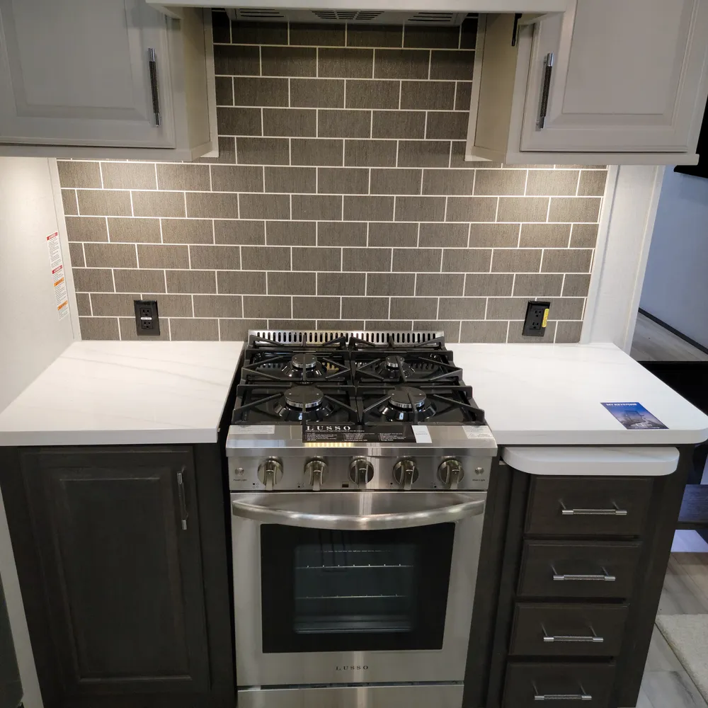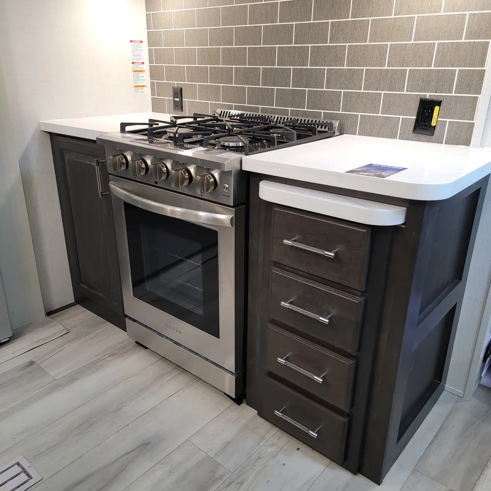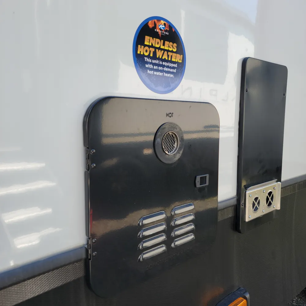 Built for the camping season. The Alpine 3303CK features heated and enclosed underbelly protection, an on-demand water heater, and in-floor heating ducts to keep you comfortable from spring through fall at Atlantic Canada campgrounds. The exterior includes Lippert strut-assisted SolidSteps, Hitch Vision with LED lighting, a power patio awning with adjustable arms, slide awnings, an outside shower with hot and cold water, and 200 cubic feet of heated basement storage with class A style dual-latch slam doors.