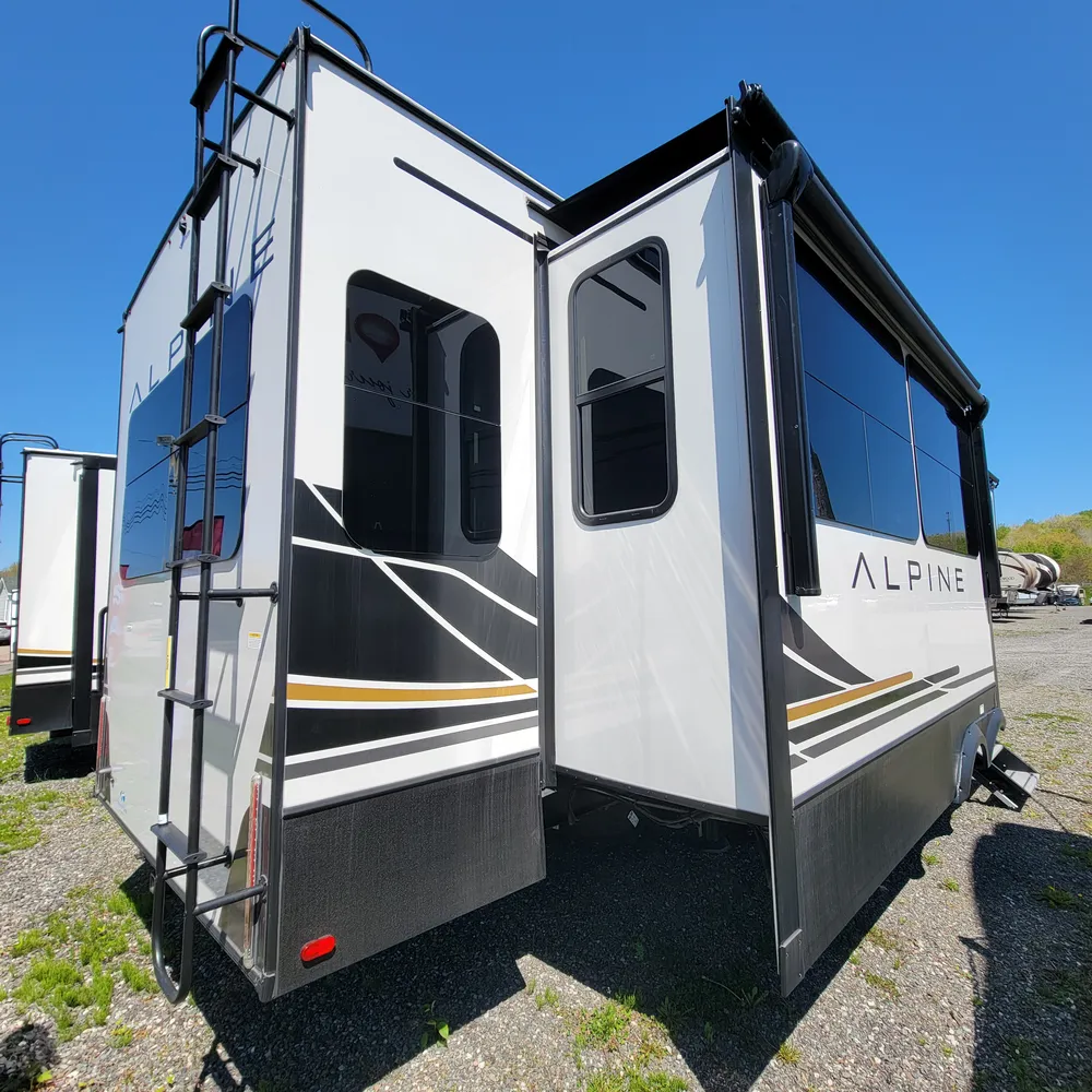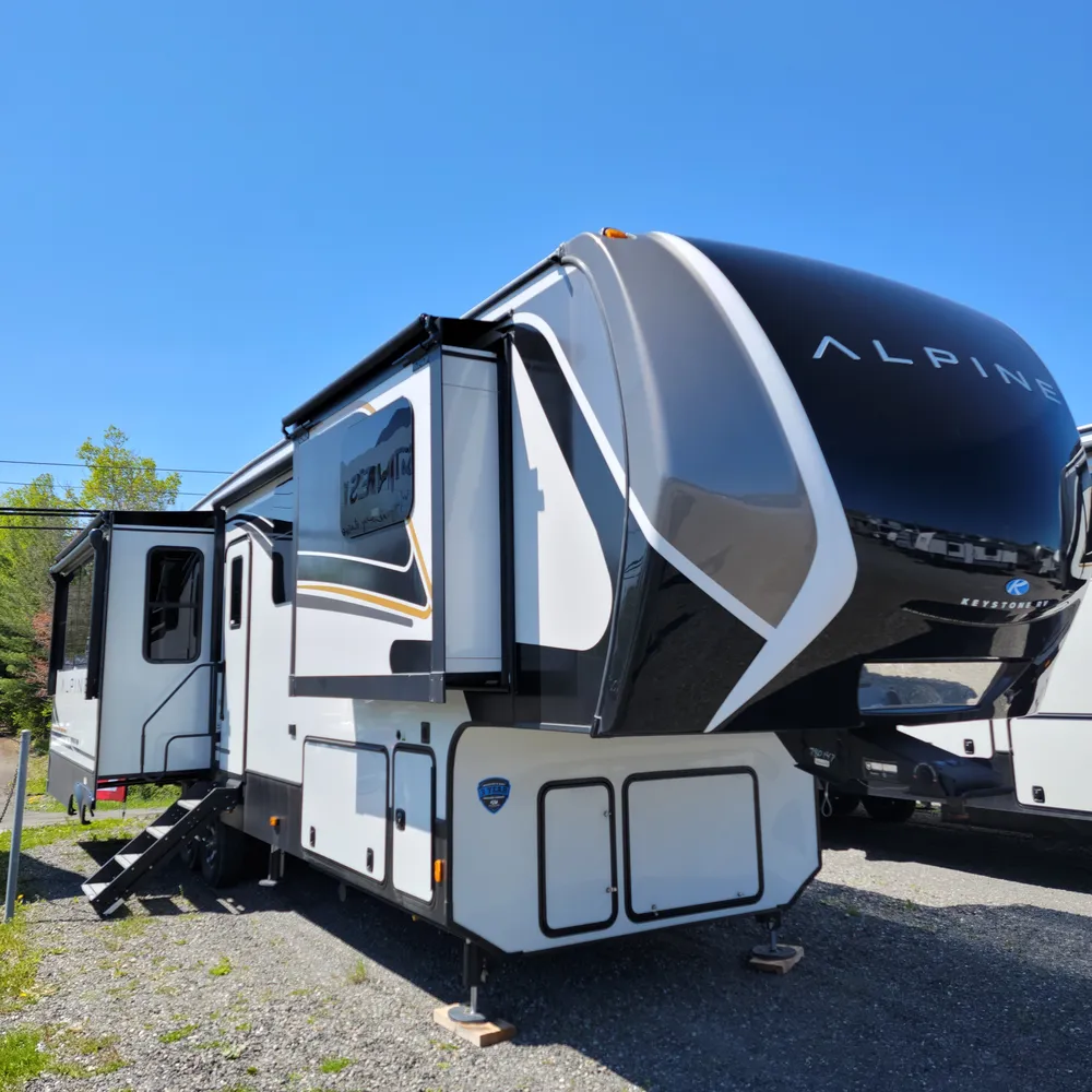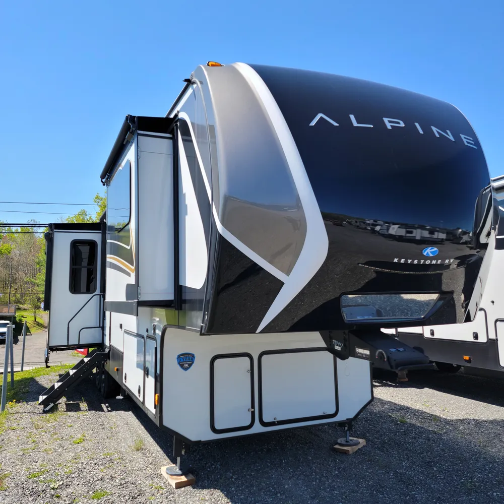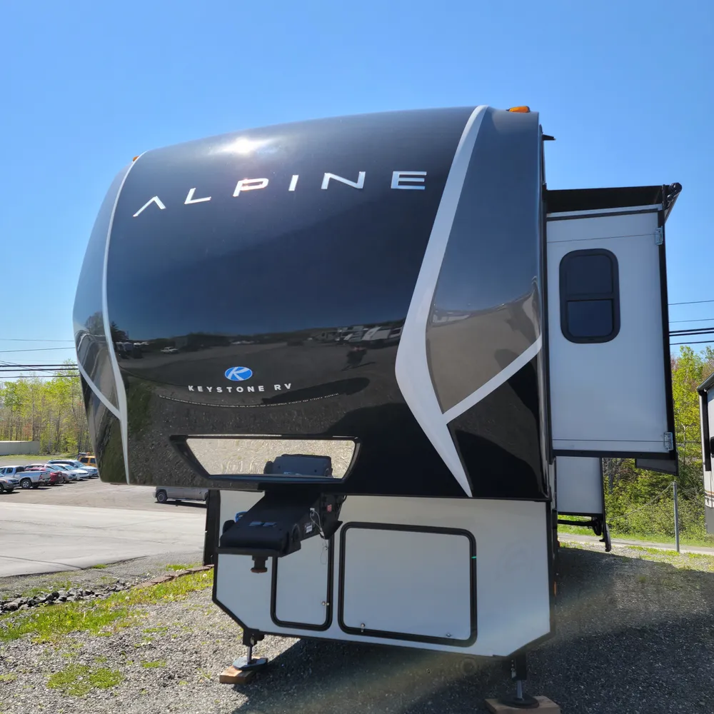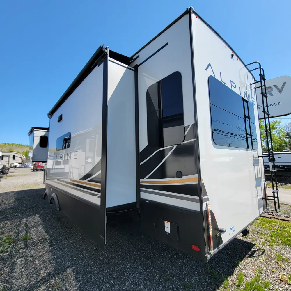 The 2025 Keystone Alpine 3303CK is a 37-foot luxury fifth wheel that sleeps four and offers expansive wide-body living at 100 inches wide. With a dry weight of 13,060 lbs, a GVWR of 16,500 lbs, and a pin weight of 2,560 lbs, the Alpine 3303CK delivers premium residential comfort with 8’4″ wide-body construction and nearly seven-foot slide height.