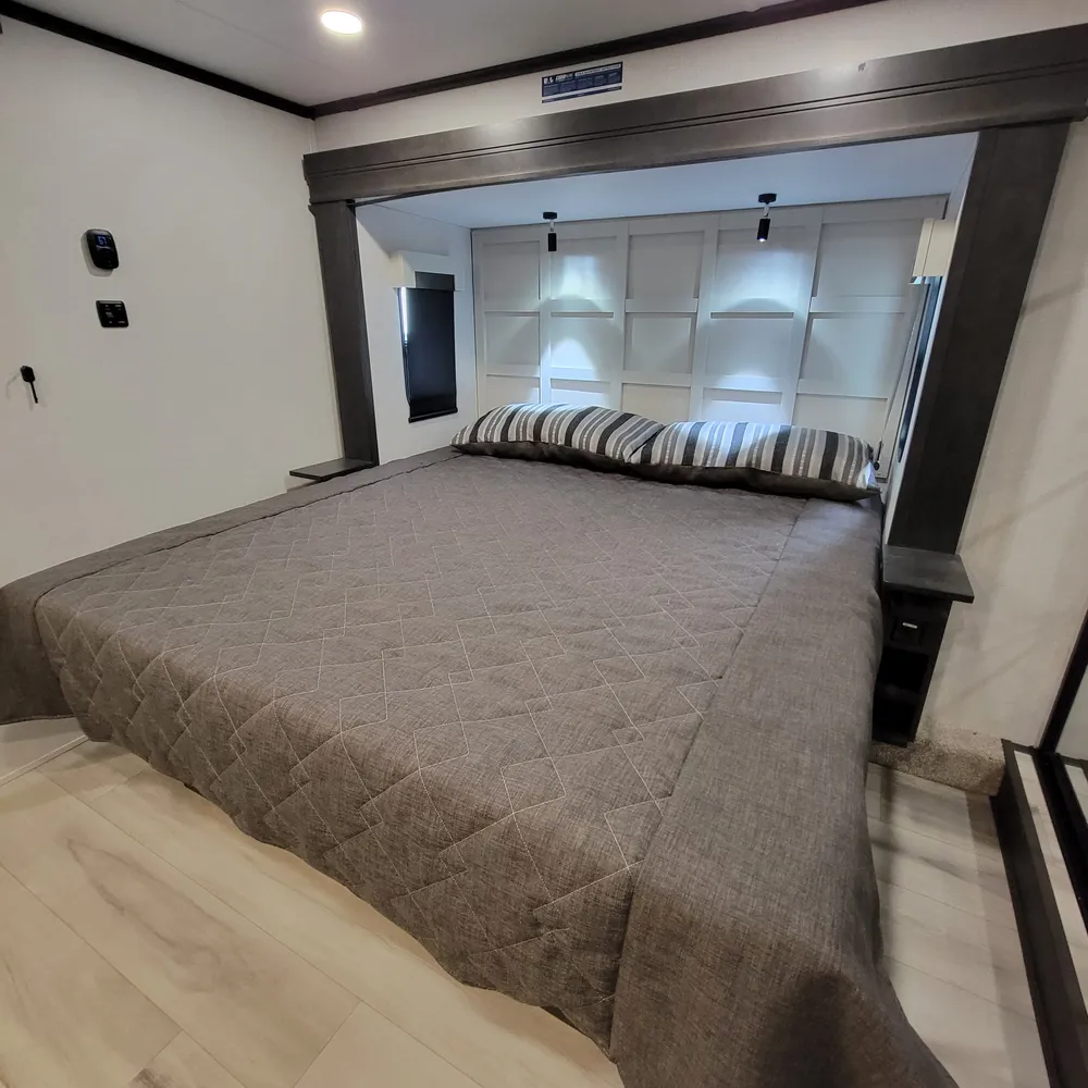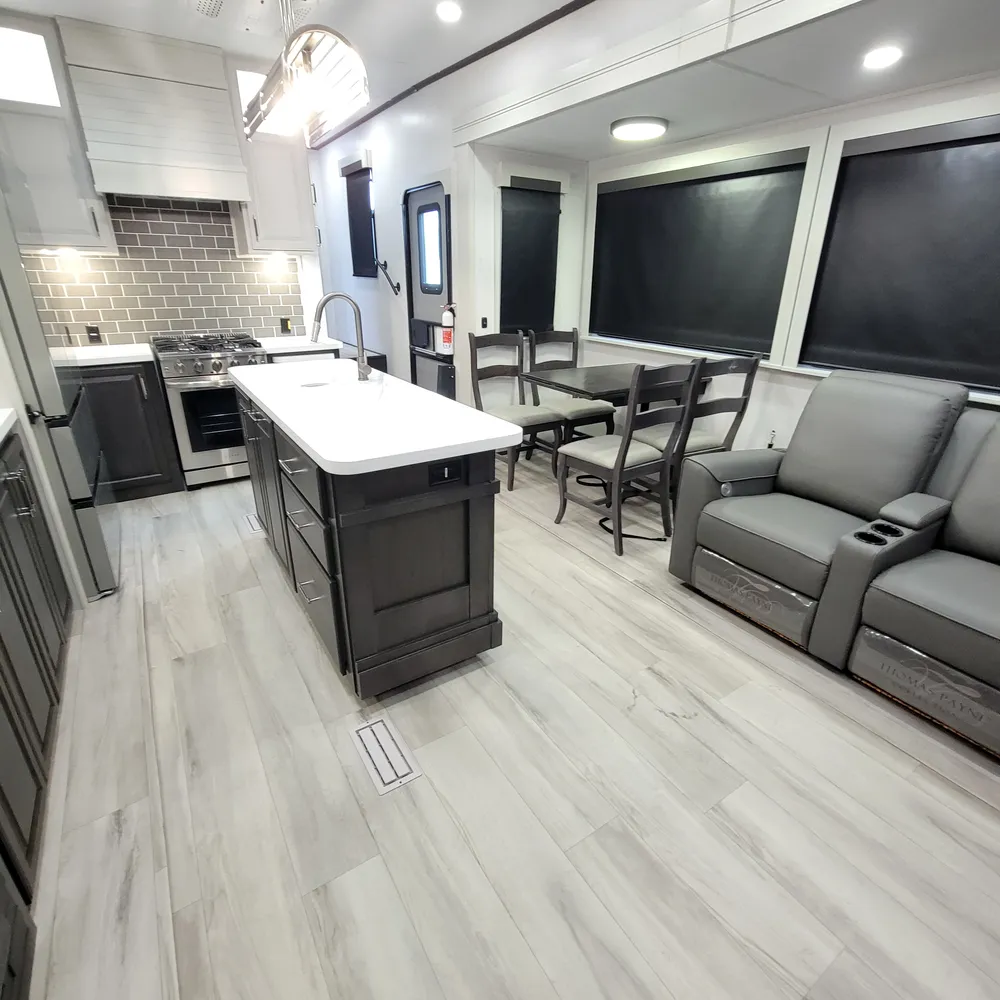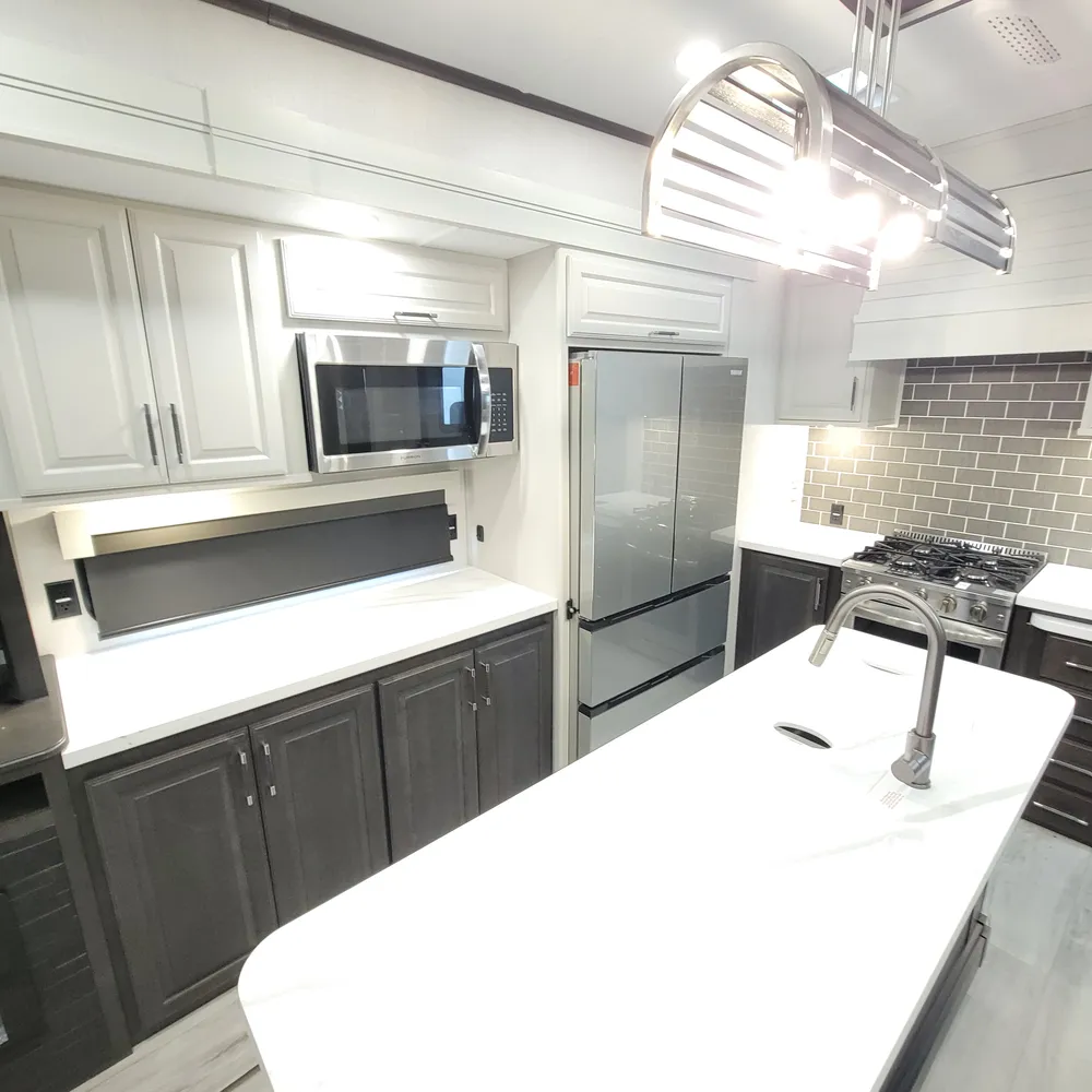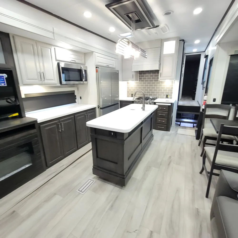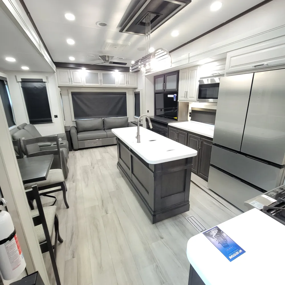 The 2025 Keystone Alpine 3303CK is a 37-foot luxury fifth wheel that sleeps four and offers expansive wide-body living at 100 inches wide. With a dry weight of 13,060 lbs, a GVWR of 16,500 lbs, and a pin weight of 2,560 lbs, the Alpine 3303CK delivers premium residential comfort with 8’4″ wide-body construction and nearly seven-foot slide height.