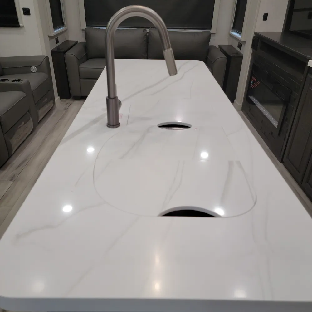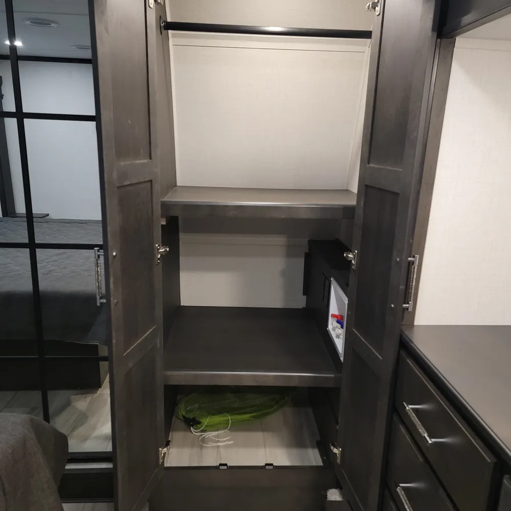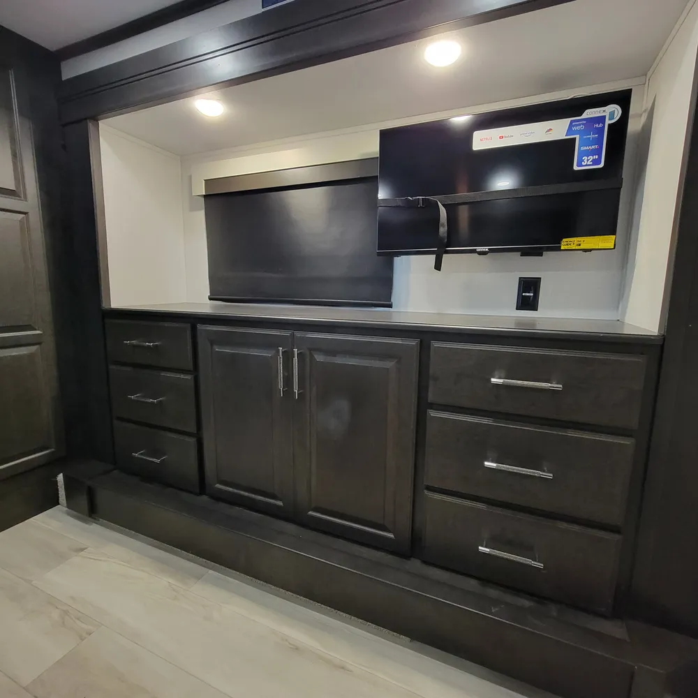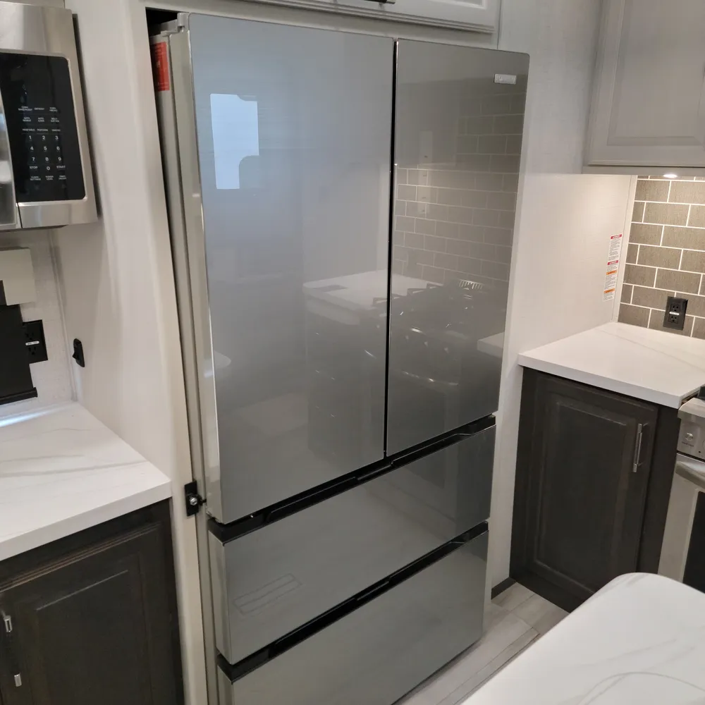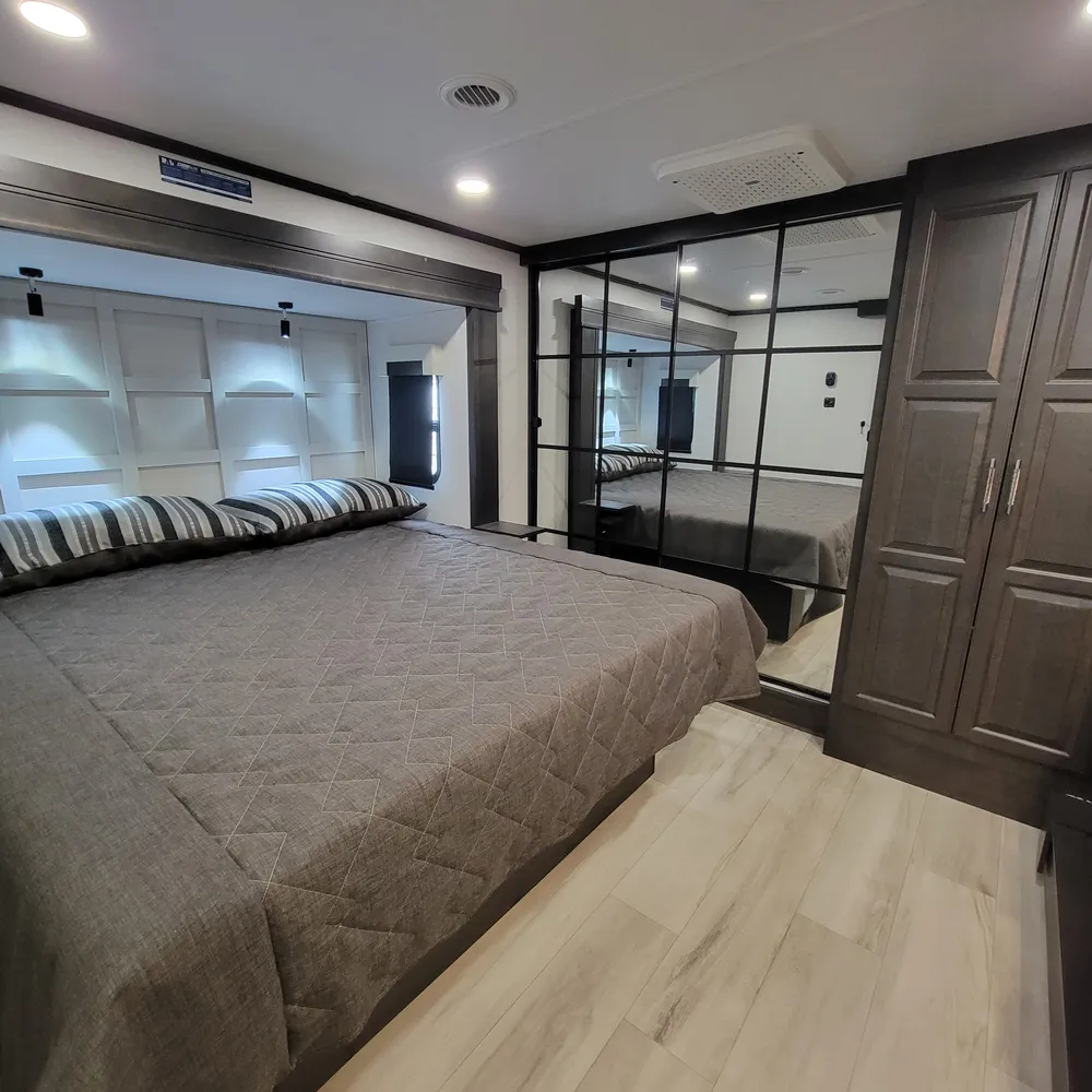 The 2025 Keystone Alpine 3303CK is a 37-foot luxury fifth wheel that sleeps four and offers expansive wide-body living at 100 inches wide. With a dry weight of 13,060 lbs, a GVWR of 16,500 lbs, and a pin weight of 2,560 lbs, the Alpine 3303CK delivers premium residential comfort with 8’4″ wide-body construction and nearly seven-foot slide height.