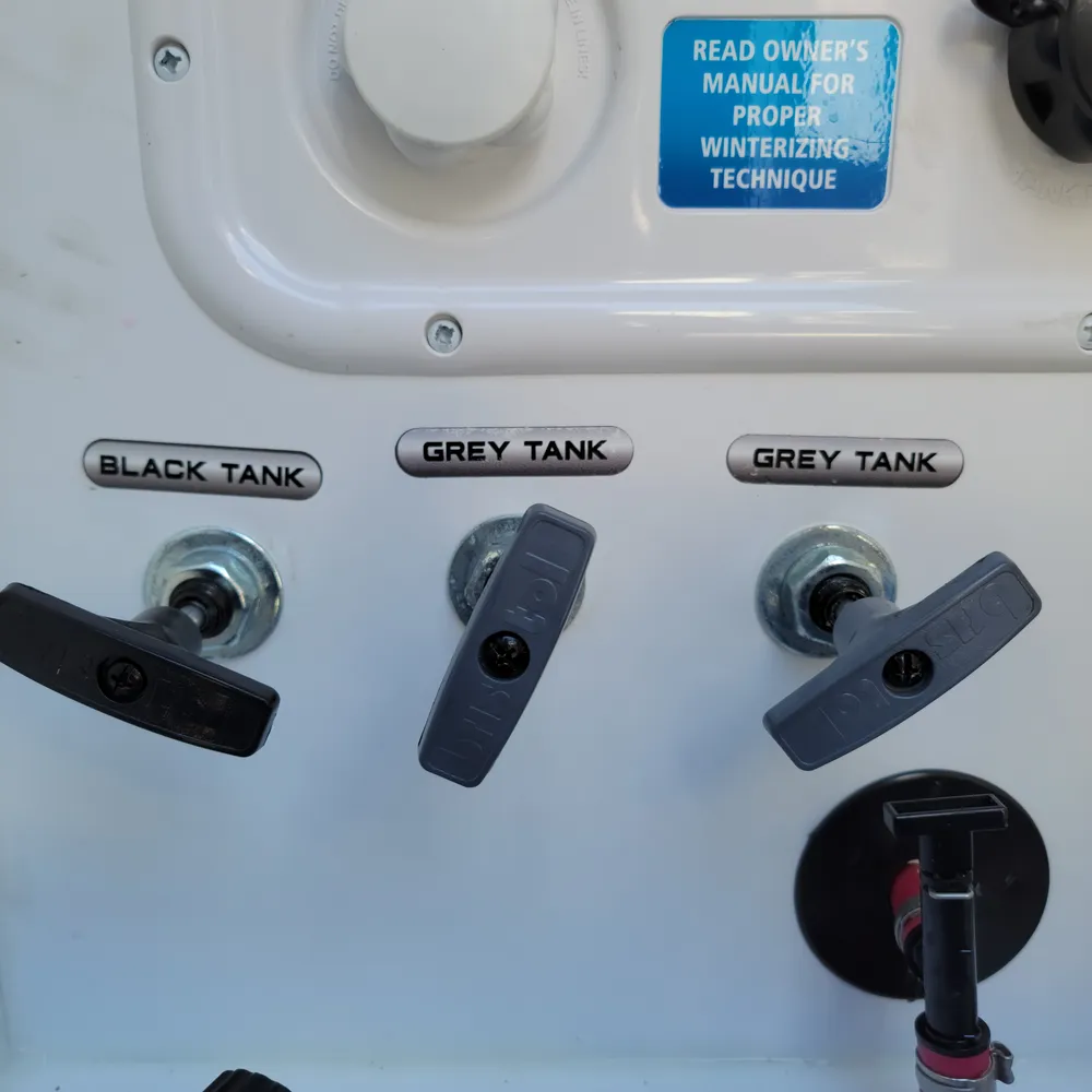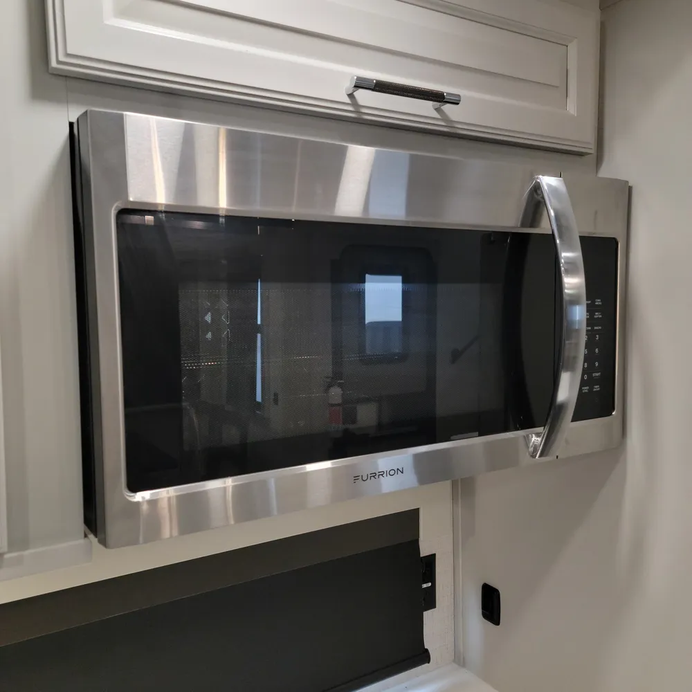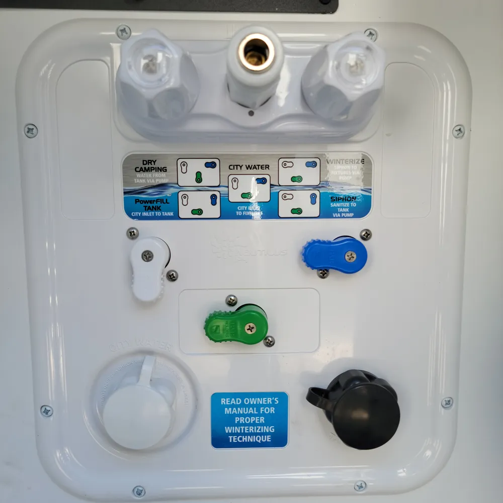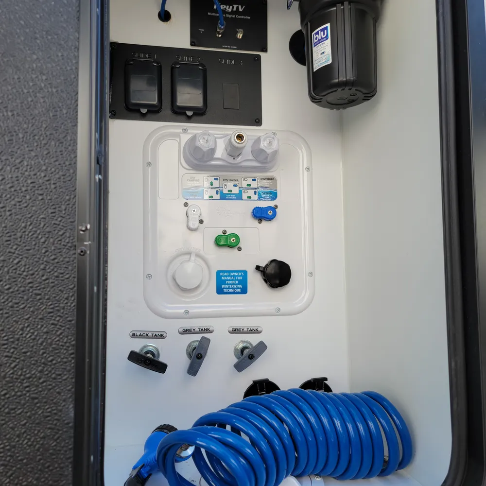 The Blade Pure airflow system provides dual Quiet Cool 15,000 BTU ACs with an electric pump and cold air return vents. The rear AC includes a 16,500 BTU heat pump paired with a 35,000 BTU gas furnace.