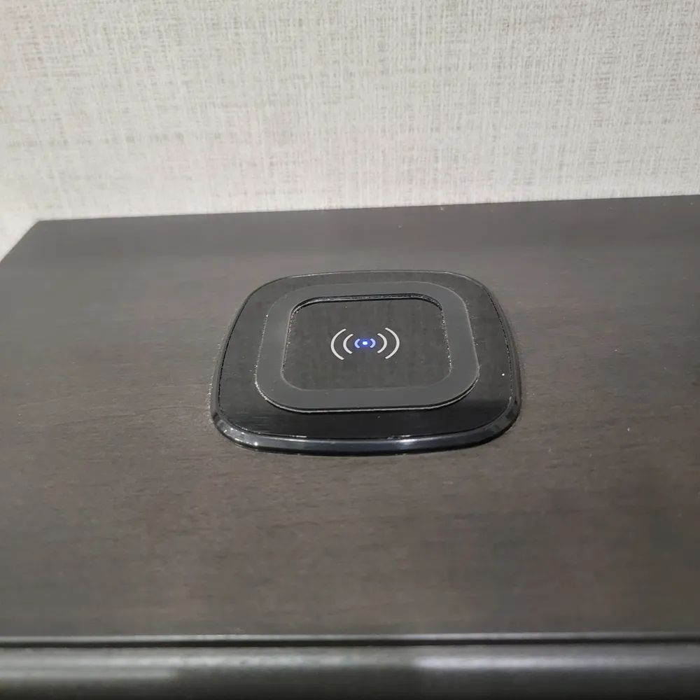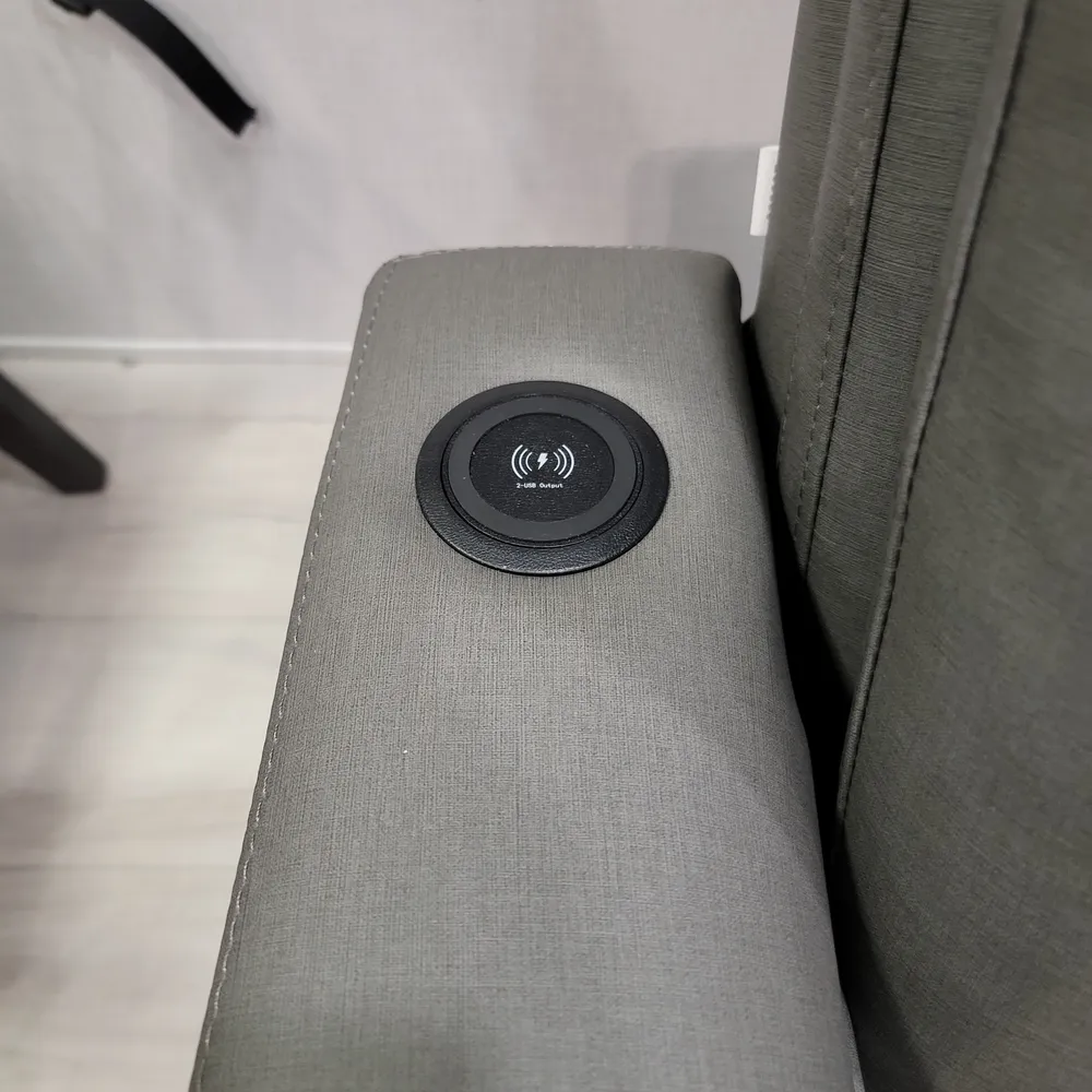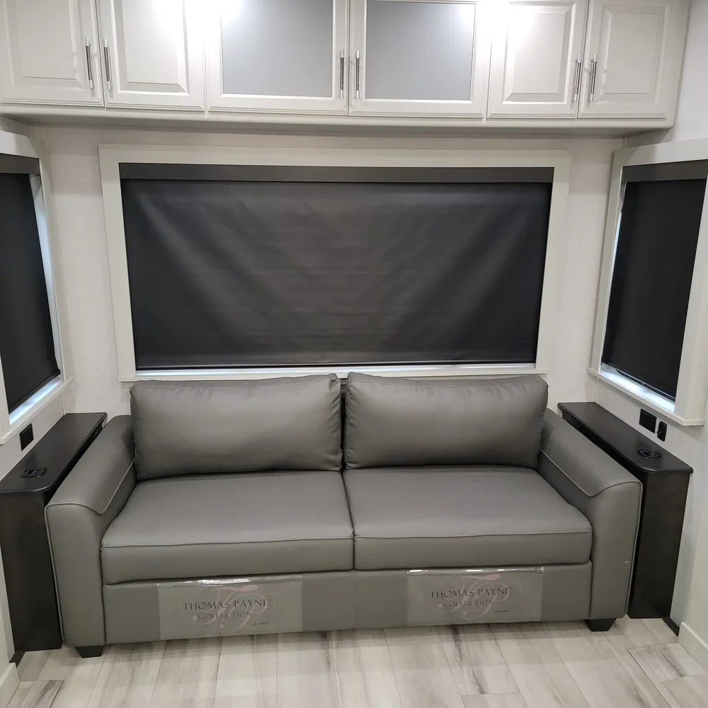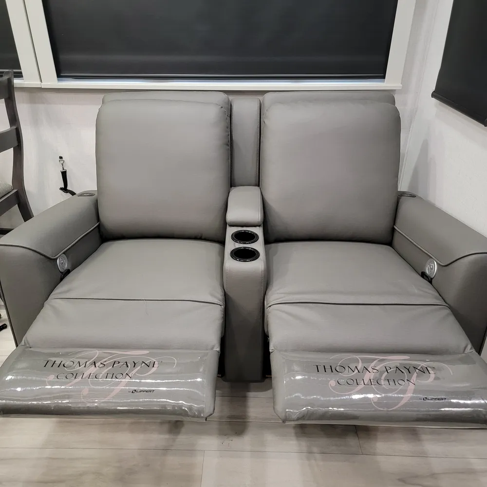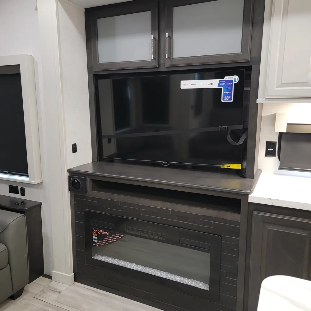 The rear living area features theater seating with heat, massage, and USB charging stations positioned across from a 40-inch fireplace and entertainment center with a 50-inch LED TV and sound system. A hide-a-bed sofa sleeper provides additional sleeping space for guests.