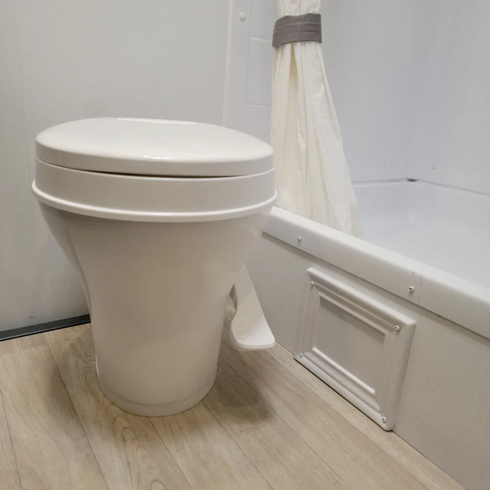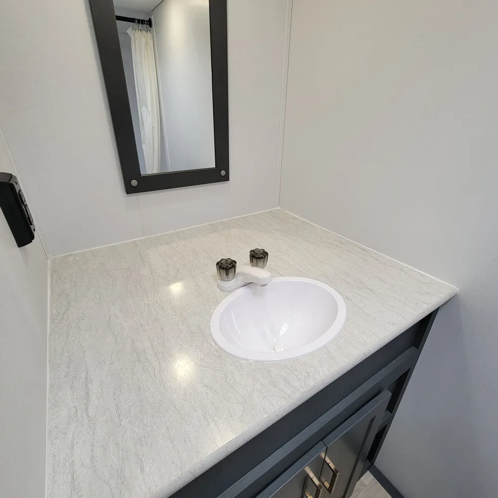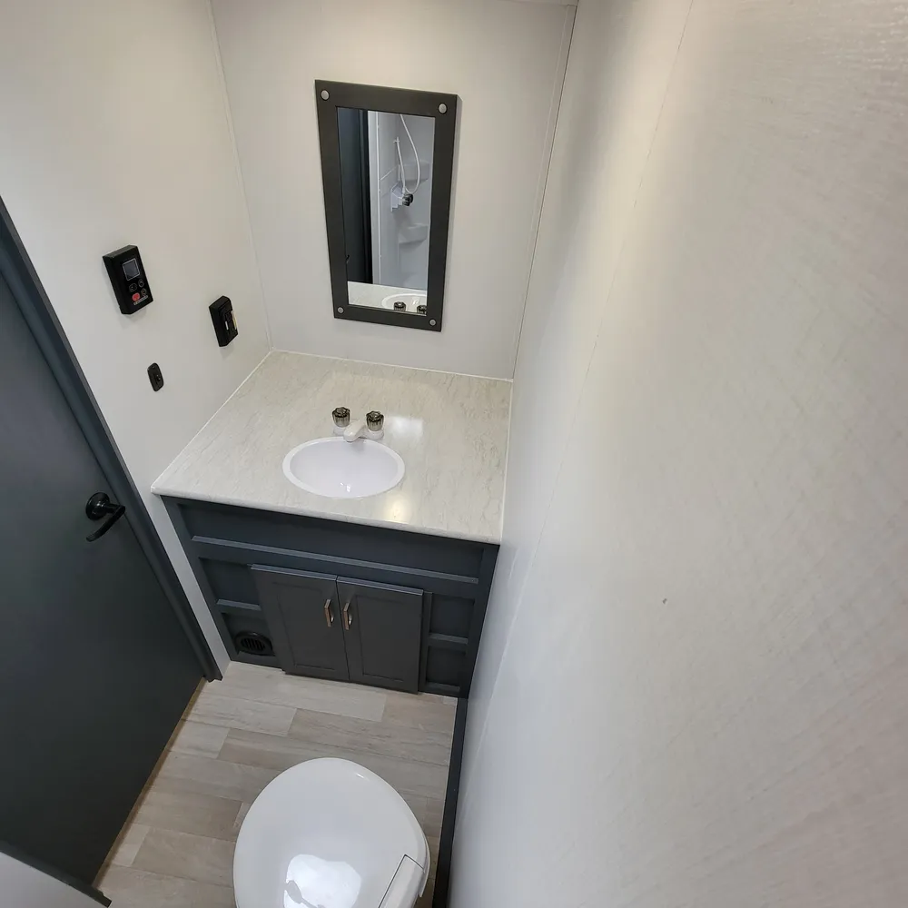 The full rear bathroom includes a toilet, shower, sink with residential-style vanity, and medicine cabinet. Pass-through storage underneath keeps camping gear organized and easy to access.
