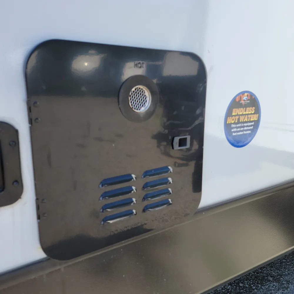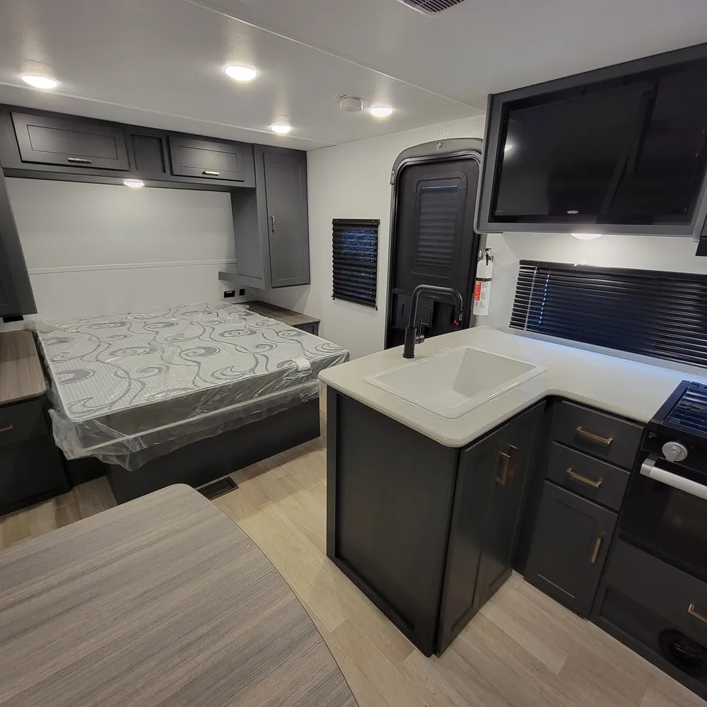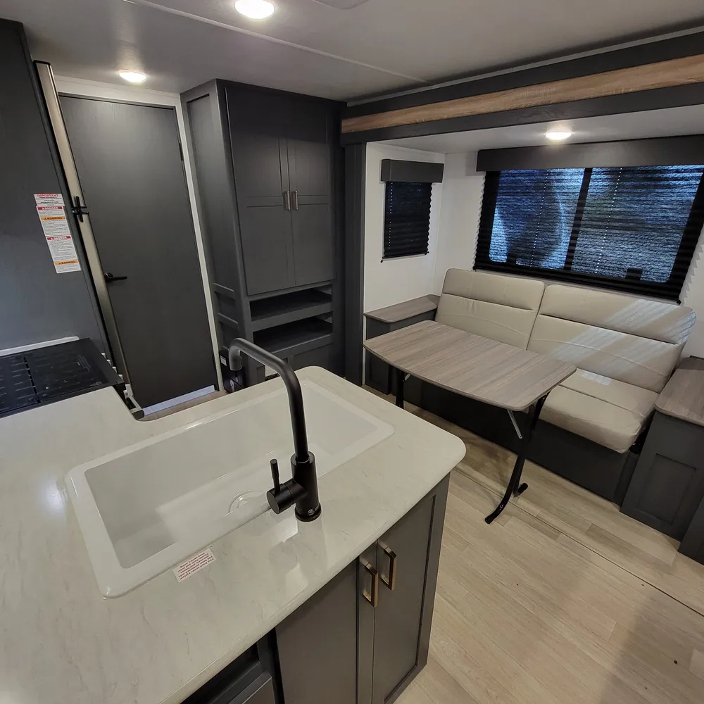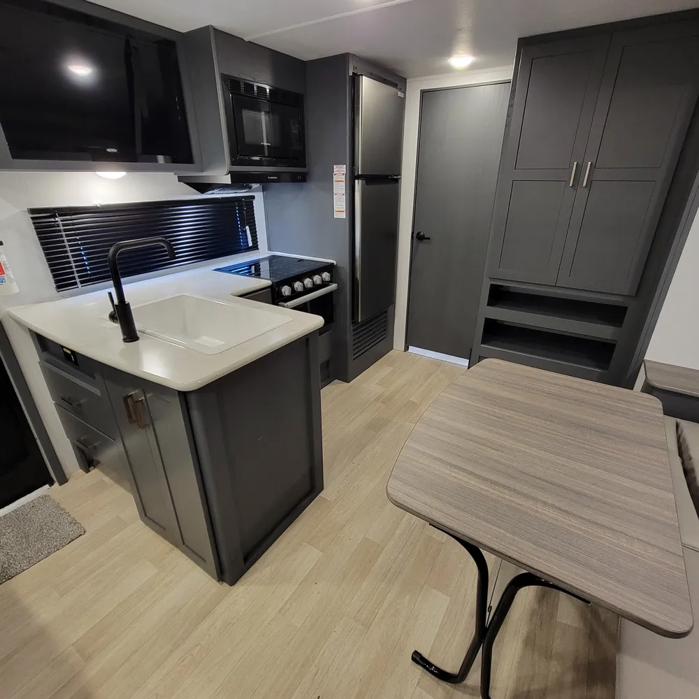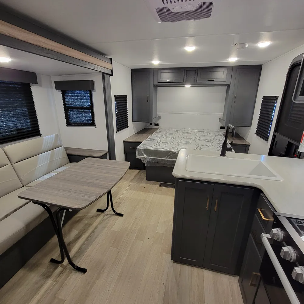 Equipped for the camping season with a 15,000 BTU air conditioner and 30,000 BTU furnace. A tankless water heater, HyperDeck flooring, power awning, and exterior shower round out the package on this lightweight and capable travel trailer.