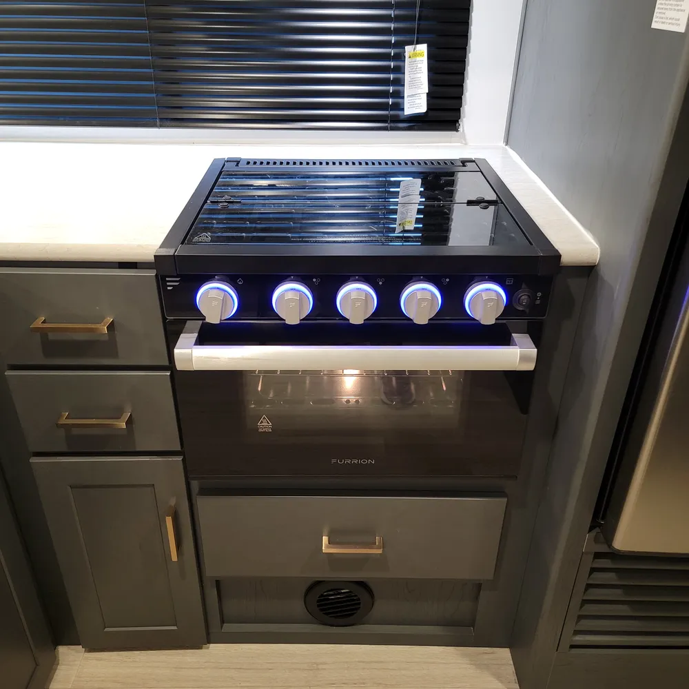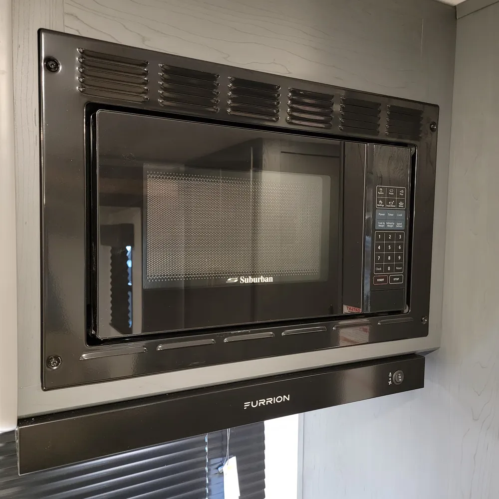 The 1840RB features one slideout with a jack-knife sofa that doubles as extra sleeping space. The mid-coach kitchen includes a 2-burner range with glass top, microwave, and 8 cubic foot refrigerator with seamless countertops and good storage throughout. The front queen bed has bedside wardrobes on each side, a privacy curtain, and bedside USB connections.