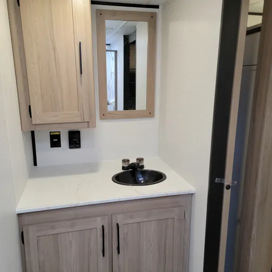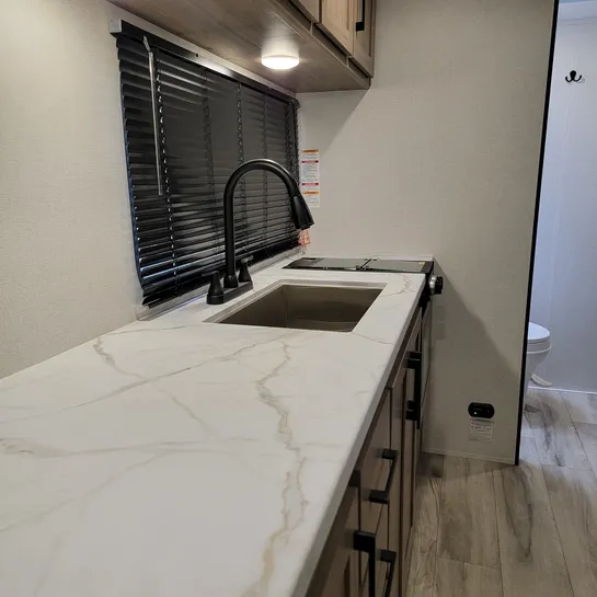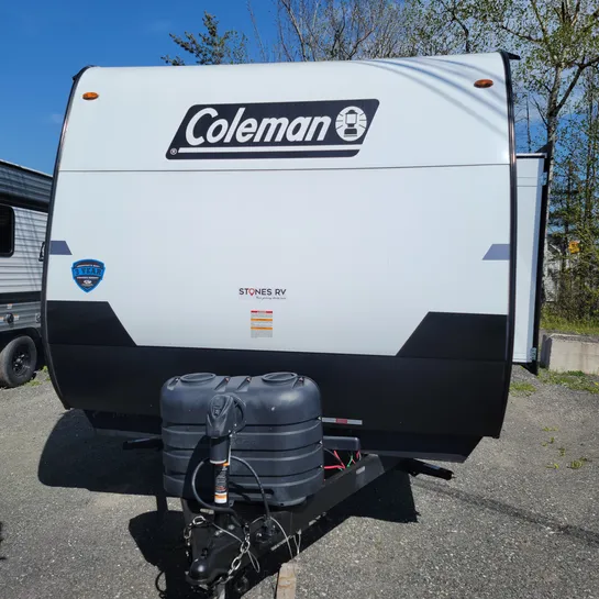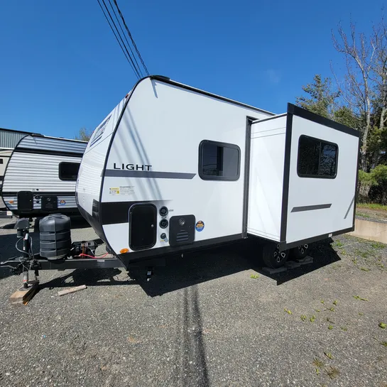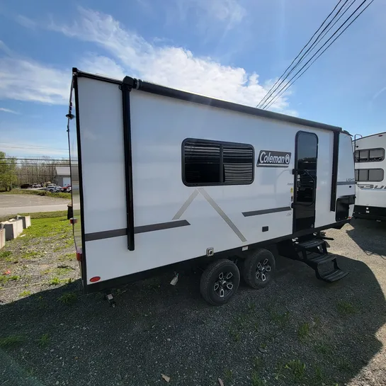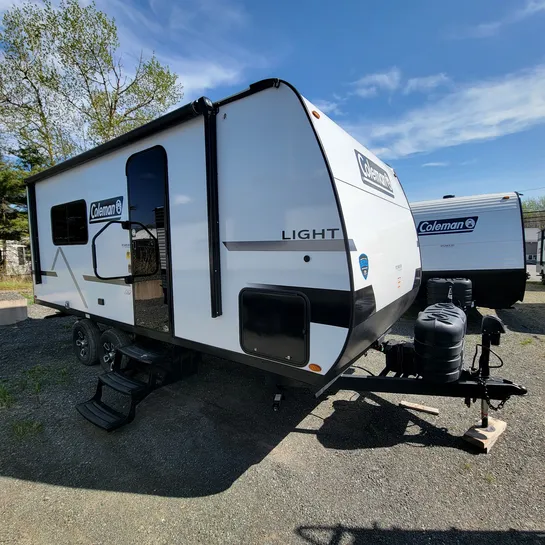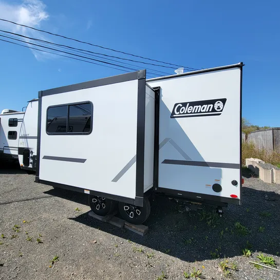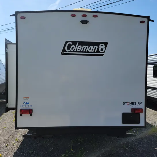 The 2025 Keystone Coleman Light 18RX features a spacious living area with a slide-out, a rear bathroom, a large kitchen countertop, and comfortable sleeping arrangements including a queen bed and a convertible sofa. Exterior features include a power awning, pass-through storage, and exterior shower.