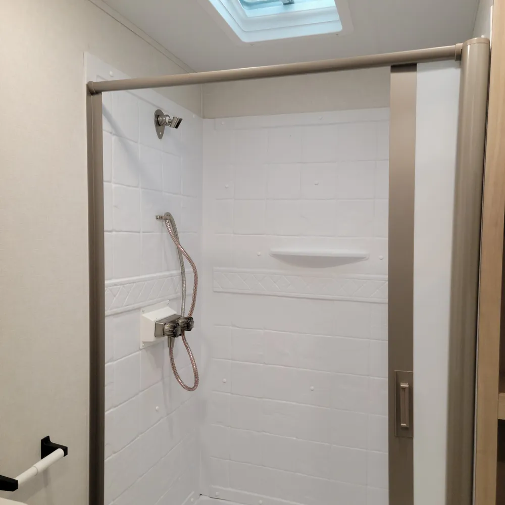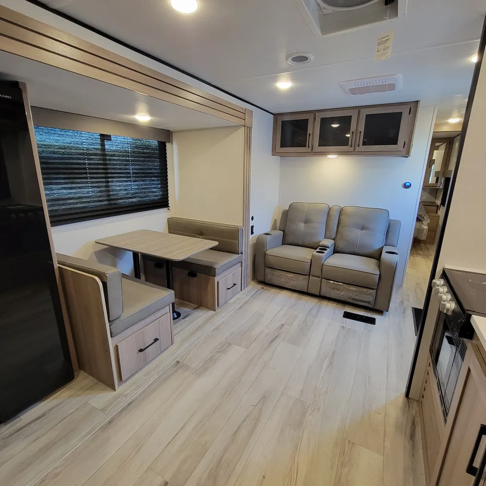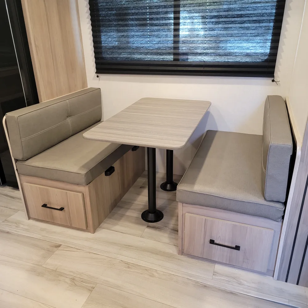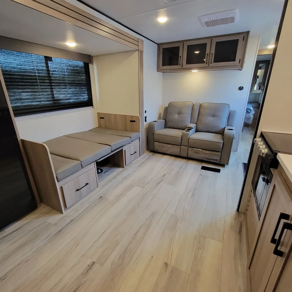 A Suburban tankless water heater, 15,000 BTU air conditioner, and 35,000 BTU furnace come standard. The 18′ power awning extends your outdoor living space and keeps things shaded on sunny Maritime afternoons.