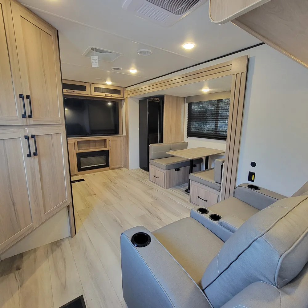 The 25REX puts the bedroom up front and the living area out back. Close the sliding door on the 70″x80″ king bed and the rest of the trailer is yours. The large slideout brings out theater seating and a booth dinette, both facing a 65″ LED TV with fireplace below. It’s a good place to be after a long day on the road.