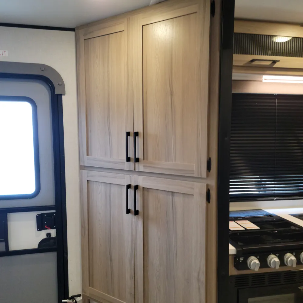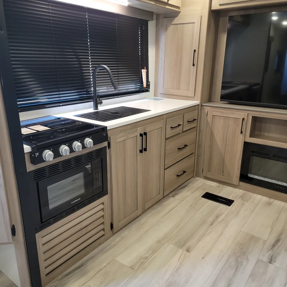 The rear kitchen has a three-burner range, air fryer/convection microwave, 16 cu. ft. refrigerator, solid surface countertops, and two pantries. The full bathroom sits between the bedroom and kitchen with a 30″x40″ shower, toilet, and vanity.