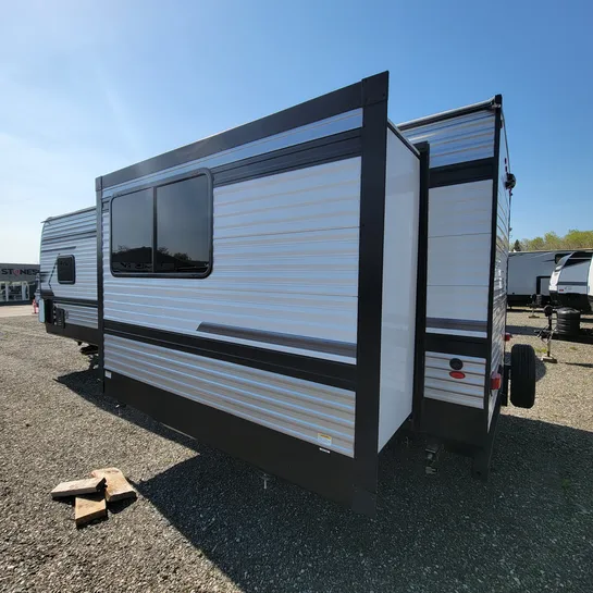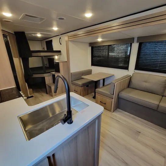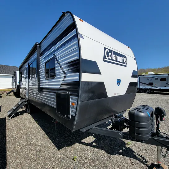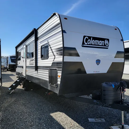 The 2025 Coleman Lantern 25REX is a travel trailer designed for families and adventurers, offering a combination of comfort, convenience, and style. It features a spacious open floor plan with a private master bedroom, a cozy dinette, and a fully equipped kitchen. The 25REX also includes a private master bedroom, a cozy dinette, and a fully equipped kitchen with modern appliances like a three-burner stove, microwave, and a large refrigerator. The bathroom is equipped with a full-size shower. The trailer also includes LED lighting, ample storage, and an entertainment center.