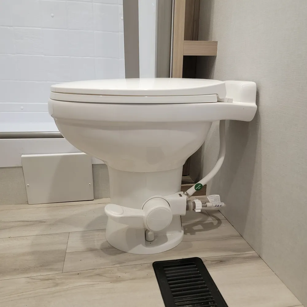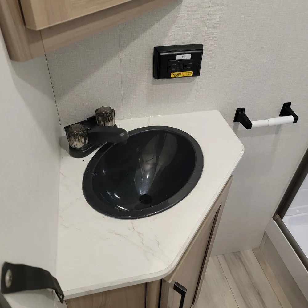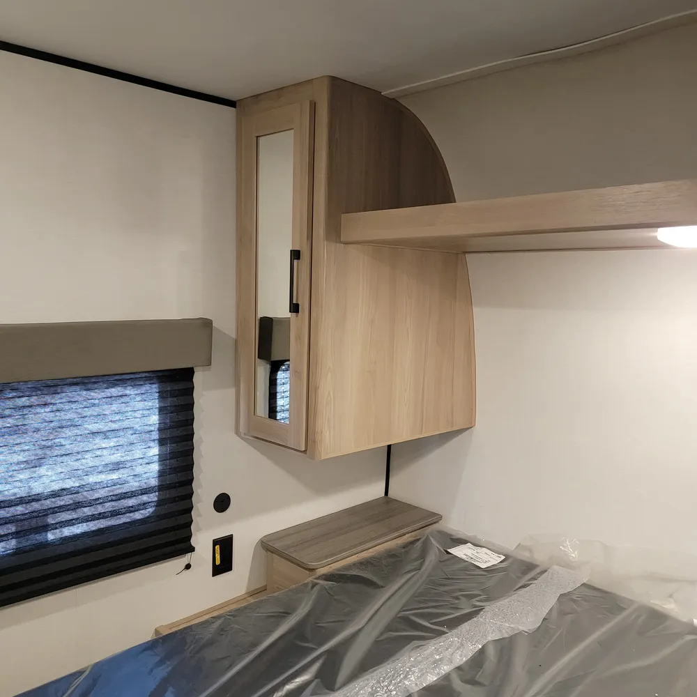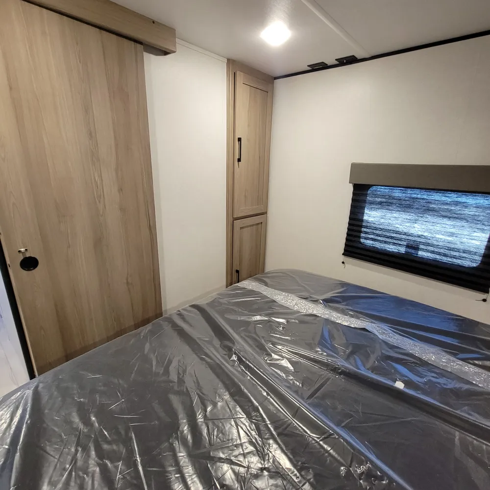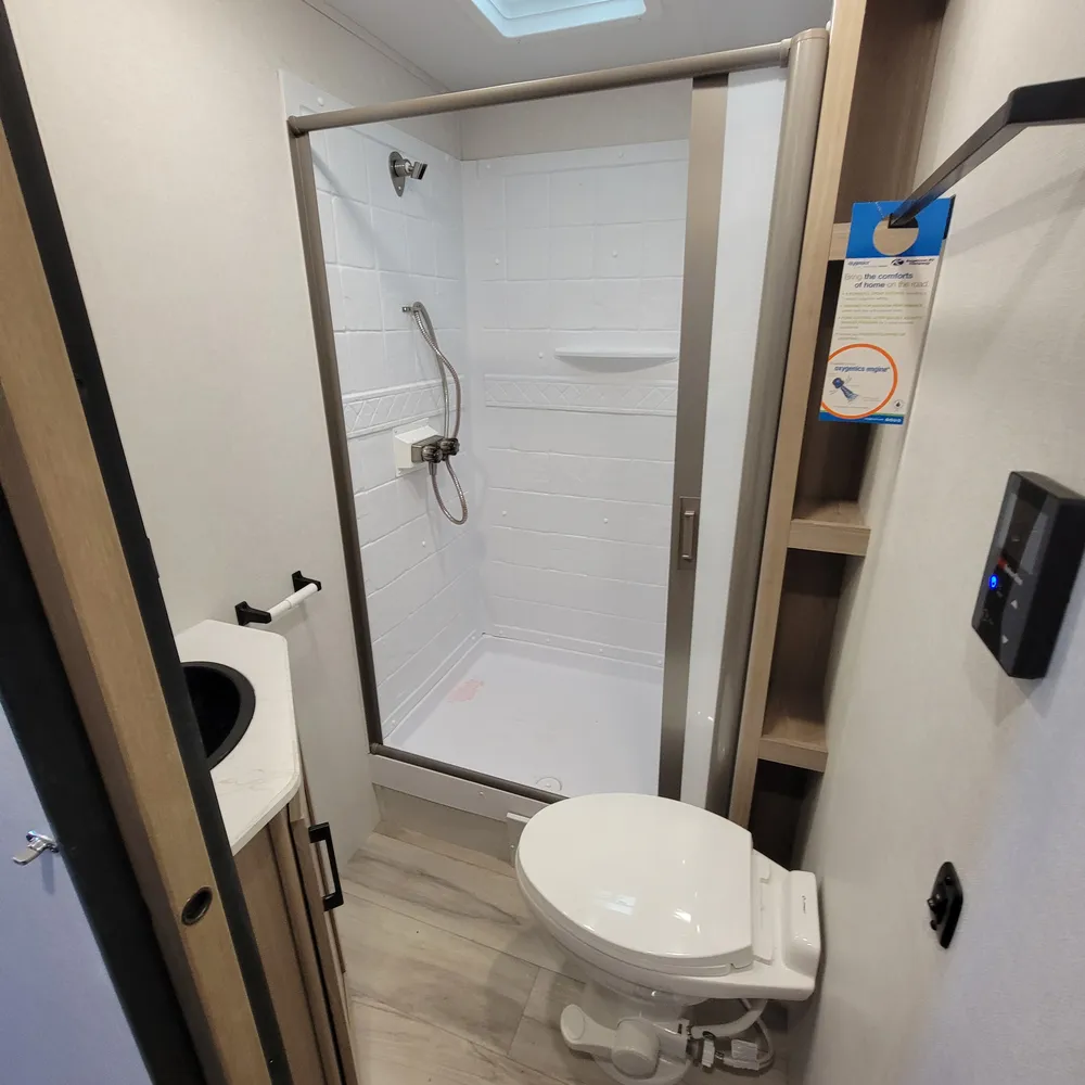 The front private bedroom has a 70″x80″ king bed with sliding doors for privacy. The full bathroom sits between the bedroom and living area with a 30″x40″ shower, toilet, vanity sink, and medicine cabinet.