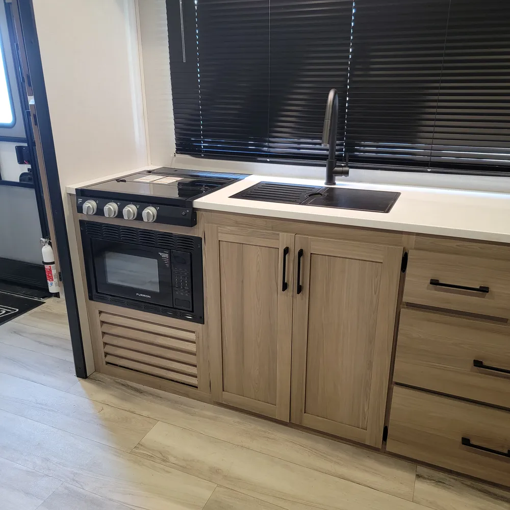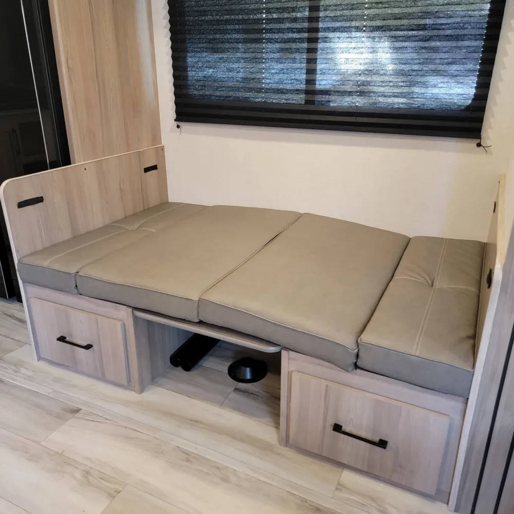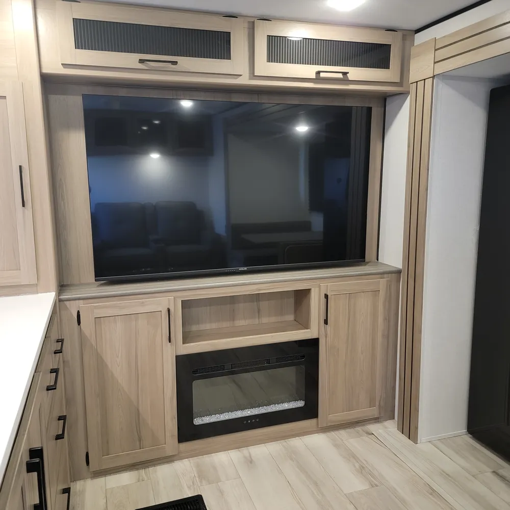 The 25REX is a front bedroom, rear living floorplan with one large slideout in the living area. The slideout brings out theater seating and a booth dinette, both facing a 65″ LED TV with fireplace below. The rear kitchen has a three-burner range, air fryer/convection microwave, 16 cu. ft. refrigerator, solid surface countertops, and two pantries. An 18′ power awning extends your outdoor space at the campsite.