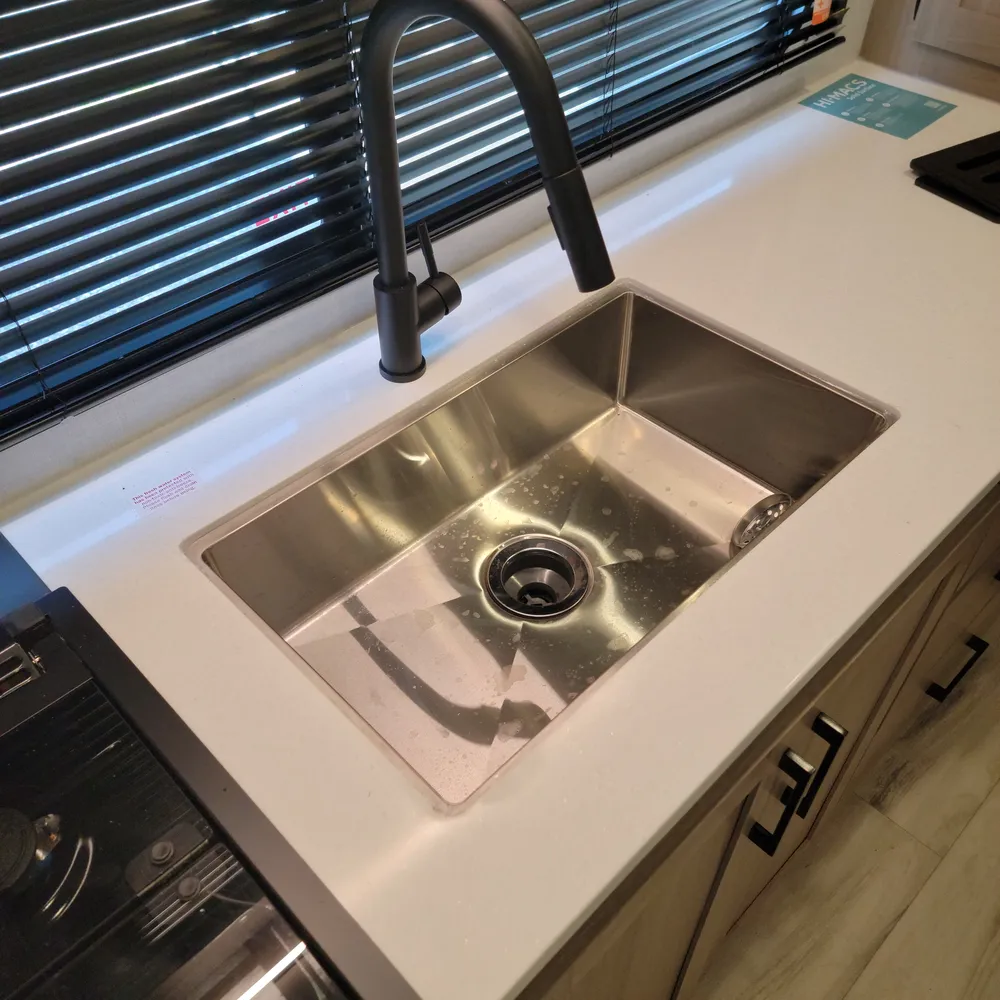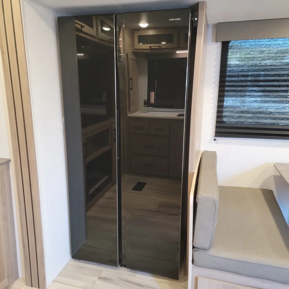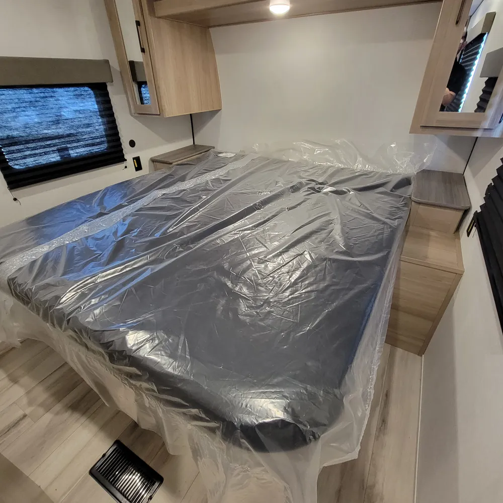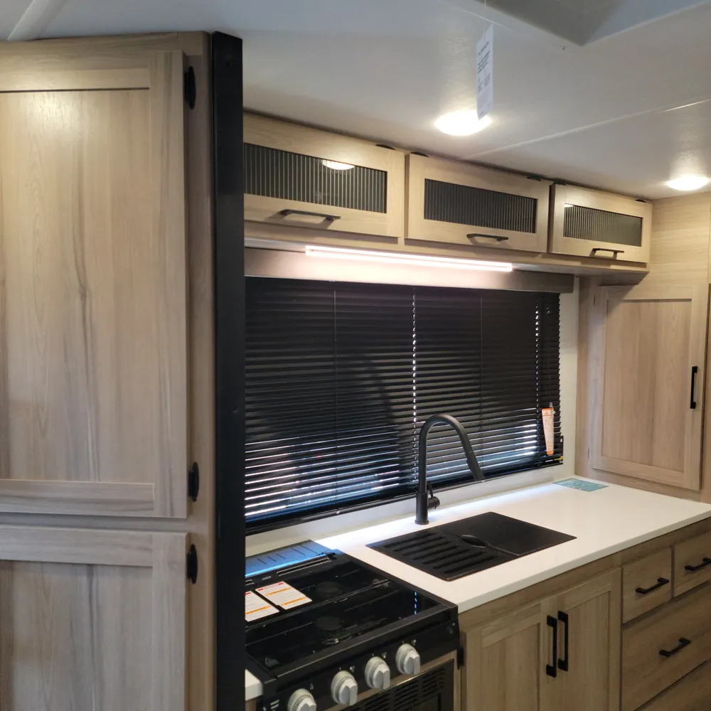 The 25REX is a front bedroom, rear living floorplan with one large slideout in the living area. The slideout brings out theater seating and a booth dinette, both facing a 65″ LED TV with fireplace below. The rear kitchen has a three-burner range, air fryer/convection microwave, 16 cu. ft. refrigerator, solid surface countertops, and two pantries. An 18′ power awning extends your outdoor space at the campsite.