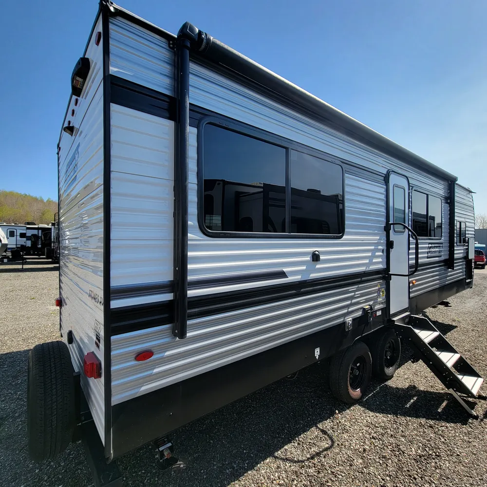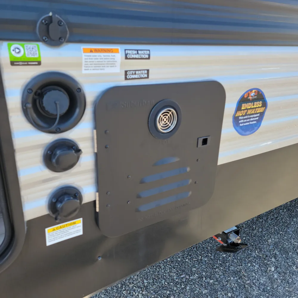 Equipped for the camping season with a 15,000 BTU air conditioner and 35,000 BTU furnace. A Suburban tankless water heater, power tongue jack, in-floor heating ducts, and full pass-through storage with tall doors are all standard on the Coleman Lantern 25REX.