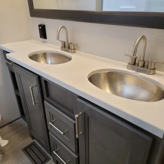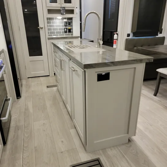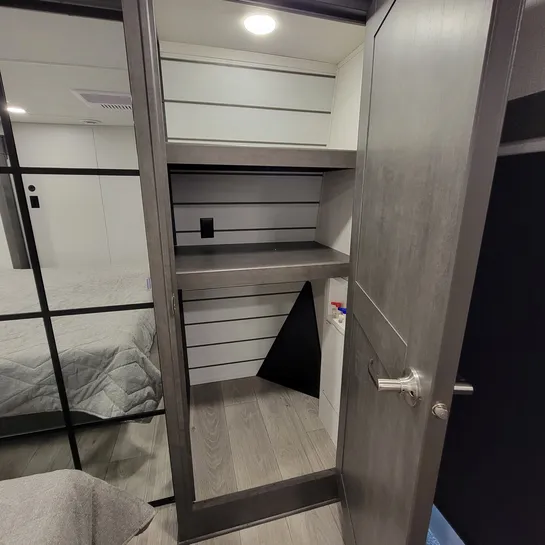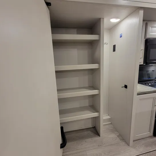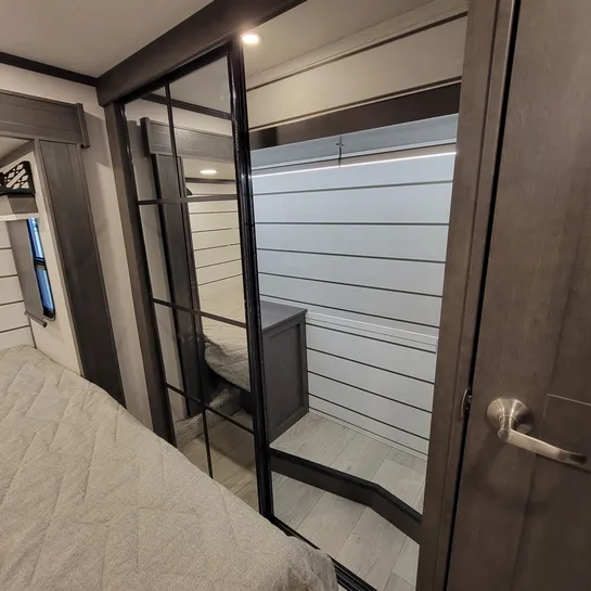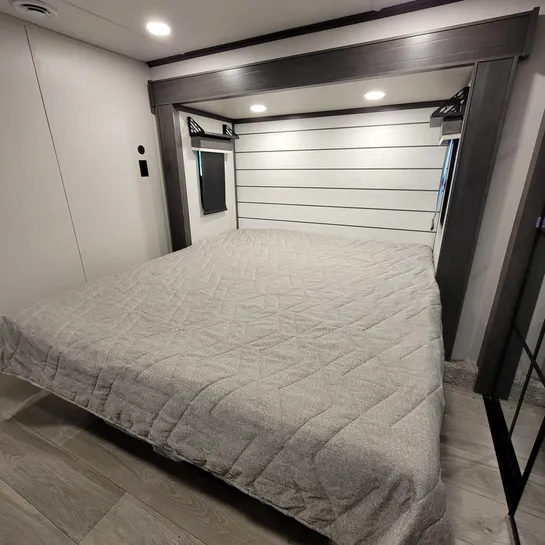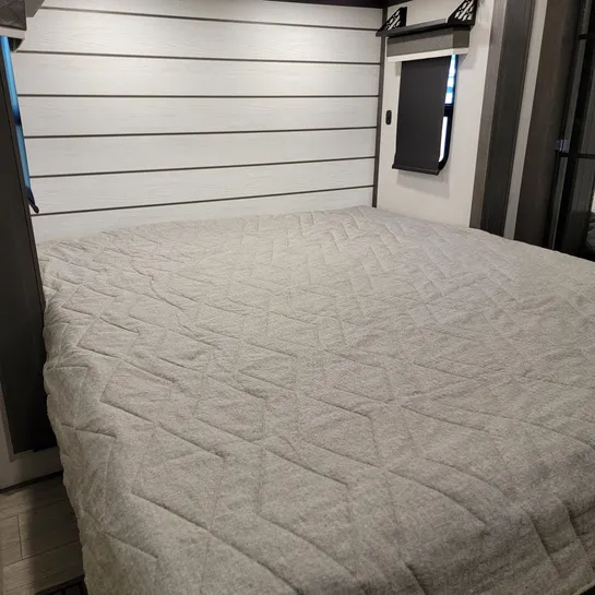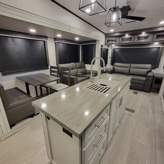 The 2025 Keystone Cougar 316RLS is a rear living fifth wheel known for its spacious layout and convenient features. The 316RLS includes a queen size bed in the private bedroom, a dual-sink vanity in the bathroom, and a kitchen island with opposing slides in the living area. The living area also features theater seating, a tri-fold sleeper sofa, and an entertainment center with a fireplace.