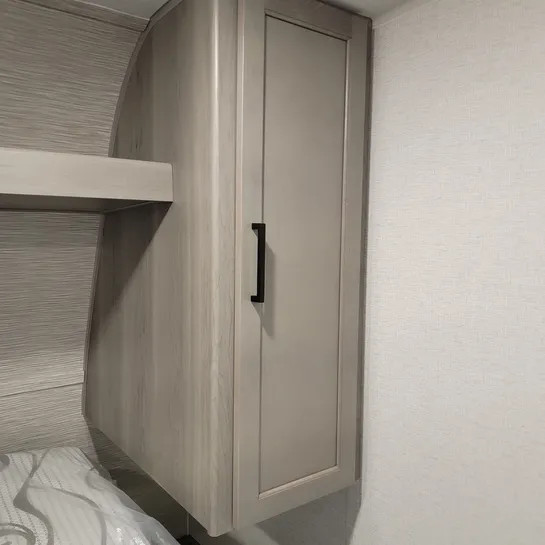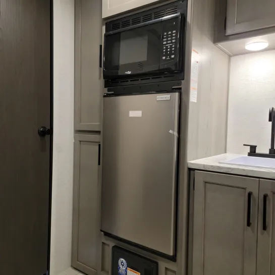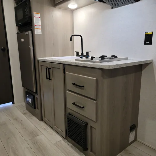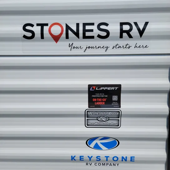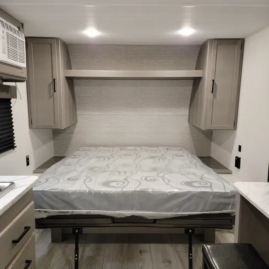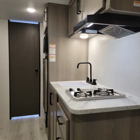 The 2025 Keystone RV Hideout Sport Single Axle 171MB is a compact, lightweight travel trailer with a Murphy bed, desk, kitchen pantry, and a 12′ awning. It features a full kitchen with a two-burner cooktop and refrigerator, plus a spacious full rear bath.