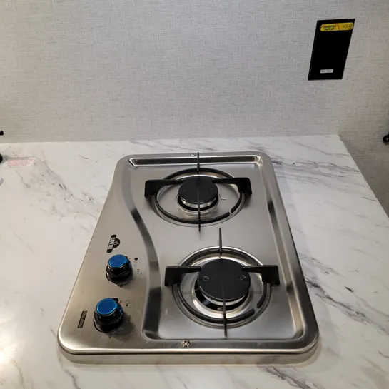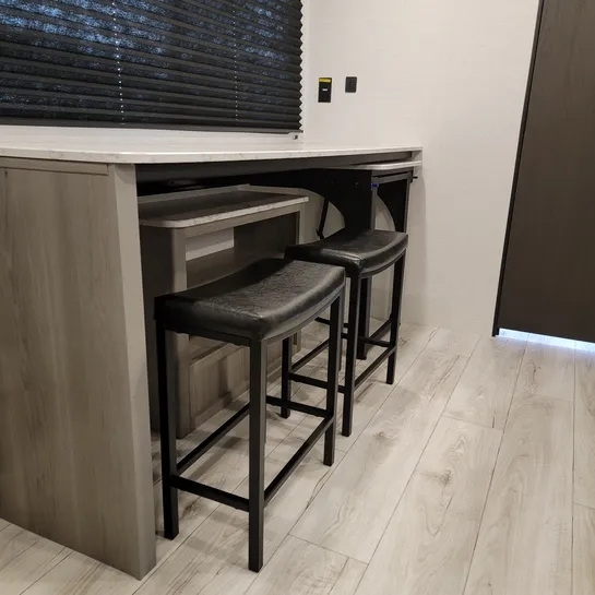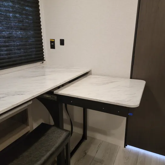 A desk with two chairs offers a space for dining or working while on the road.