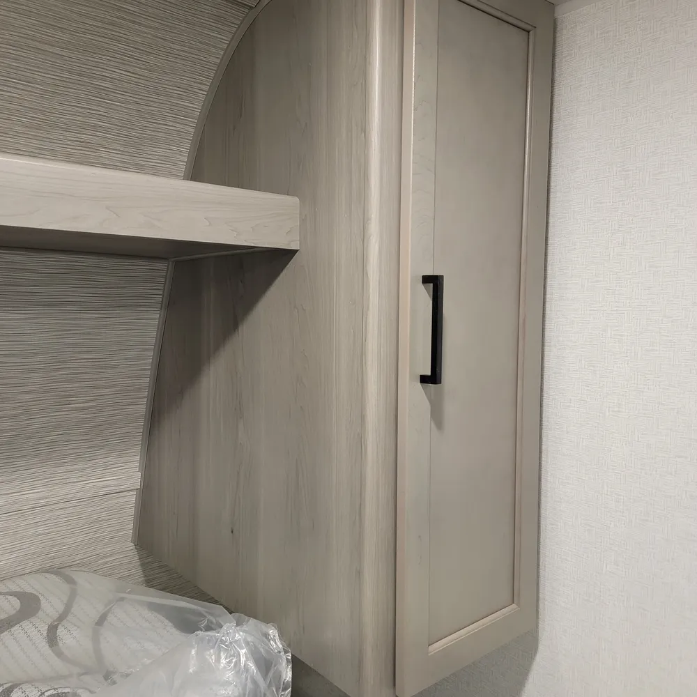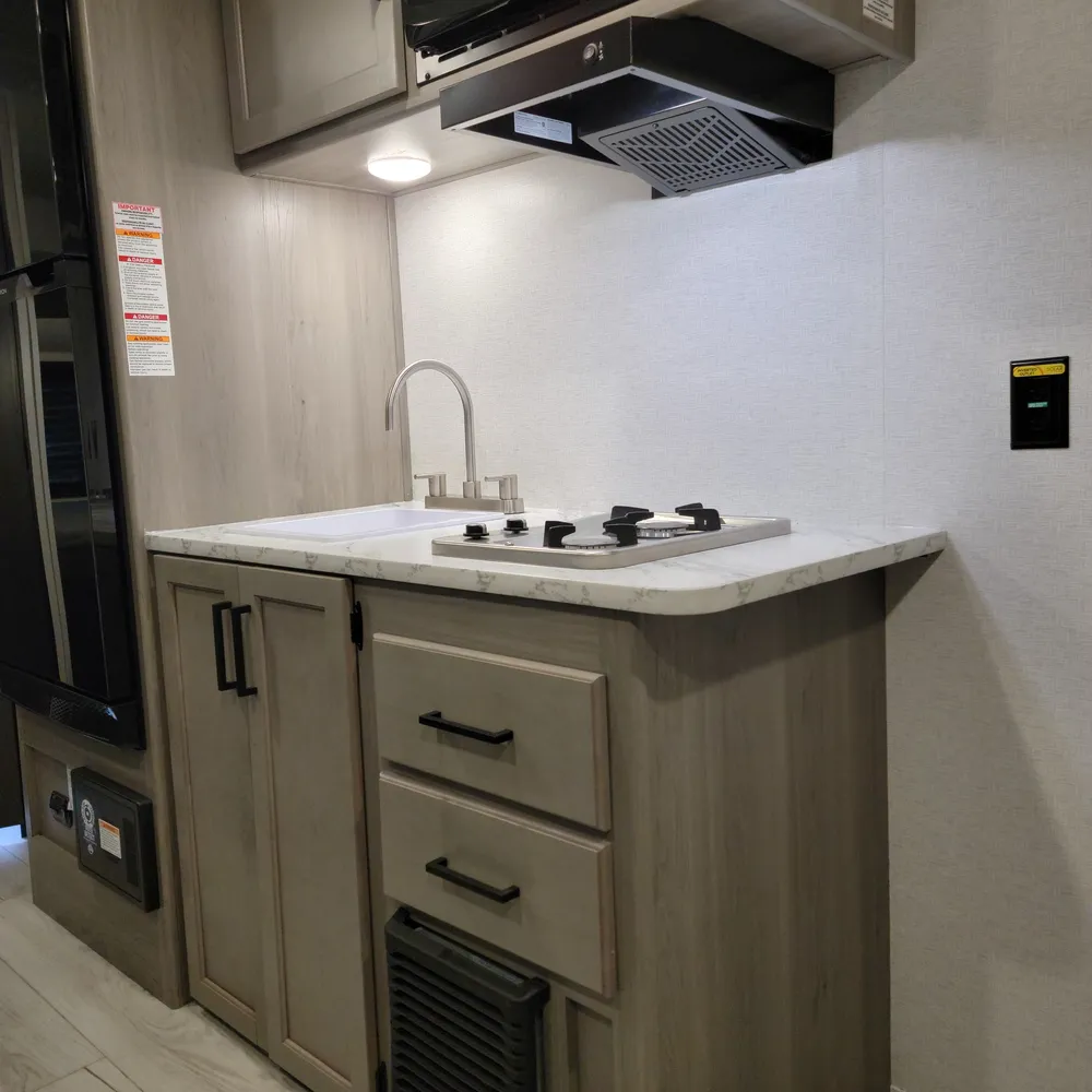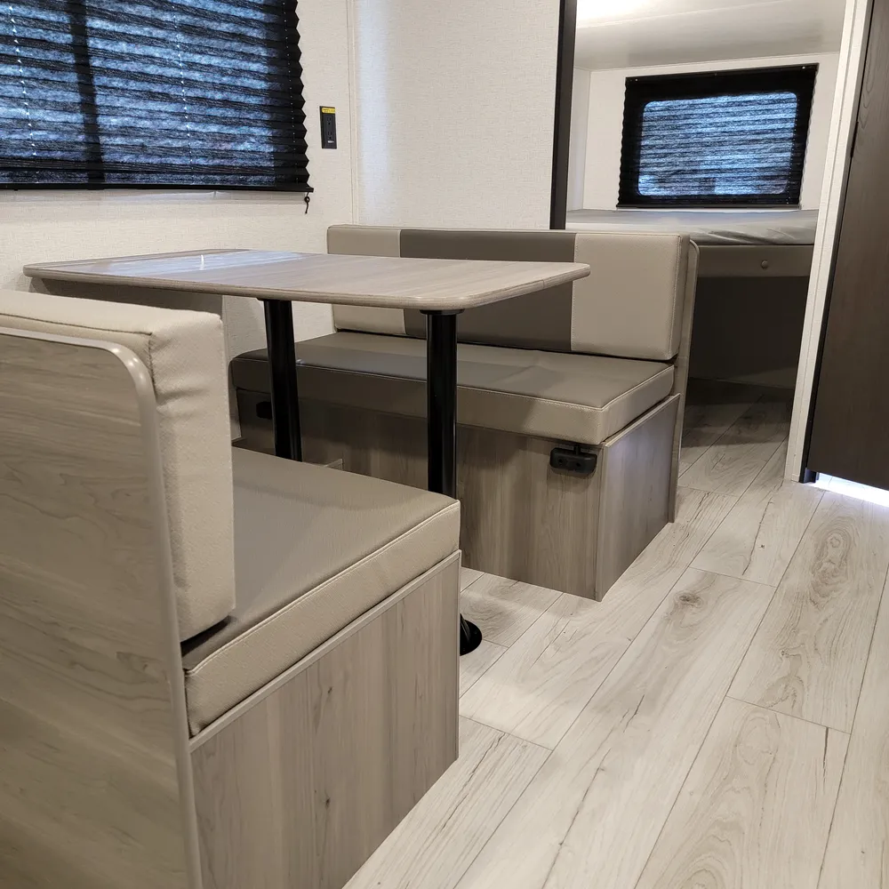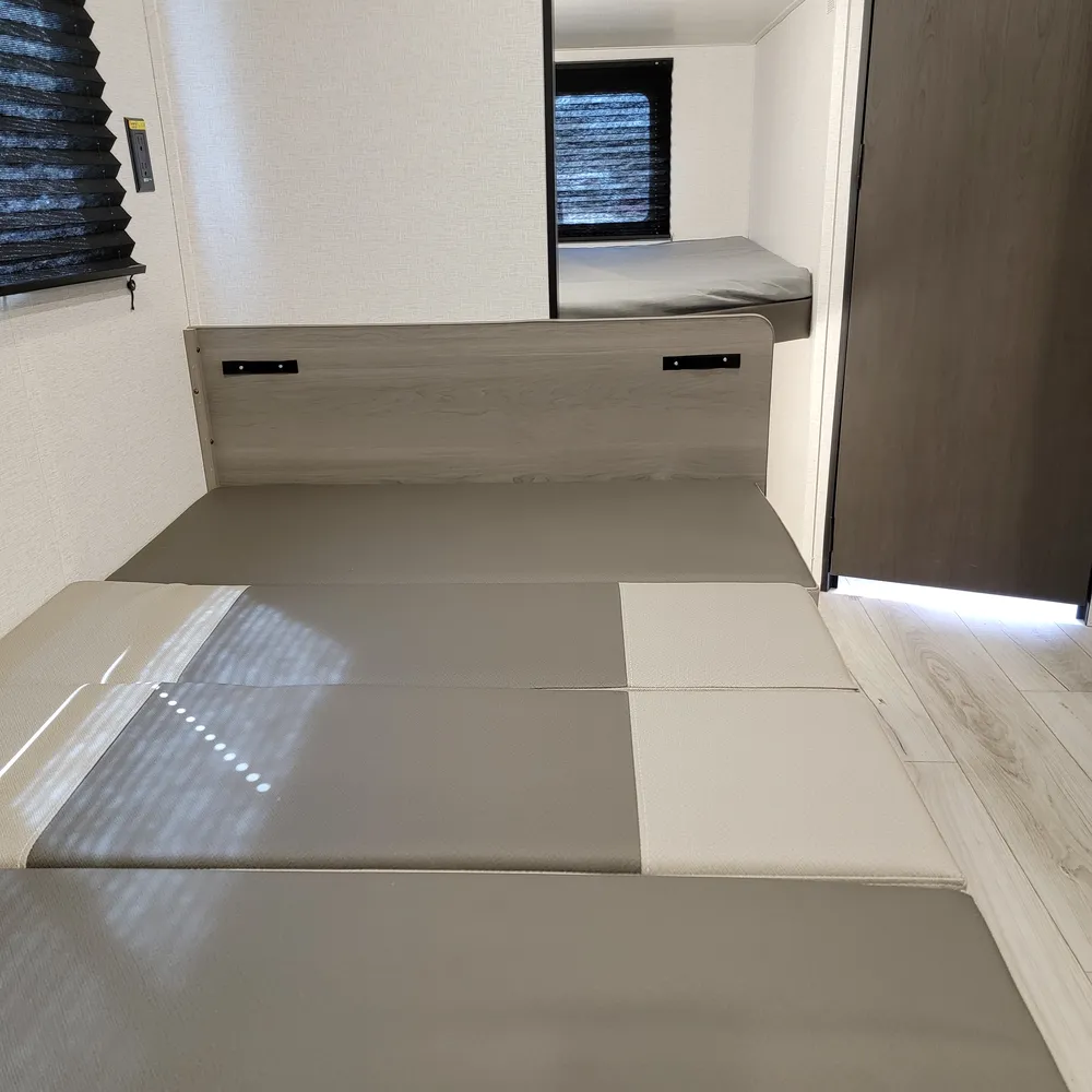 The 2025 Hideout 230MBBH is a single-axle travel trailer from Keystone RV, offering a compact and versatile floorplan designed for smaller trucks or SUVs. It features a Murphy bed, booth dinette, kitchen, and a full bath, along with double-size bunks.