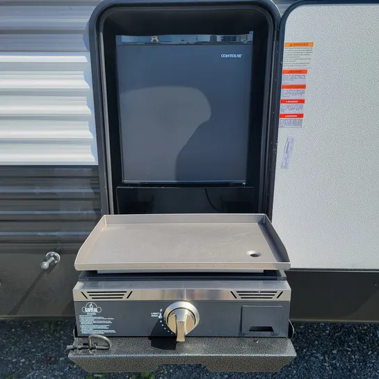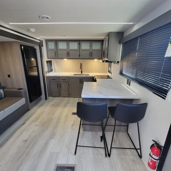 The 2025 Keystone RV Hideout 24FKS is a travel trailer with a queen bed slide-out for more floor space, a walk-through bath, and a spacious linen closet. It features an outdoor kitchen under an 18-foot power awning and a front kitchen with a counter and two chairs for dining. The trailer also includes a tri-fold sofa, ample counter space, and a desk with a chair in the rear bedroom.