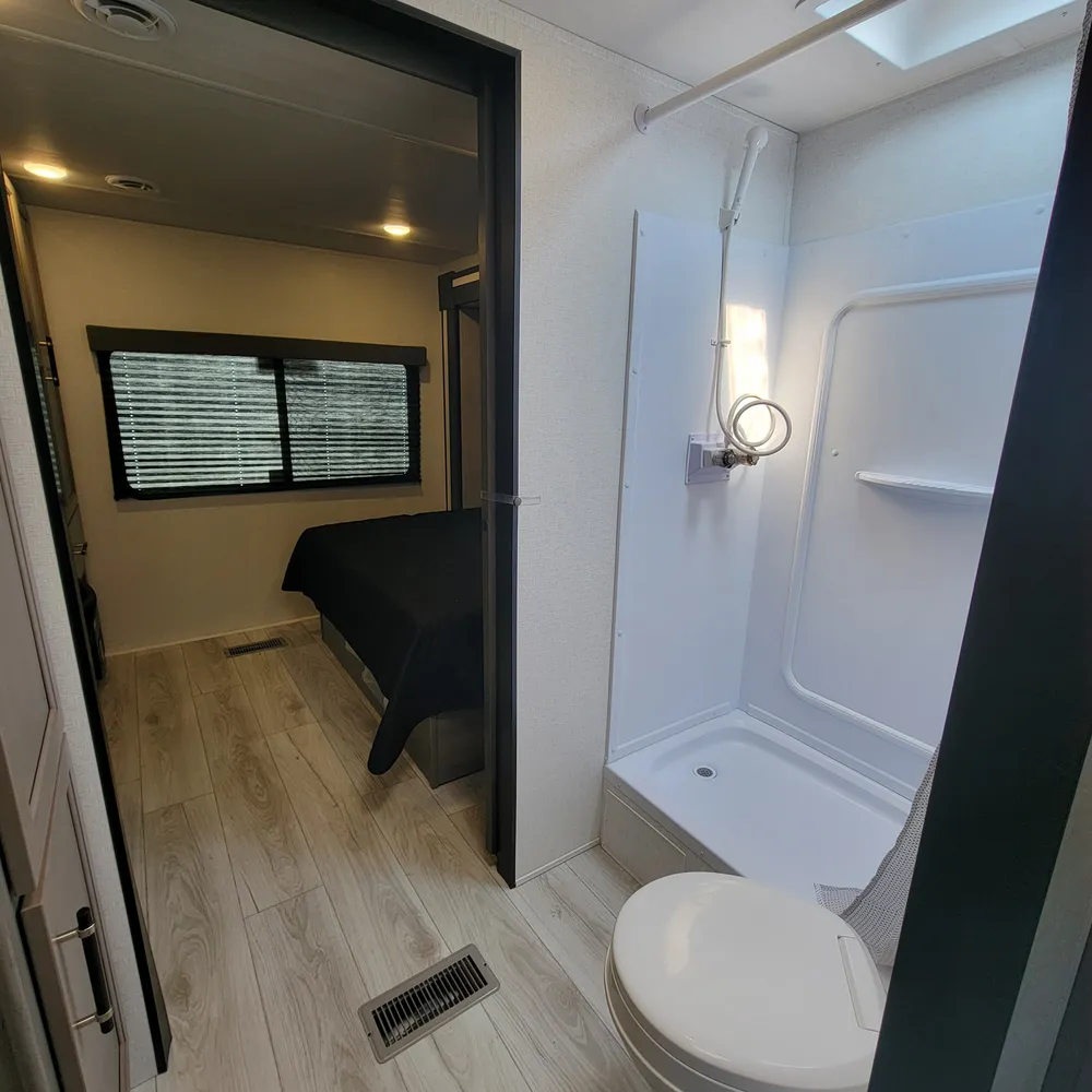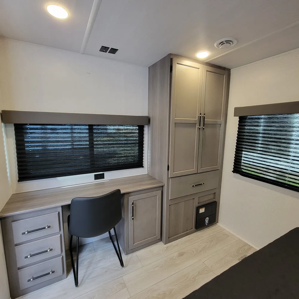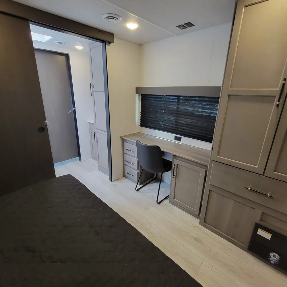 The rear bedroom has its own slideout with a queen bed and a desk with chair. The walk-through bathroom sits mid-coach between the kitchen and bedroom with a toilet, shower, sink, linen closet, and medicine cabinet.