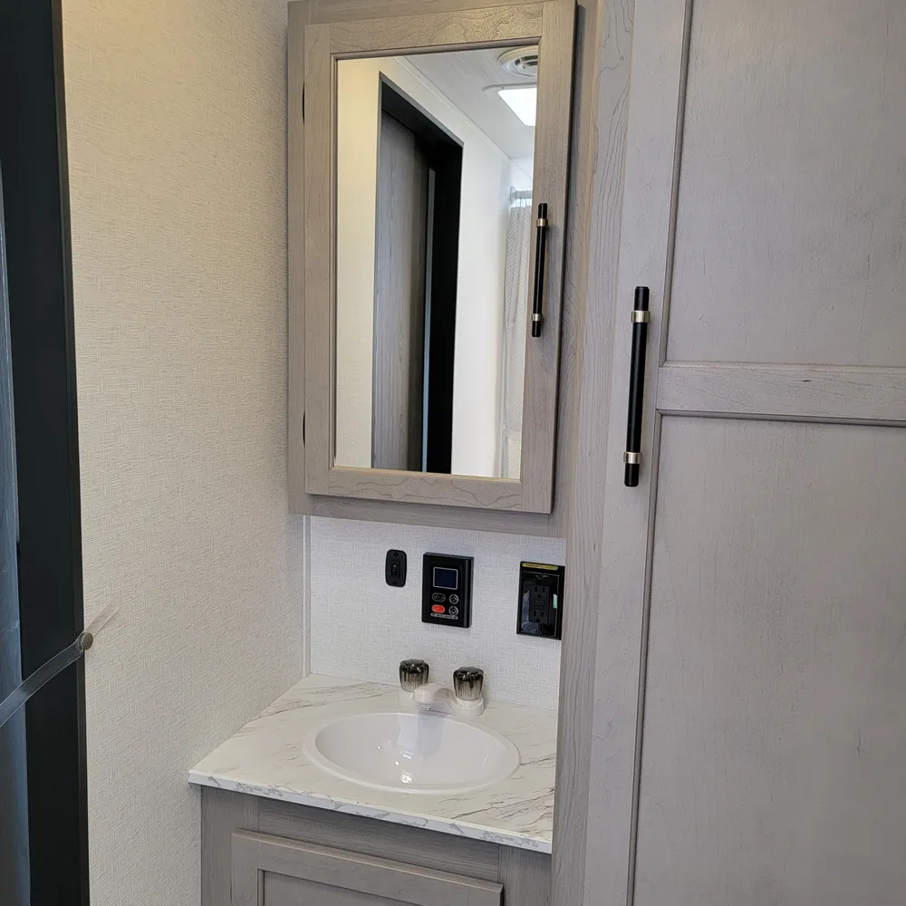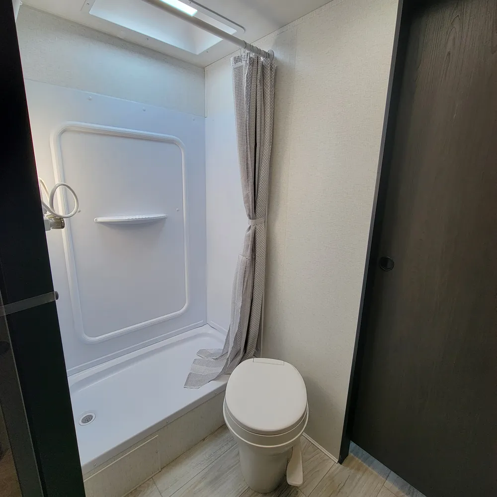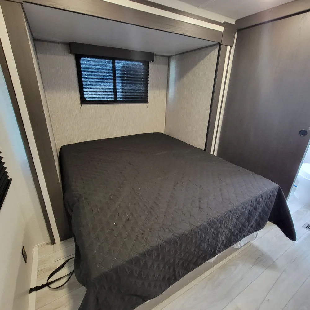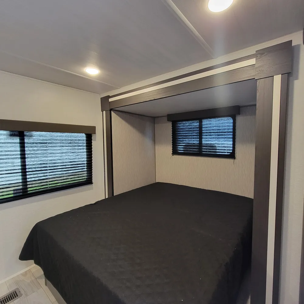 The rear bedroom has its own slideout with a queen bed and a desk with chair. The walk-through bathroom sits mid-coach between the kitchen and bedroom with a toilet, shower, sink, linen closet, and medicine cabinet.