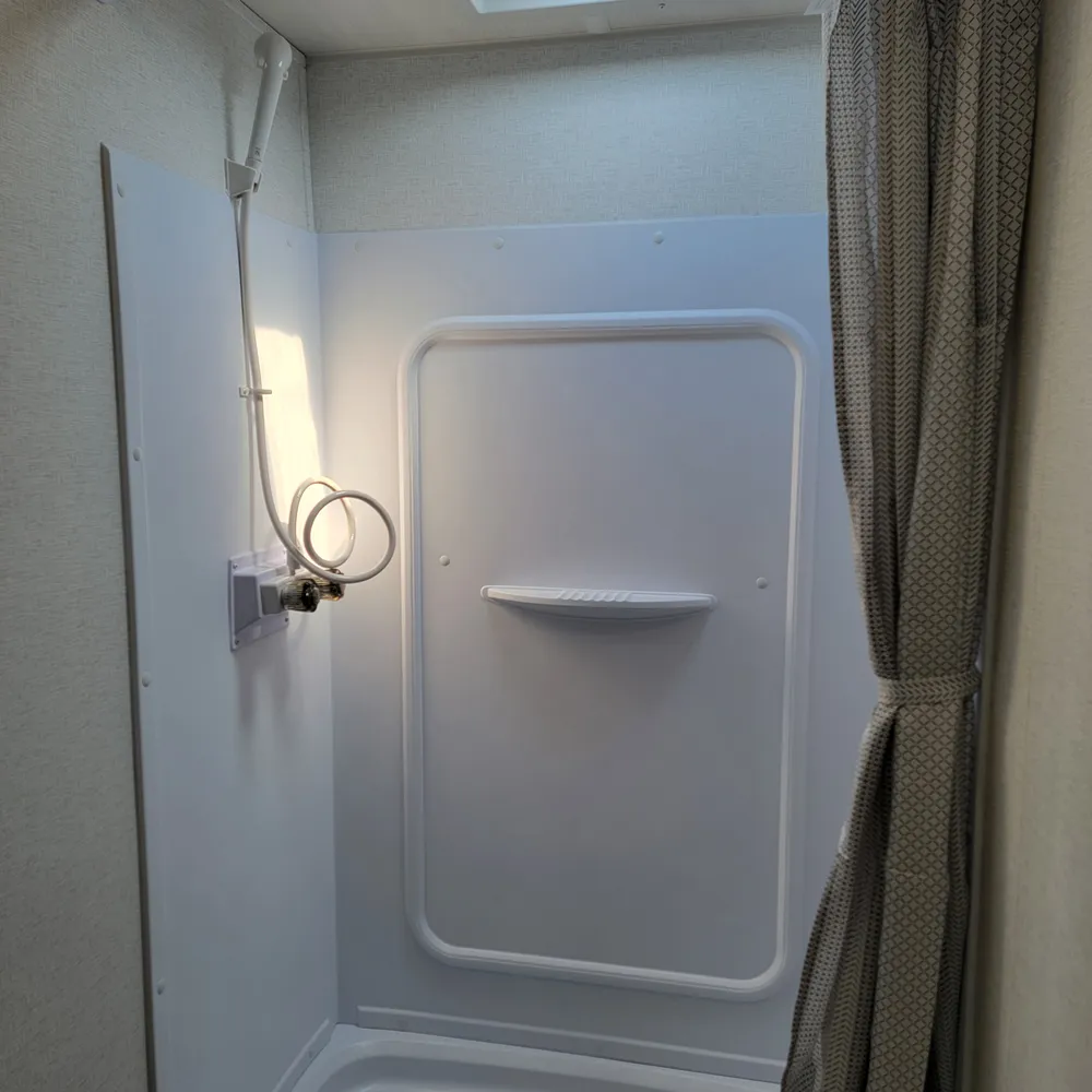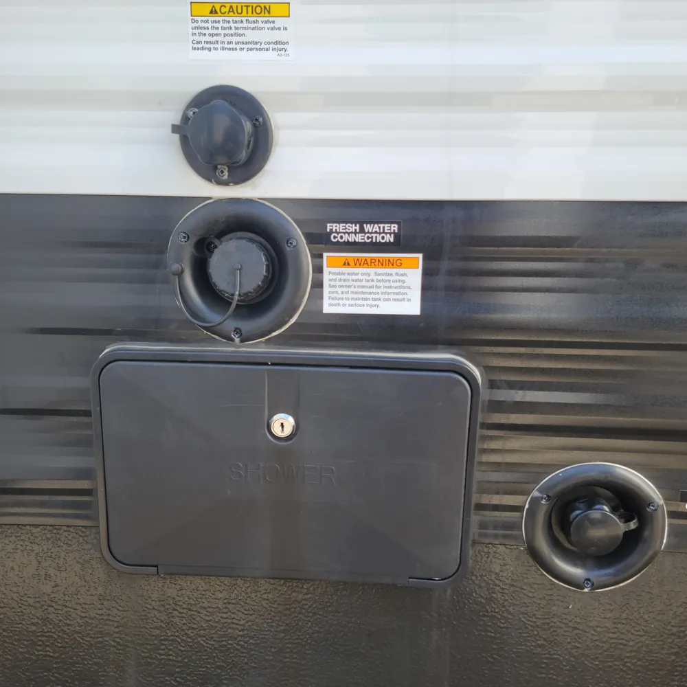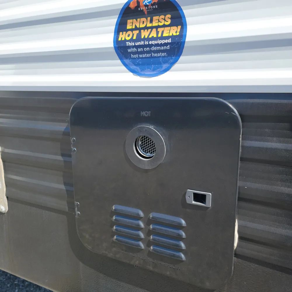 Equipped for the camping season with a 15,000 BTU air conditioner and 30,000 BTU furnace. A tankless water heater, power tongue jack, and in-floor heating ducts are all standard on the Hideout 24FKS.