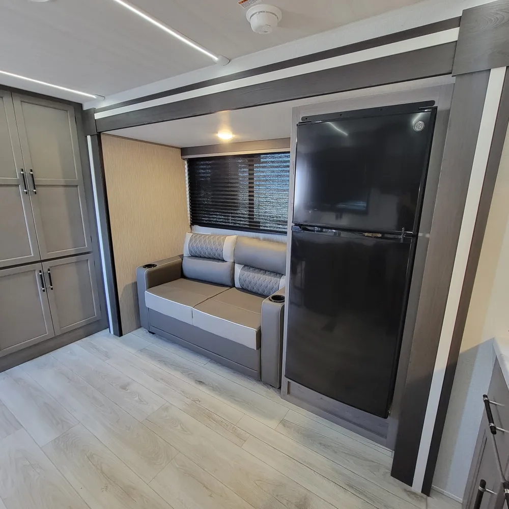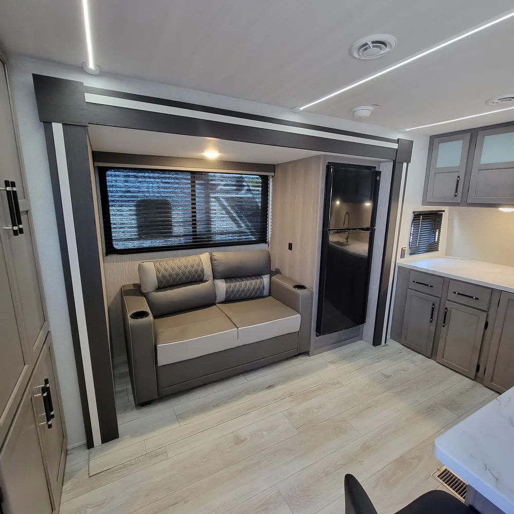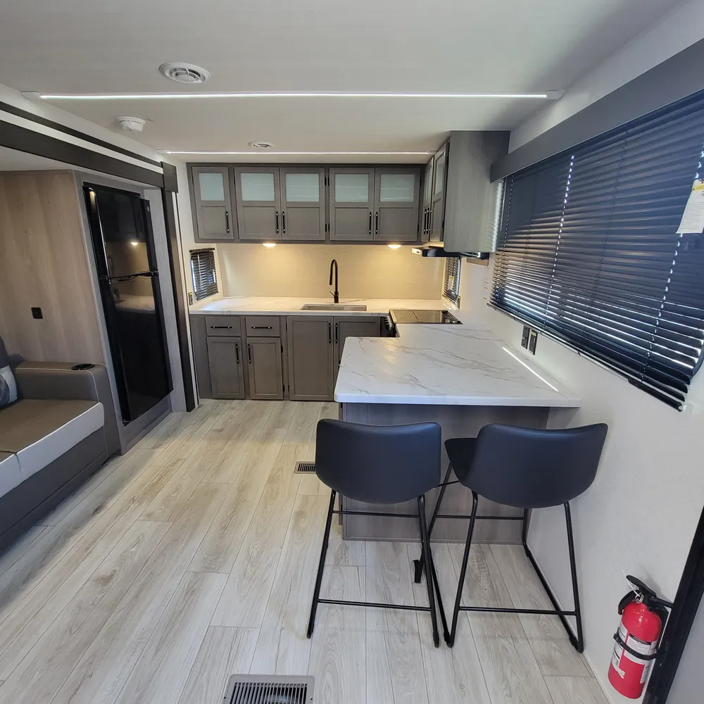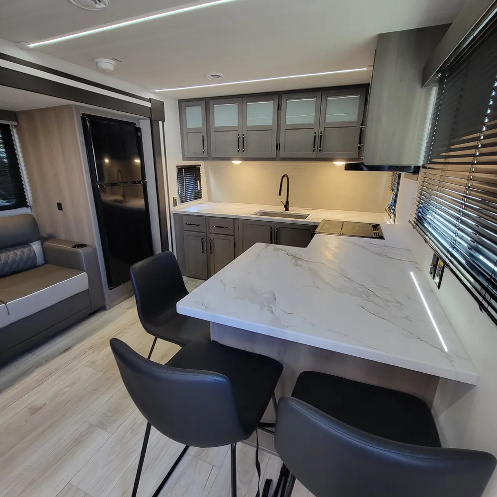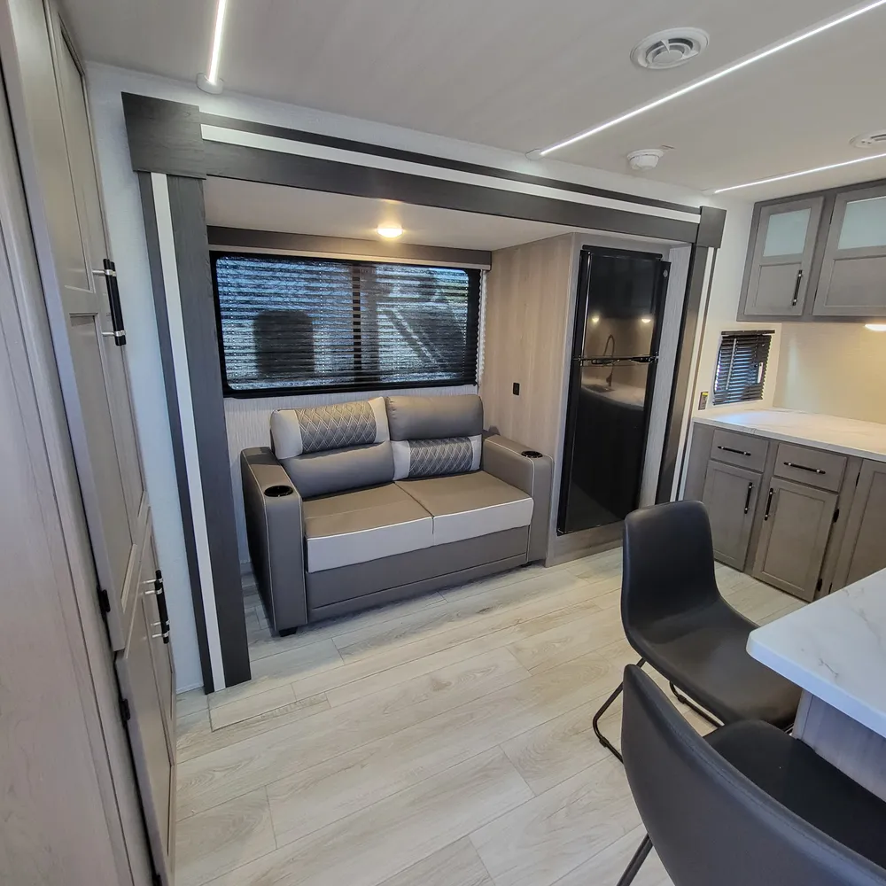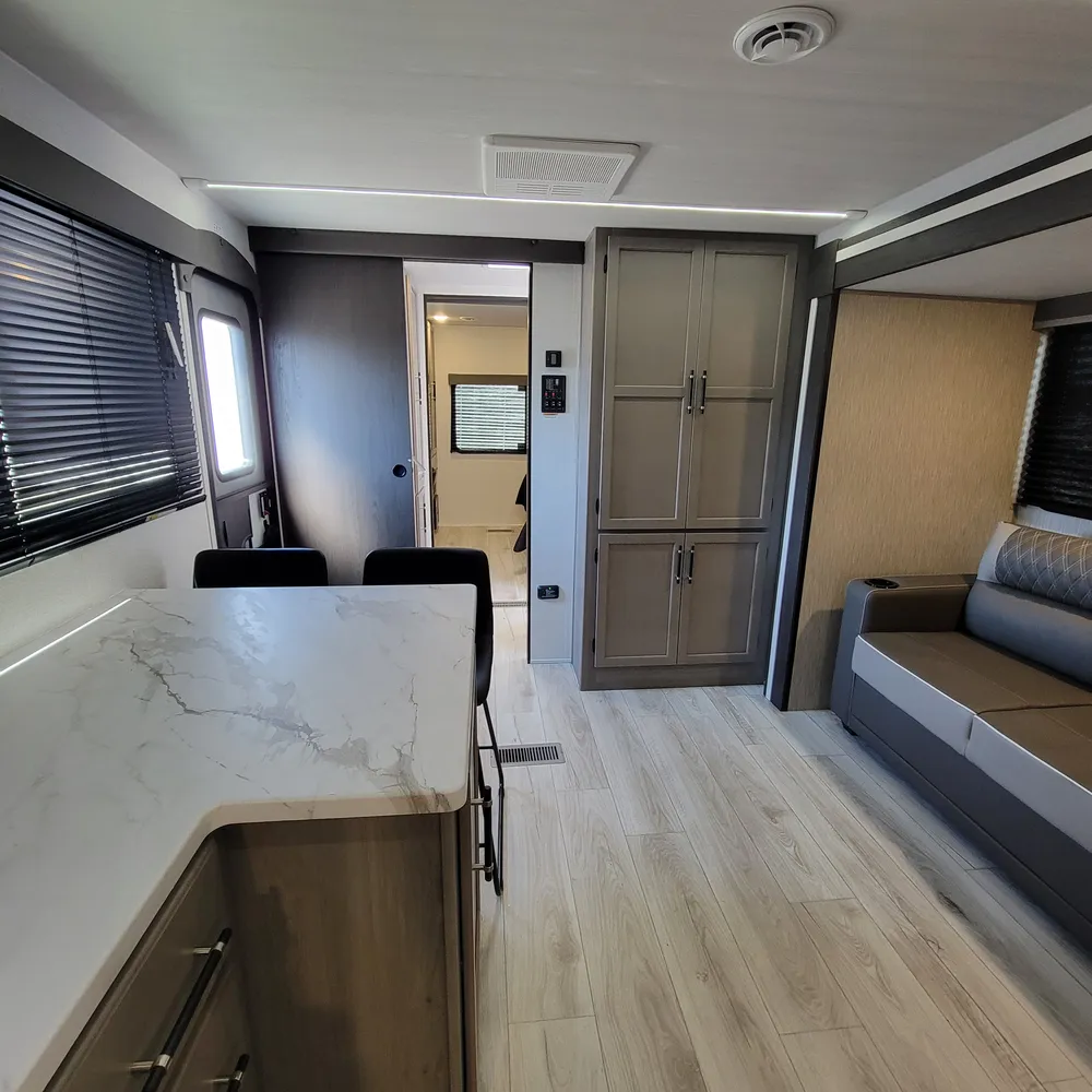 The 24FKS is a unique floorplan with the kitchen up front and the bedroom at the rear. The front slideout expands the kitchen area and brings out a tri-fold sofa and a counter with two chairs. The kitchen features good counter space and pantry storage. The 18′ power awning extends outdoor living space at the campsite.